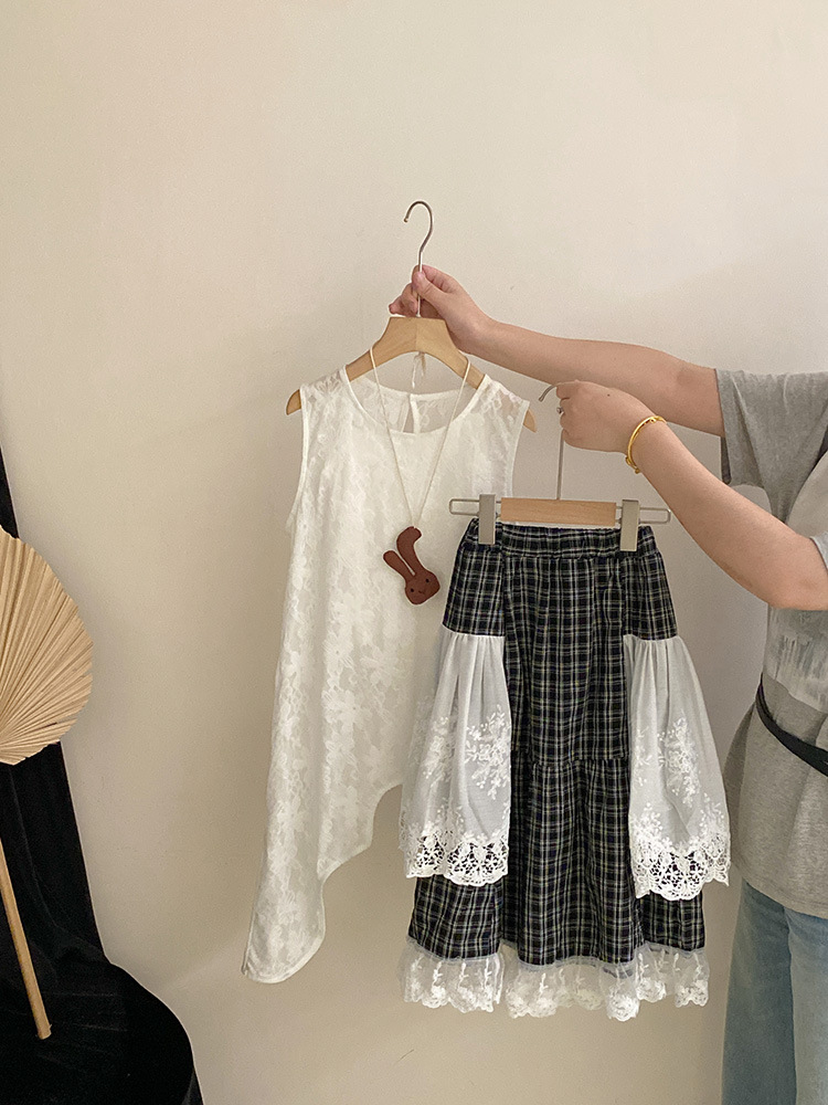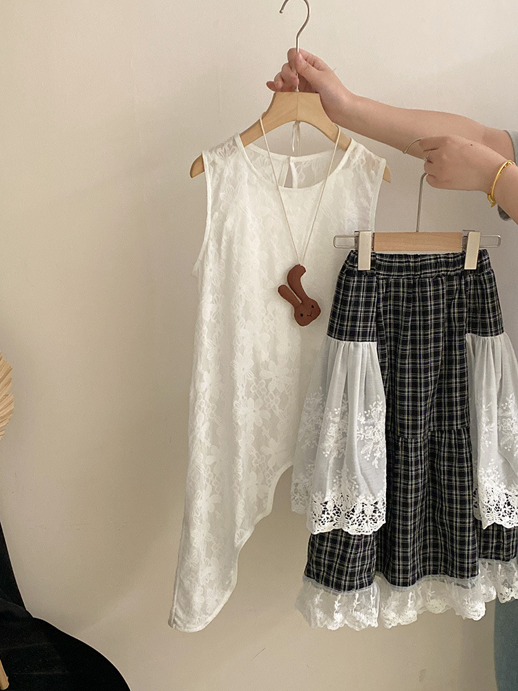 여자 2025 새로운 디자인 불규칙한 레이스 블라우스 스커트 흑백 격자 무늬 스커트 유행 투피스 세트