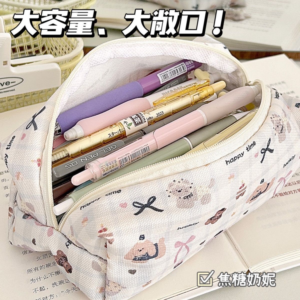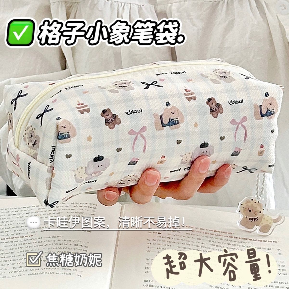 만화 격자 무늬 코끼리 연필 가방, 귀여운 대용량 인쇄 연필 가방, 학생 문구 보관 가방, 고급 문구 상자스토어 가기