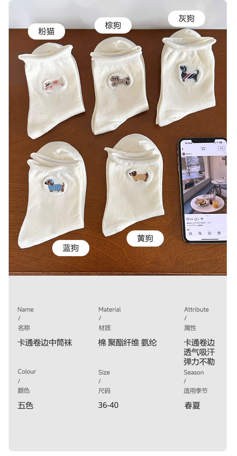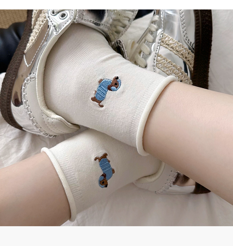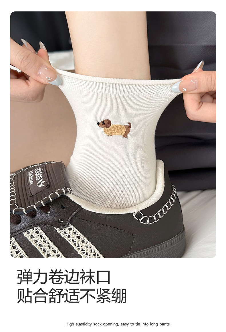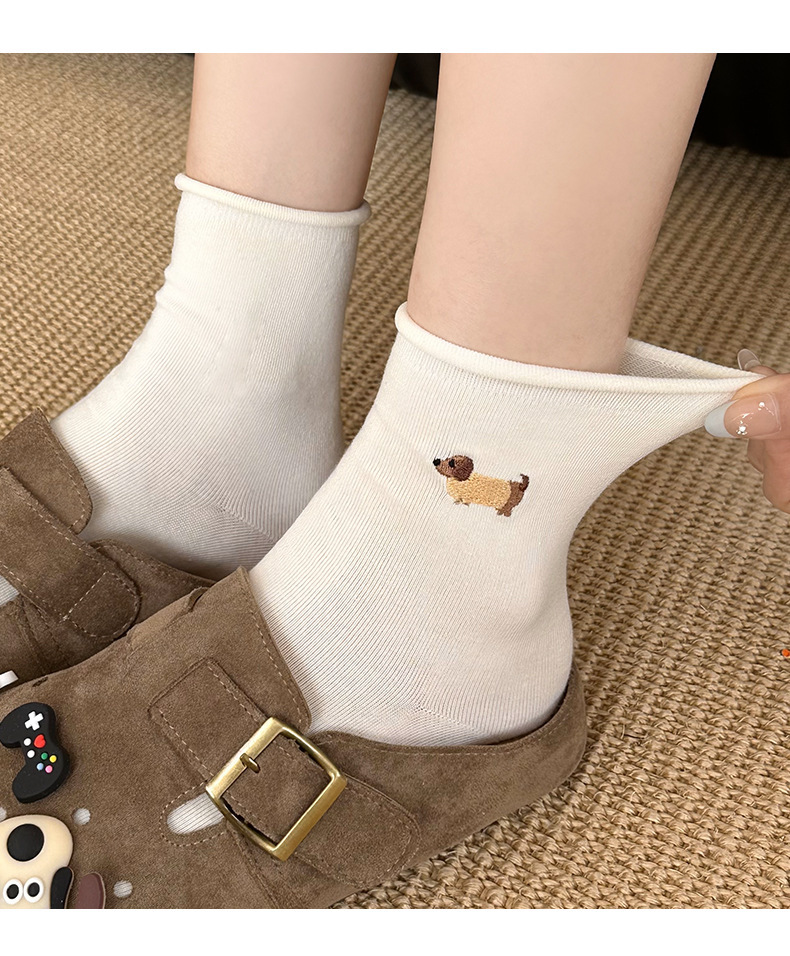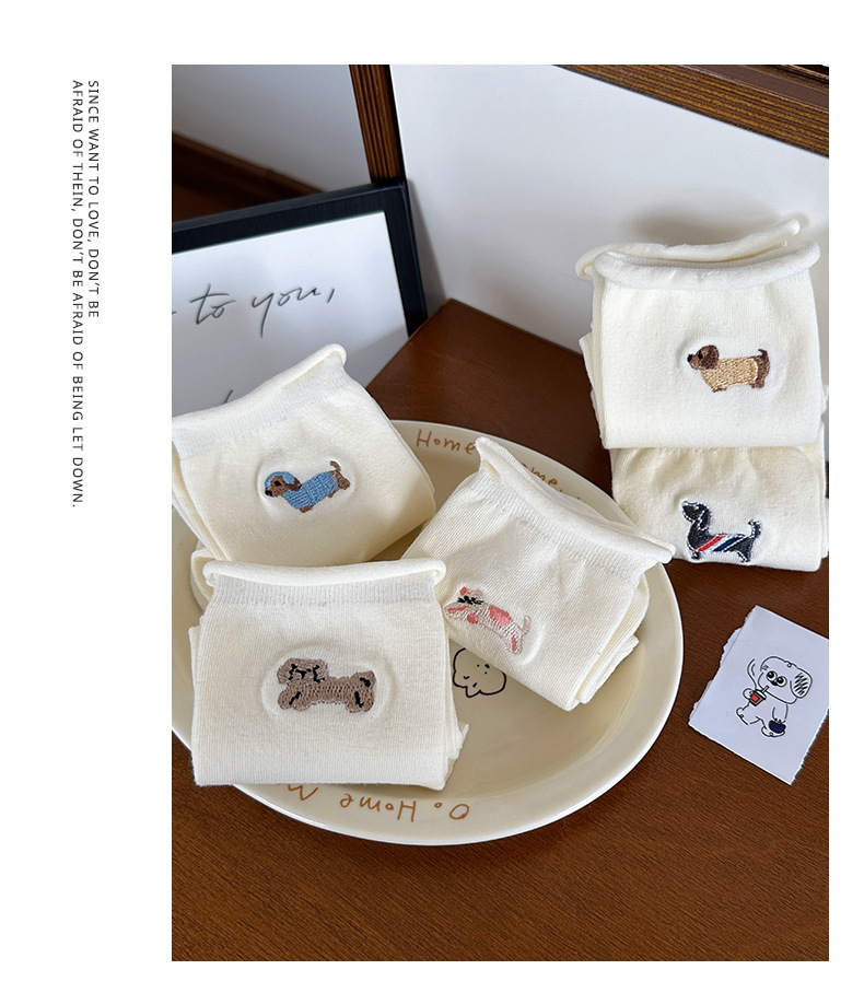 여성용 여름 양말, 자수 강아지 중목 양말, 일본식 얕은 입구 미끄럼 방지 통기성 다용도 얇은 귀여운 짧은 양말