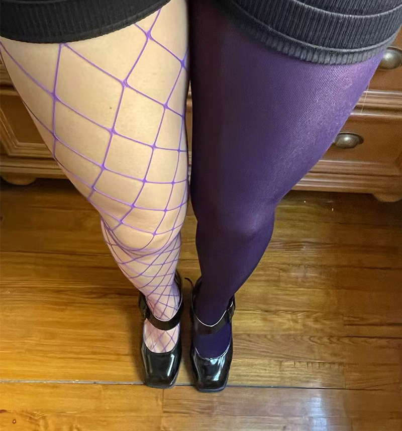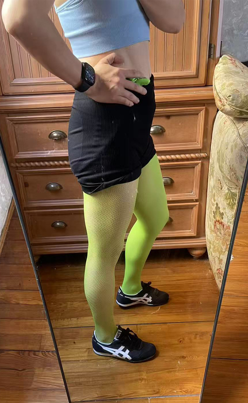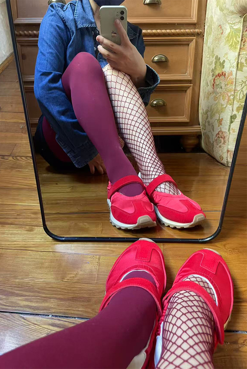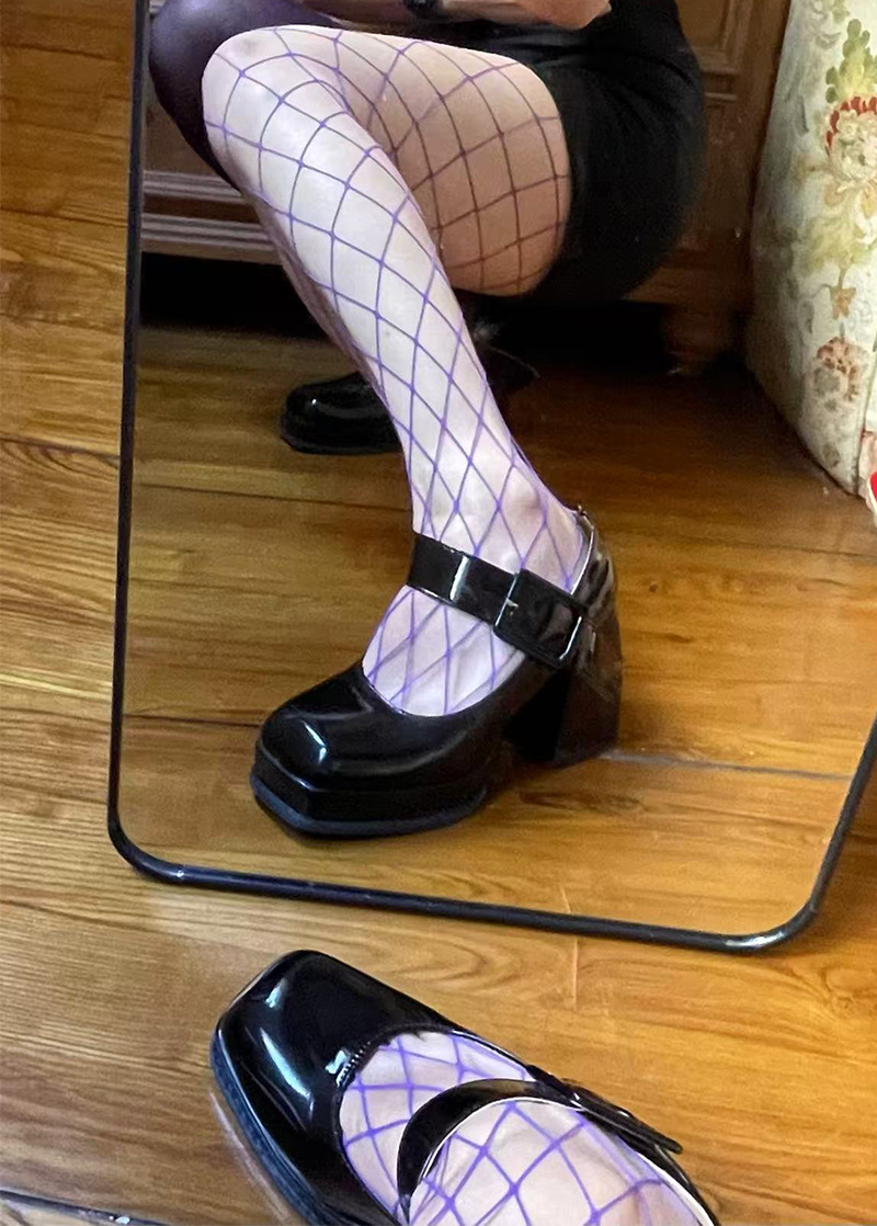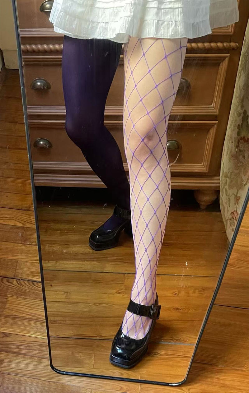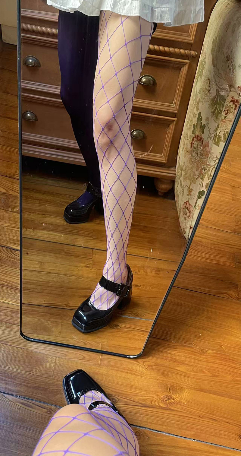 一条腿采用“个性镂空网袜”,演绎不羁的性感与酷感;另一条腿则选用“细腻微透的天鹅绒丝袜”,尽显朦胧柔美的优雅气质。一袜双面,左右风格随心切换,瞬间成为吸睛焦点。