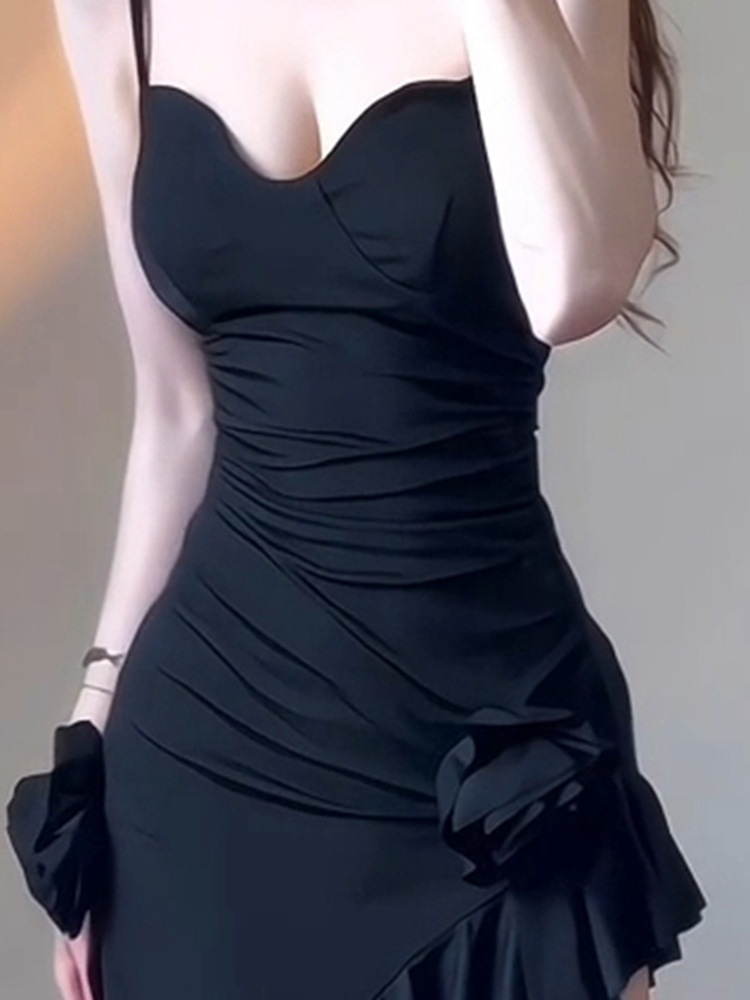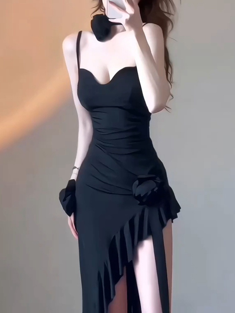 2024 여성용 프렌치 퓨어 러스티 러플 블랙 서스펜더 드레스, 불규칙한 슬릿 힙 스커트스토어 가기