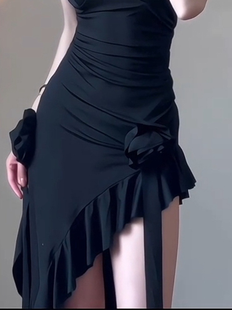 2024 여성용 프렌치 퓨어 러스티 러플 블랙 서스펜더 드레스, 불규칙한 슬릿 힙 스커트