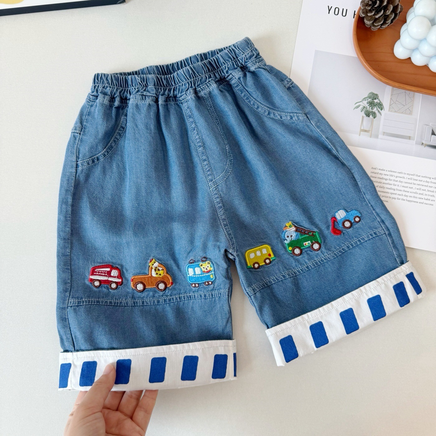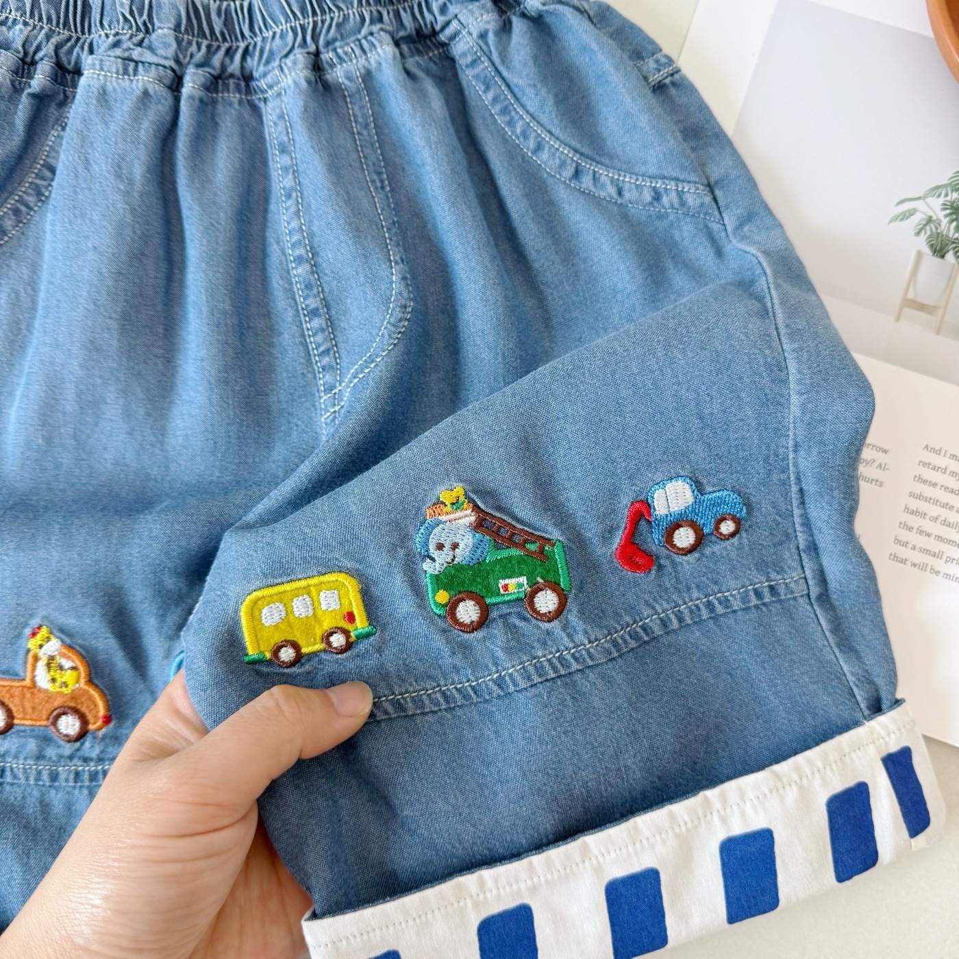 아동용 5부 바지 2025 여름 일본 소년 자수 자동차 텐셀 면 바지 아기 5부 바지 도매