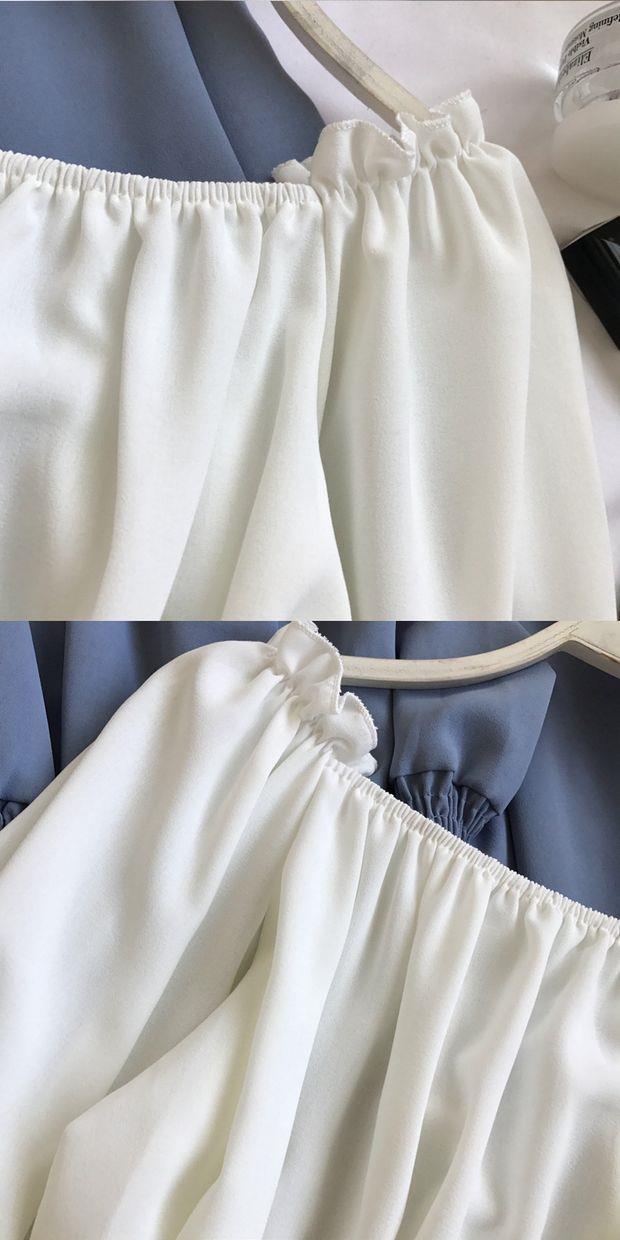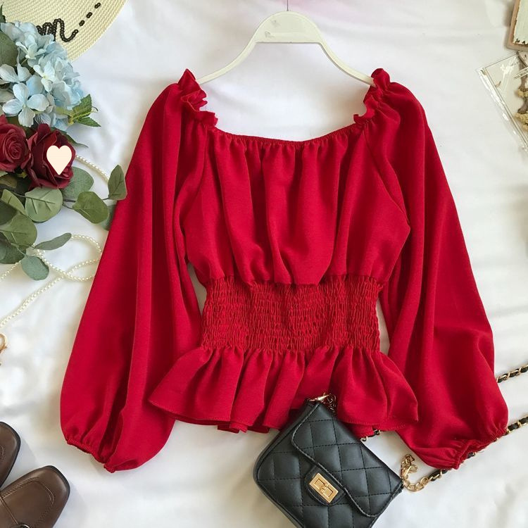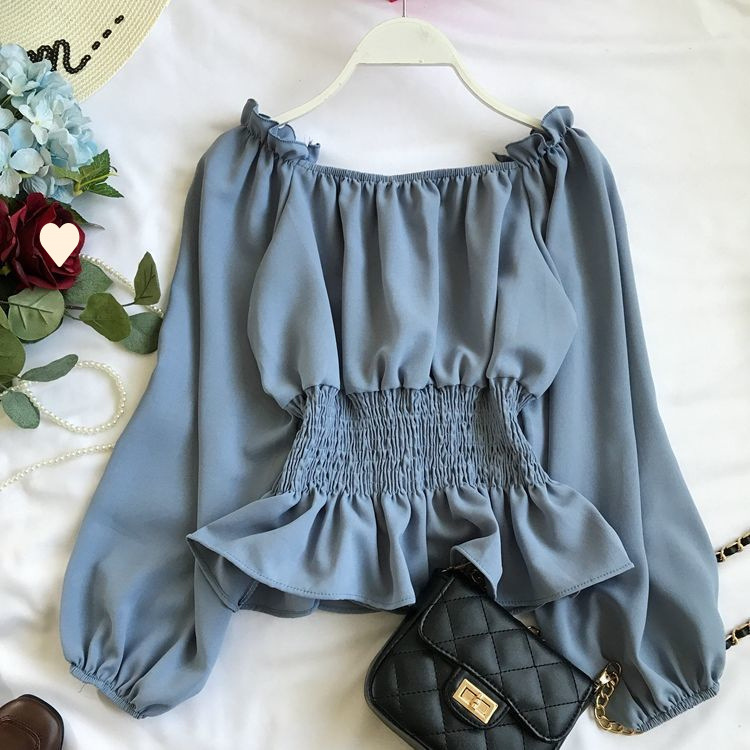여성용 원 숄더 오프 숄더 쉬폰 셔츠 봄, 가을 새로운 한국식 긴팔 탑 허리 러플 셔츠 짧은 스트레이트 스타일스토어 가기