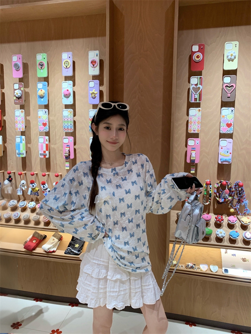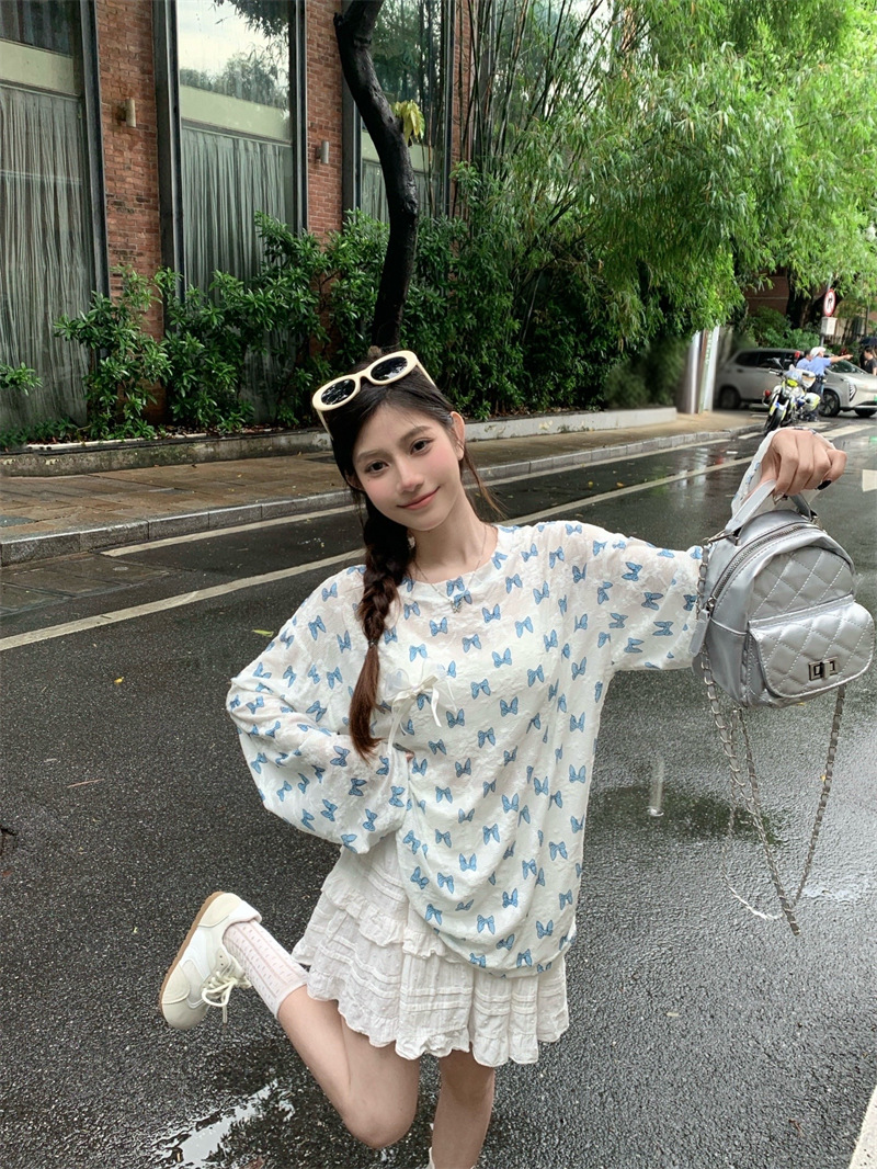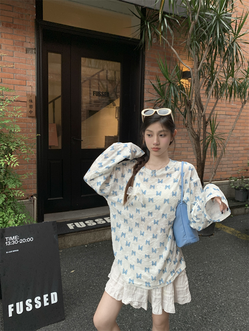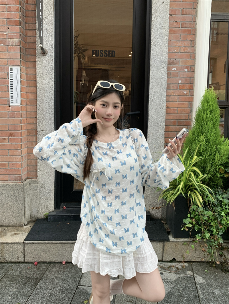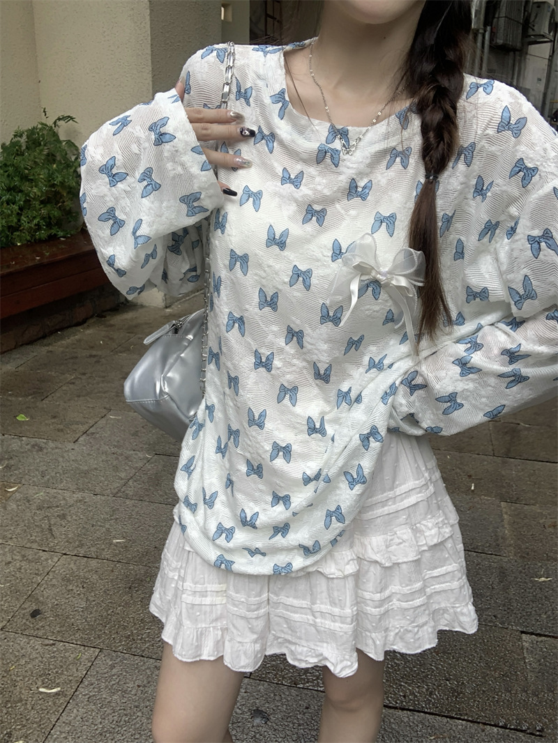 여성을위한 달콤한 나비 넥타이 얇은 긴팔 태양 보호 의류 2025 여름 새로운 캐주얼 루즈 라운드 넥 에어컨 블라우스스토어 가기