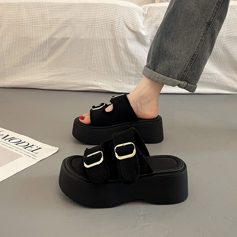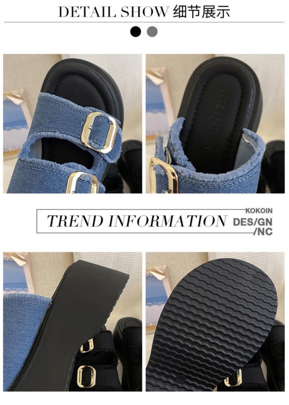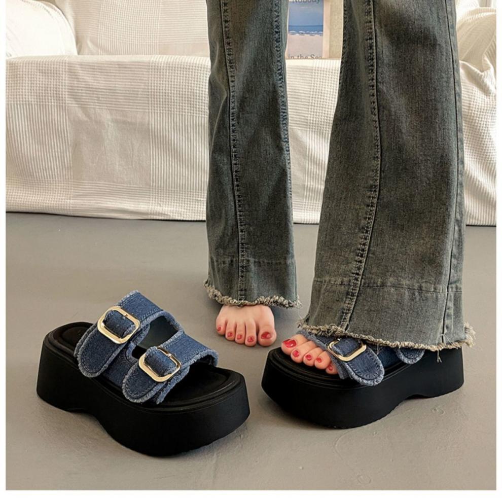 2025 여름 여성용 두꺼운 밑창 샌들, 키높이 데님 소재, 해외 인기 상품, 캐주얼 라운드 토, 뒤쪽 끈 샌들, 비치 샌들스토어 가기