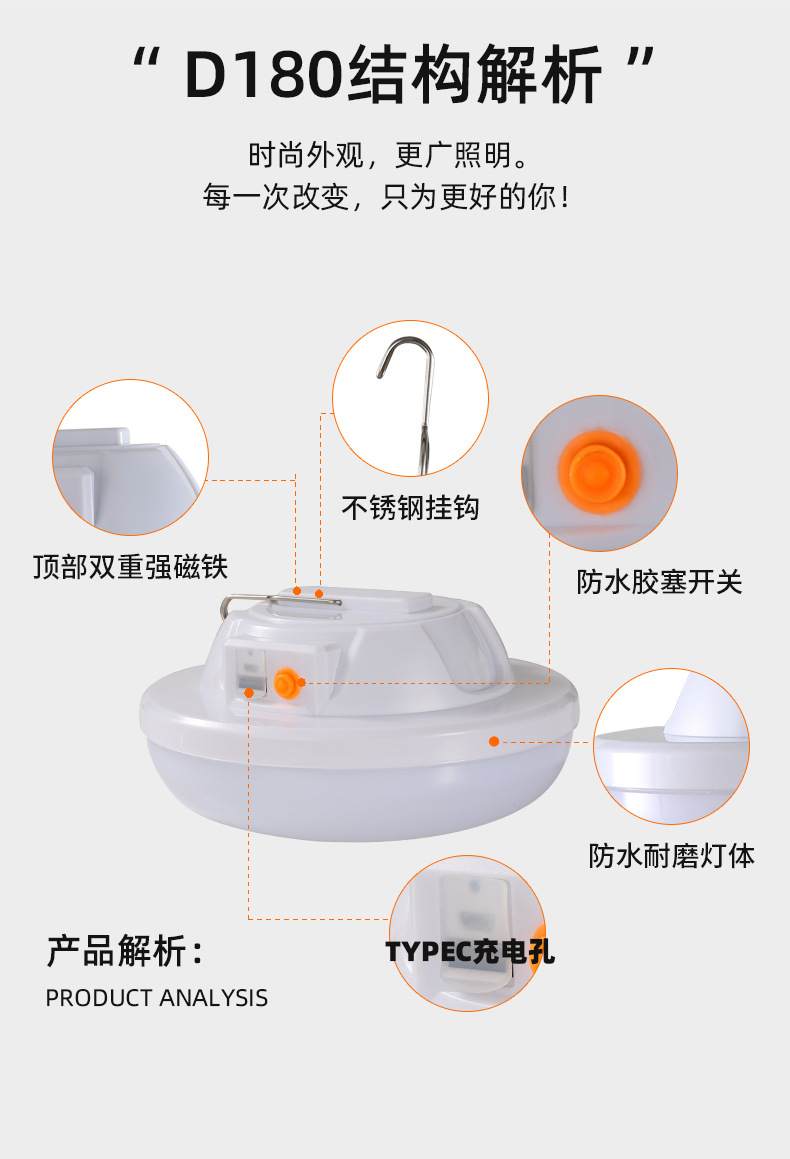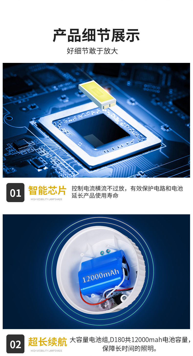 • 초대형 D180A 흰색과 노란색 따뜻한 3색 조명 12000mAh + 자기 흡입 + 배터리 수명 10-80H