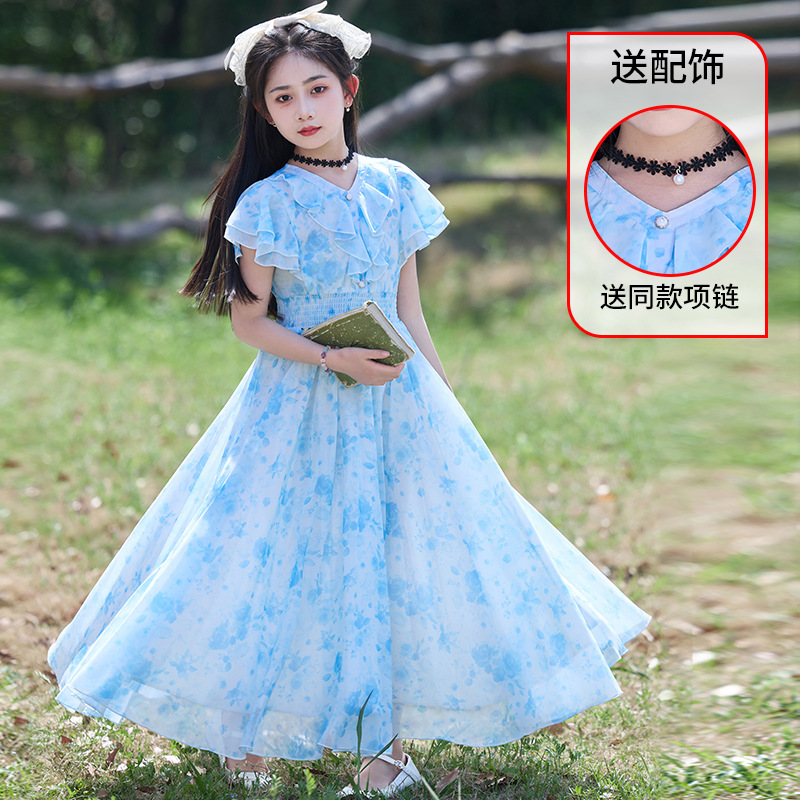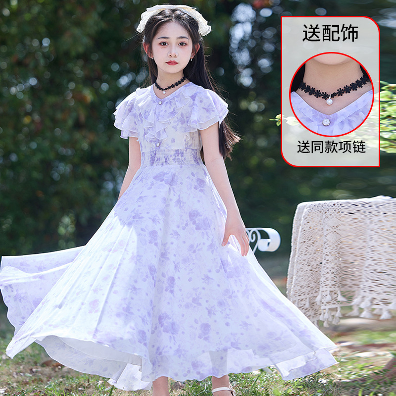 여아 드레스 여름 보라색 쉬폰 꽃무늬 스커트 큰 어린이 여름 얇은 스타일 어린 소녀 해변 롱 스커트