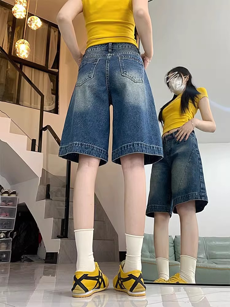 플러스 사이즈 5부 팬츠 데님 반바지 여성 여름 뚱뚱한 mm 하이 웨이스트 5부 팬츠 루즈한 디자인 스트레이트 와이드 레그 미드 팬츠스토어 가기