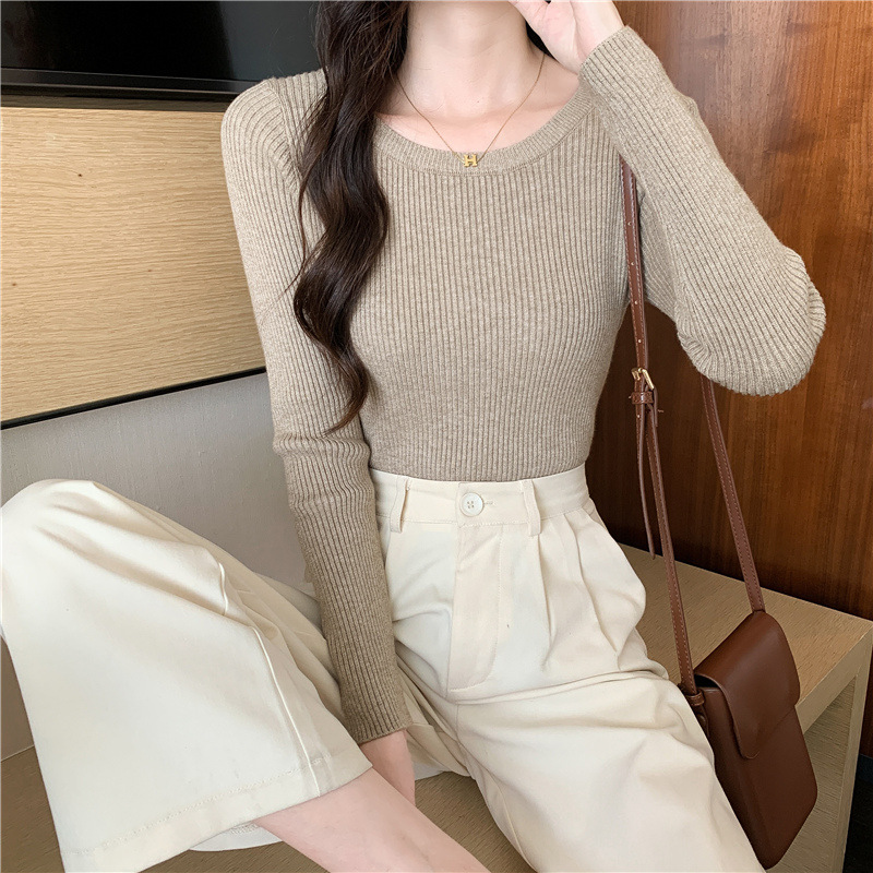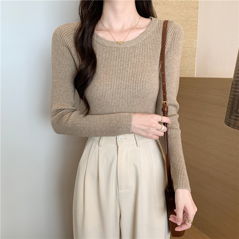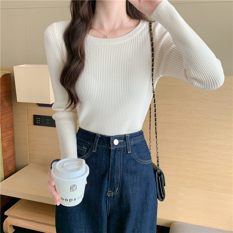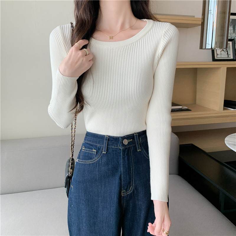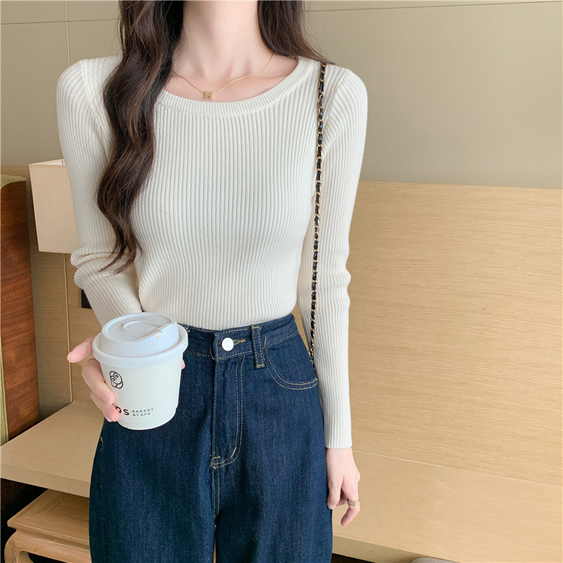 봄 여름 여성용 니트 베이스 레이어, 다재다능하고 스타일리시한 핑크 스웨터, 슬림 라운드 넥 긴팔 탑, 화이트