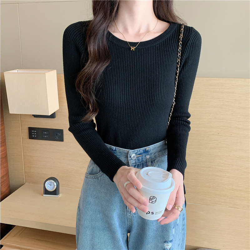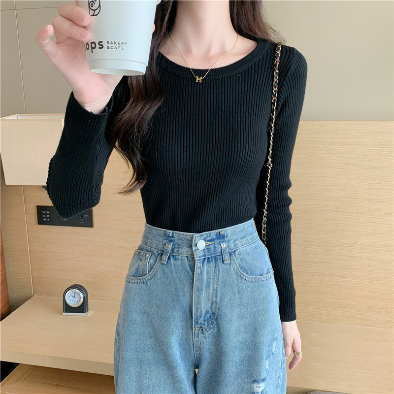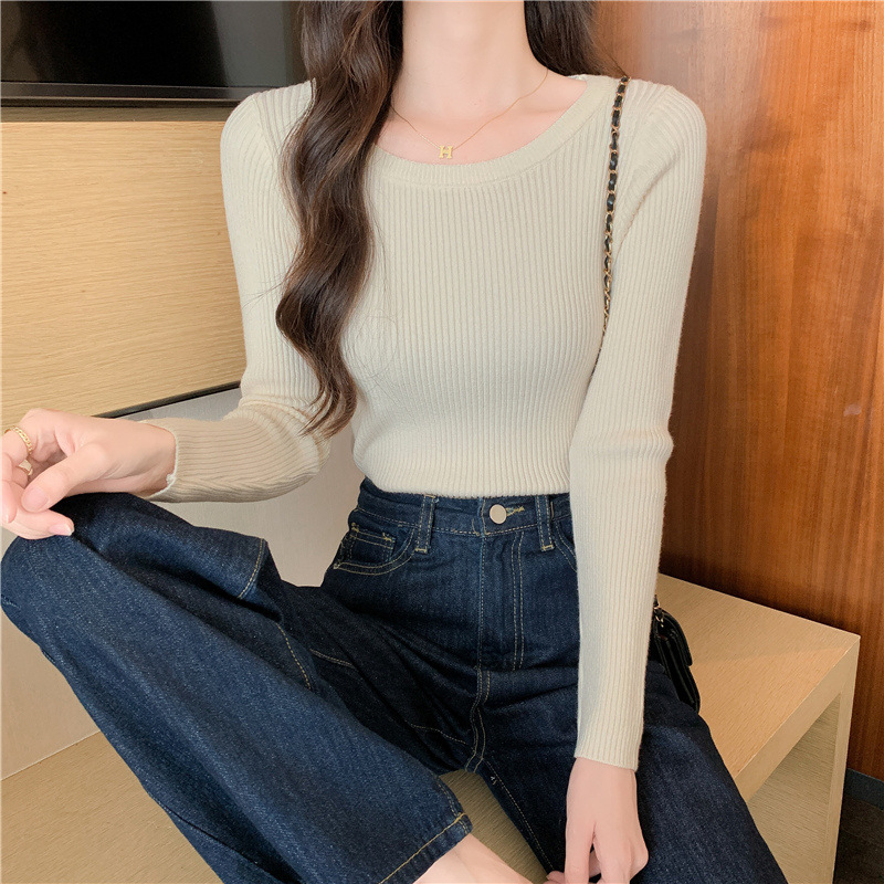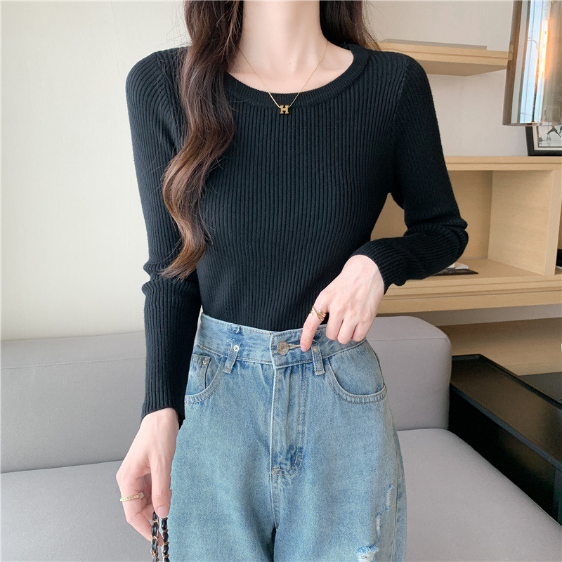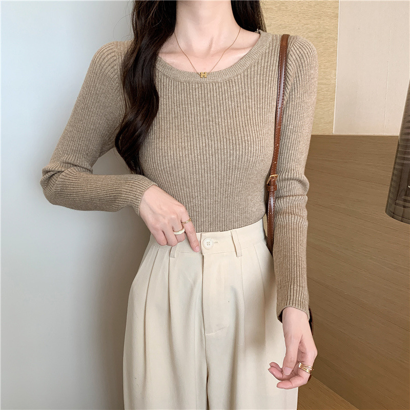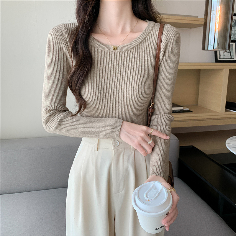 봄 여름 여성용 니트 베이스 레이어, 다재다능하고 스타일리시한 핑크 스웨터, 슬림 라운드 넥 긴팔 탑, 화이트
