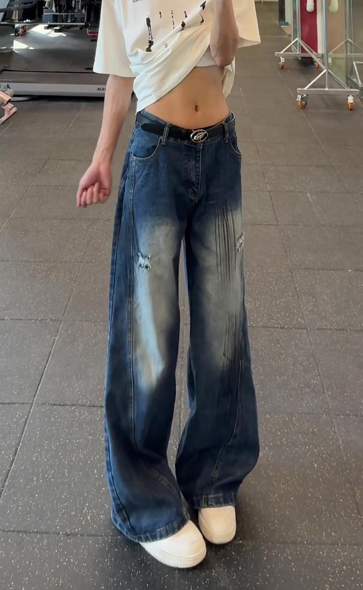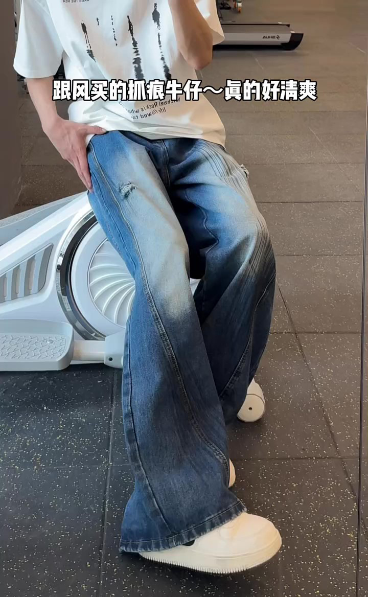 아메리칸 레트로 블루 워크 청바지 남성 여름 마이크로 플레어 바지 루즈 BF 레이지 스타일 와이드 레그 세이버 바지스토어 가기