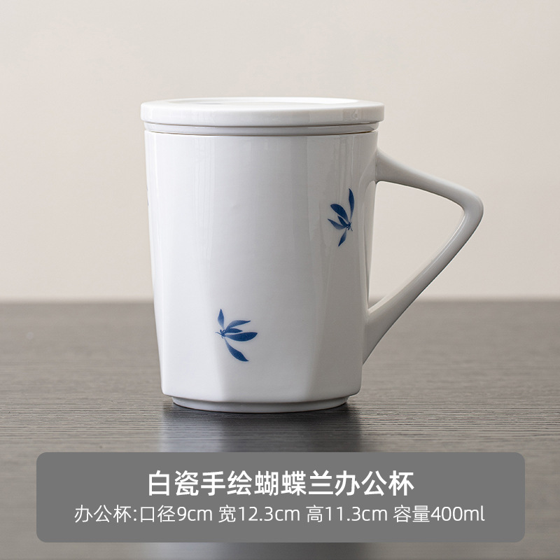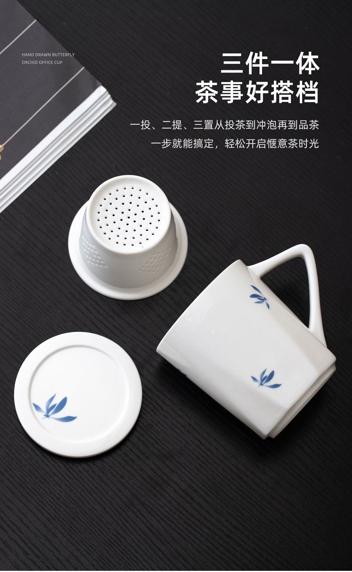 파란색과 흰색 나비 난초 세라믹 차 분리 컵 뚜껑이 있는 간단한 개인 필터링 홈 오피스 차 컵