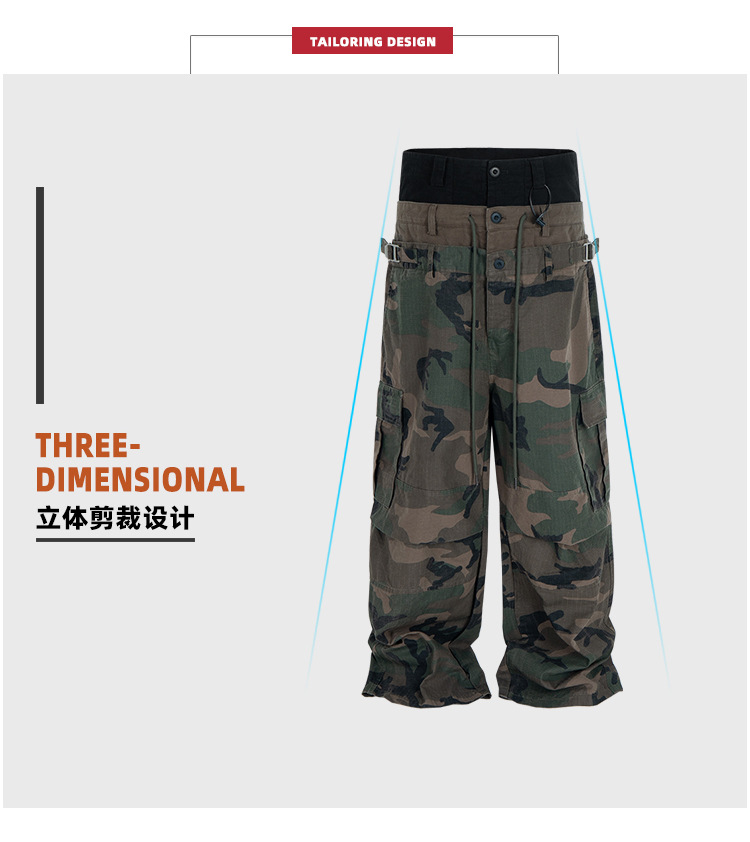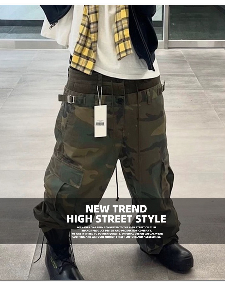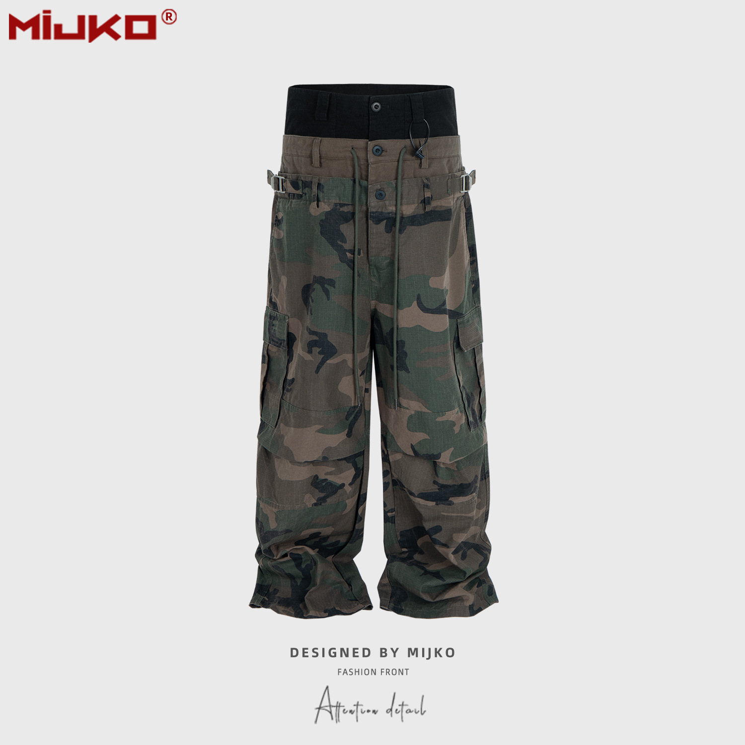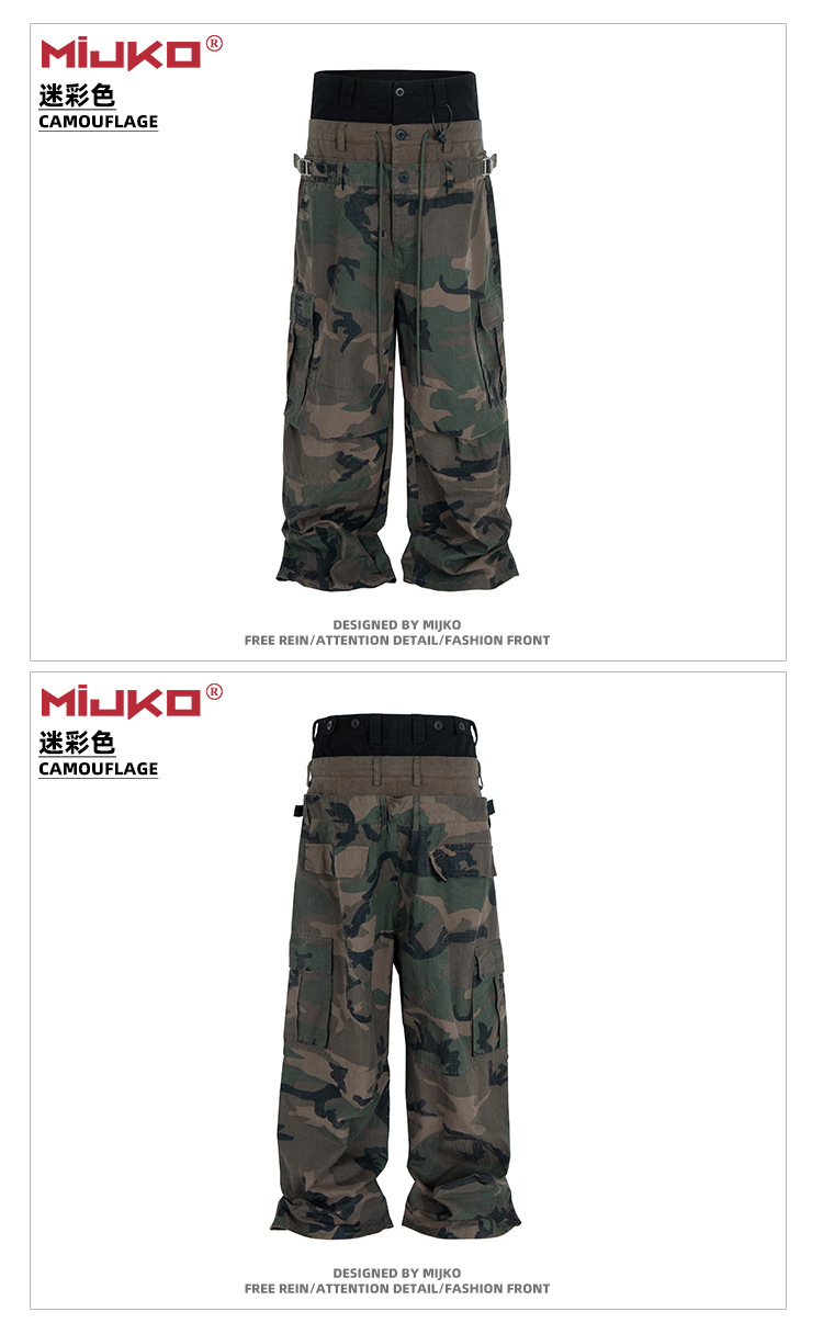 MIJKO 남성 및 여성 3개의 허리 스플라이싱 카모플라주 카고 바지 버튼 업 허리 디자인 캐주얼 스트레이트 바지 트렌디스토어 가기