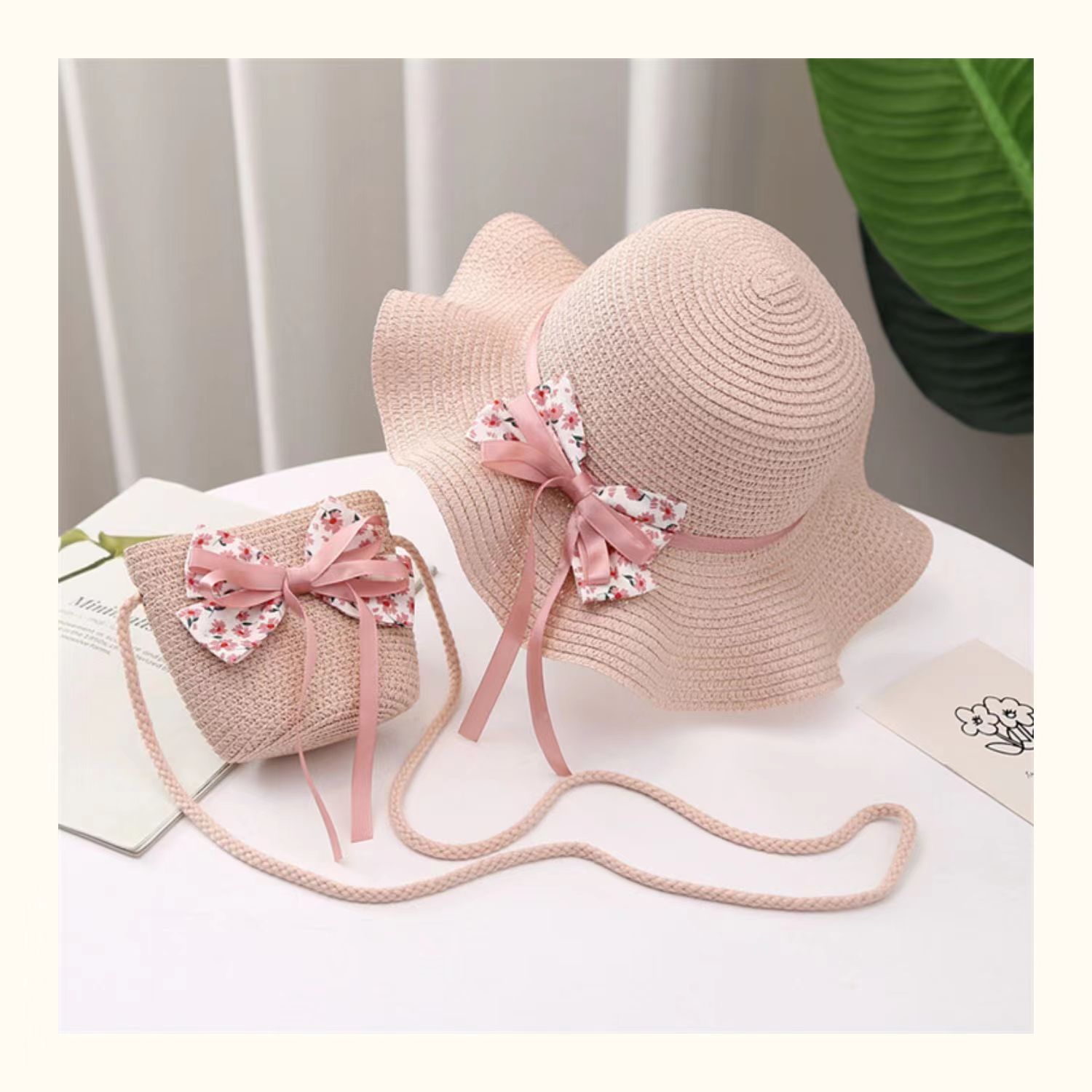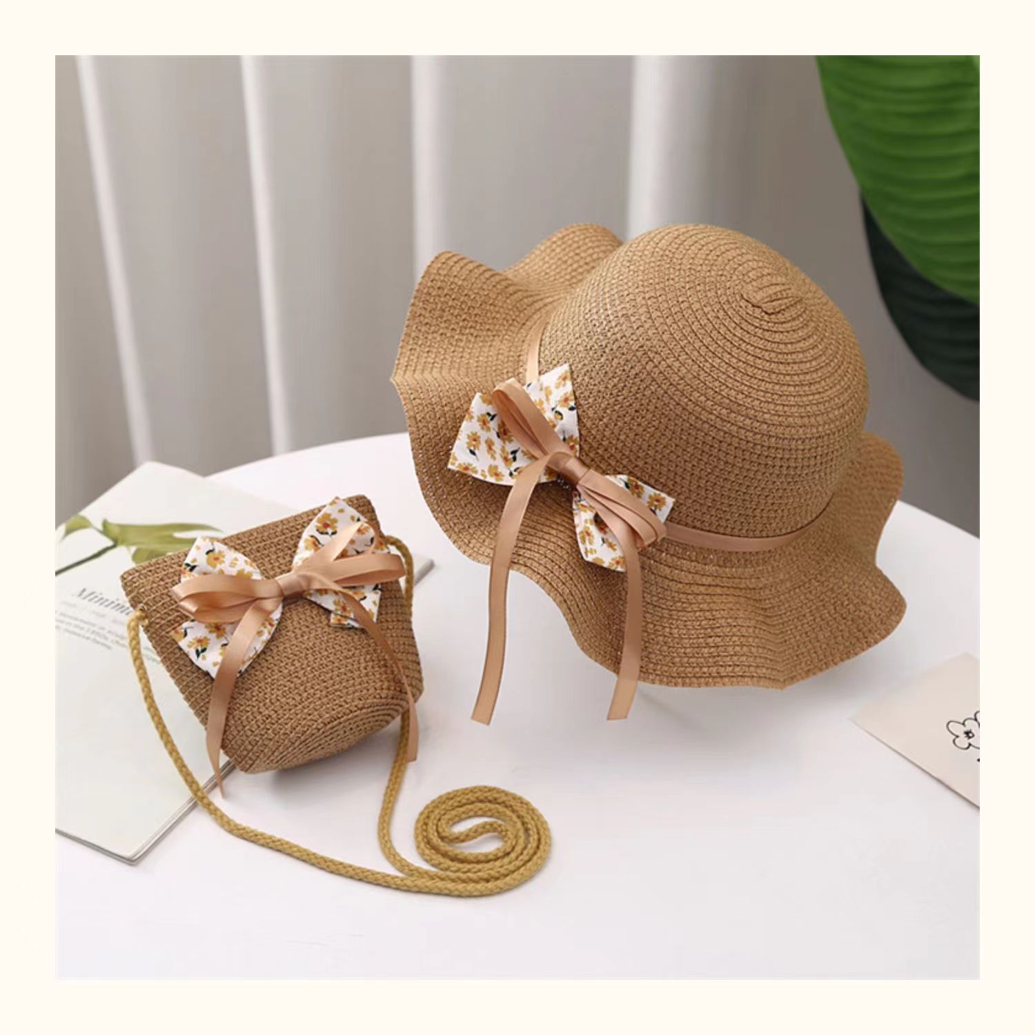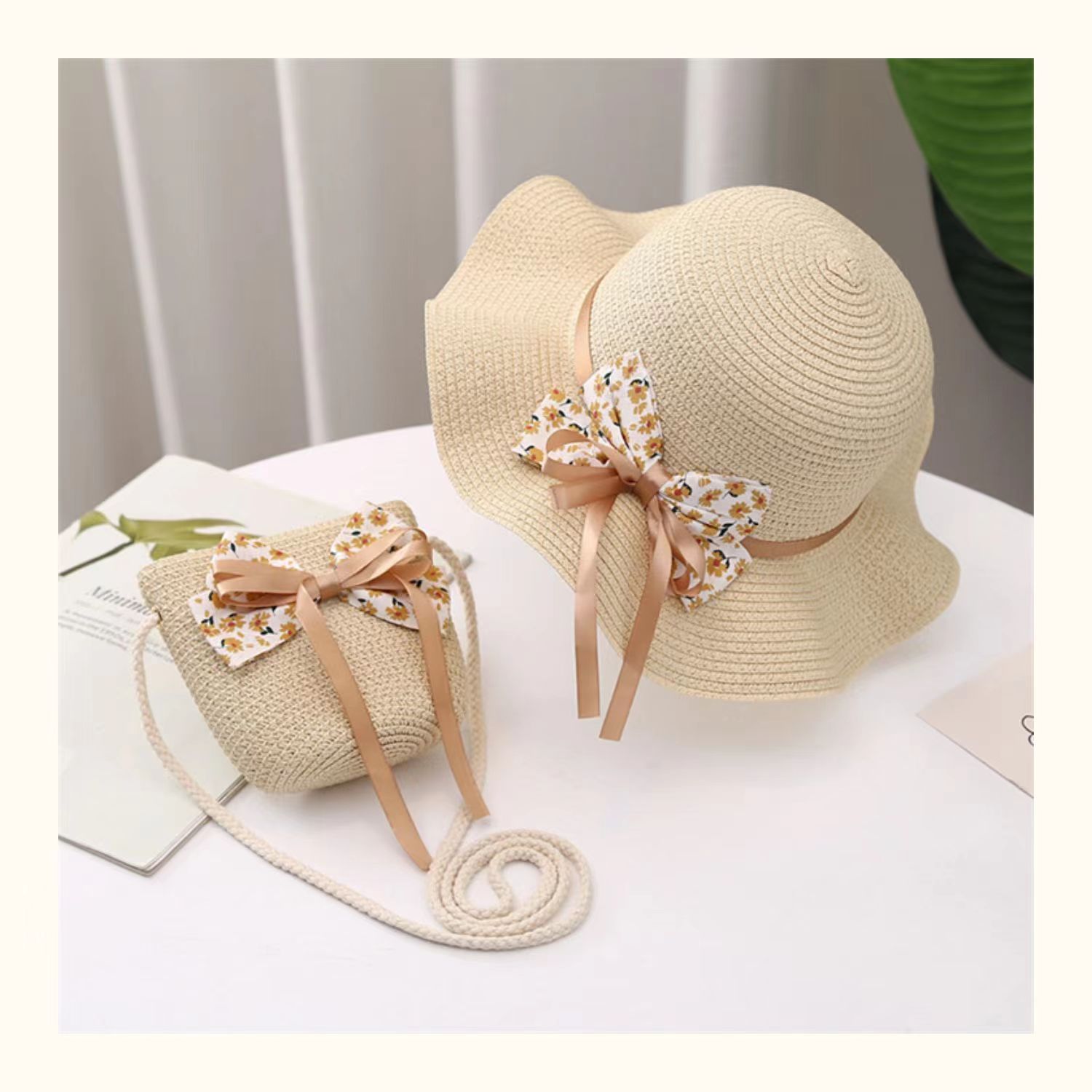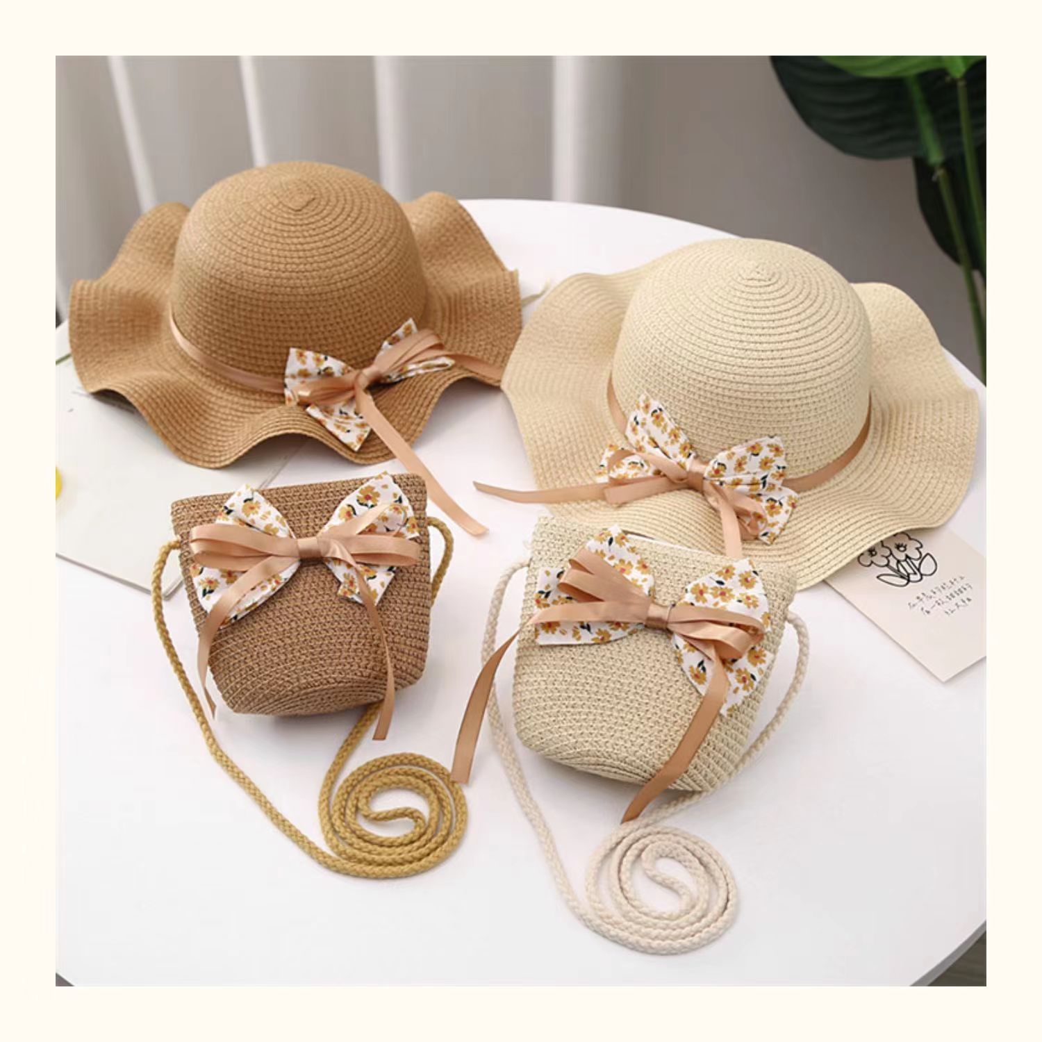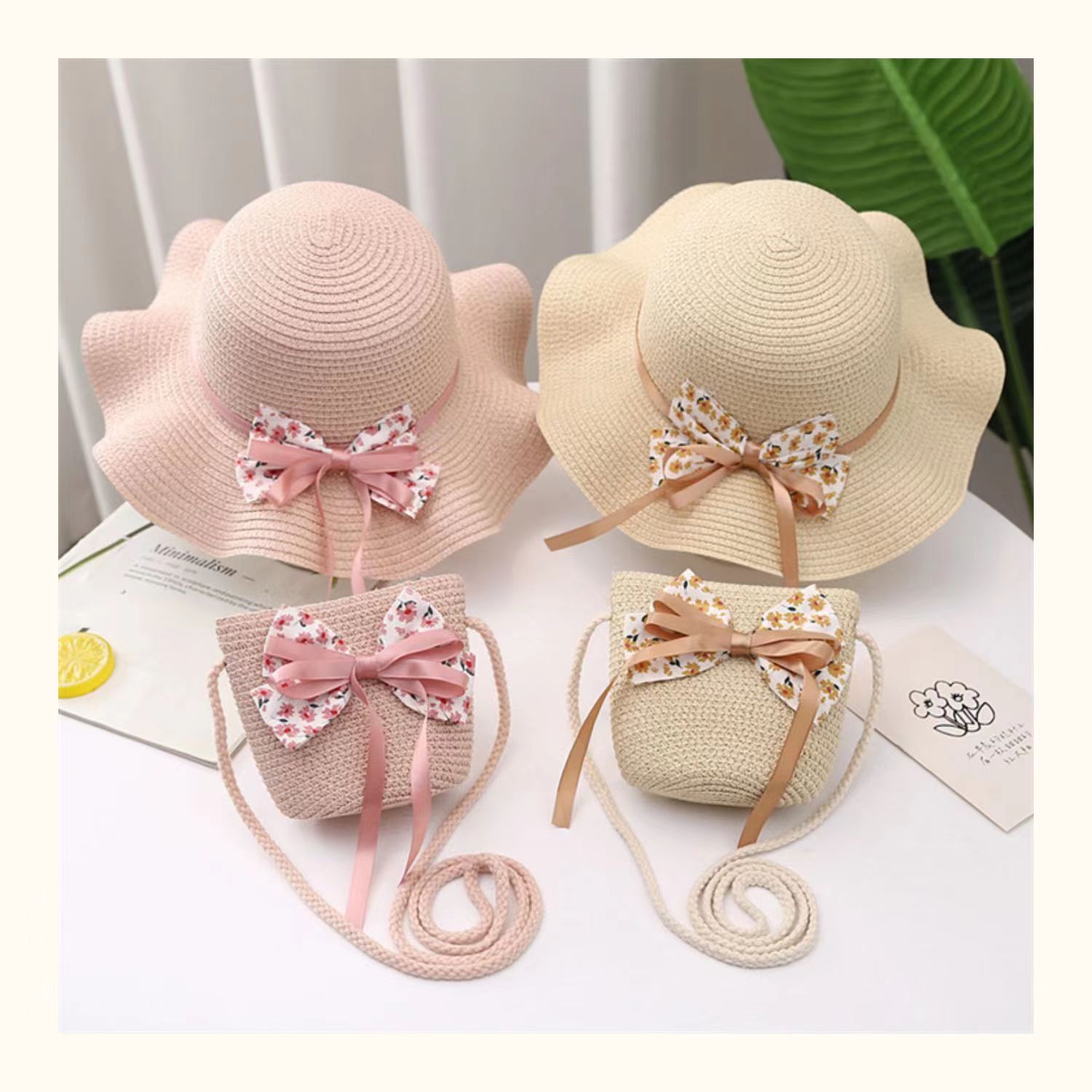 여름 어린이의 새로운 태양 모자 재고 있음 밀짚 모자 가방 세트 소녀 태양 보호 해변 모자 밀짚 태양 모자