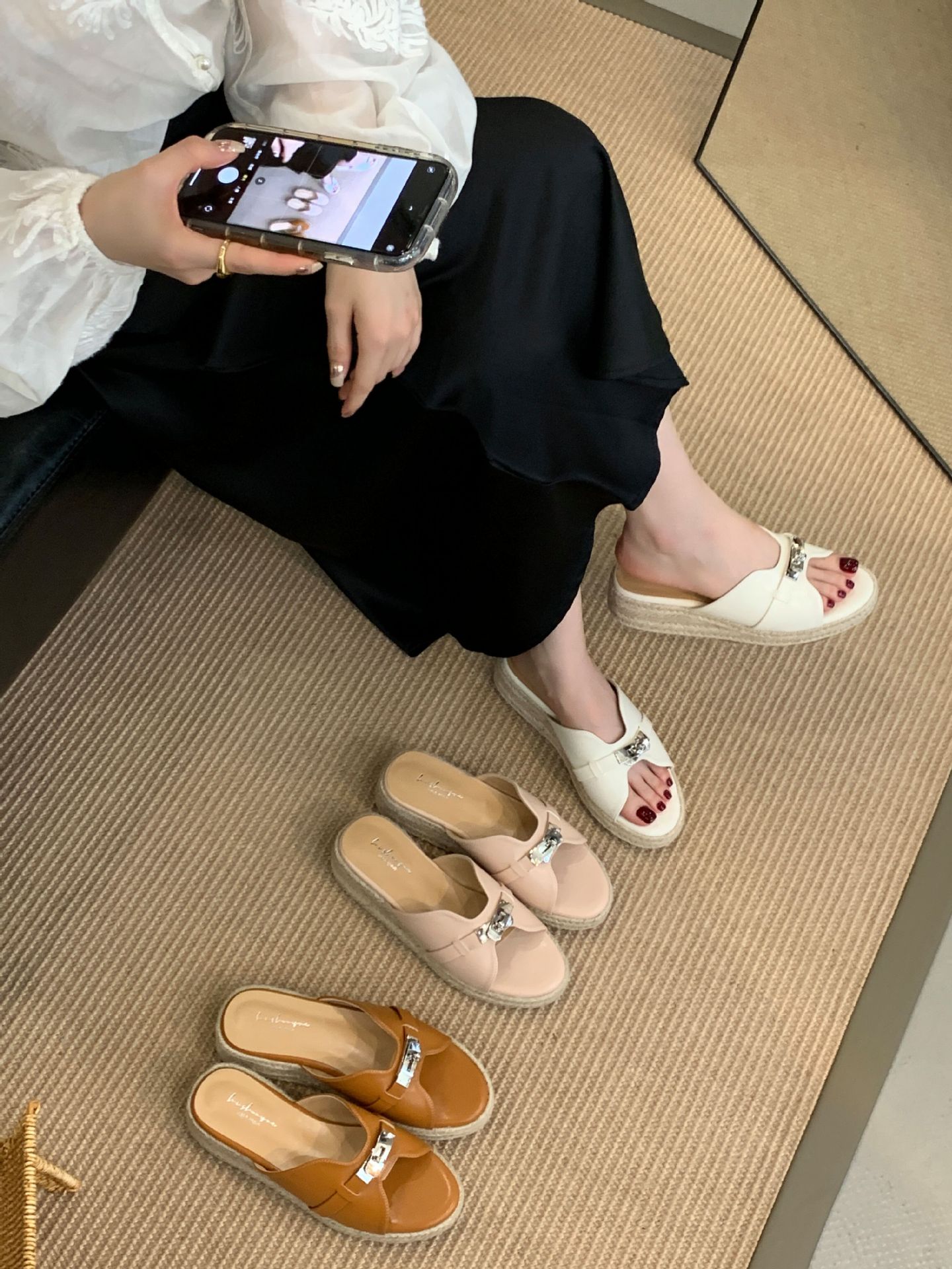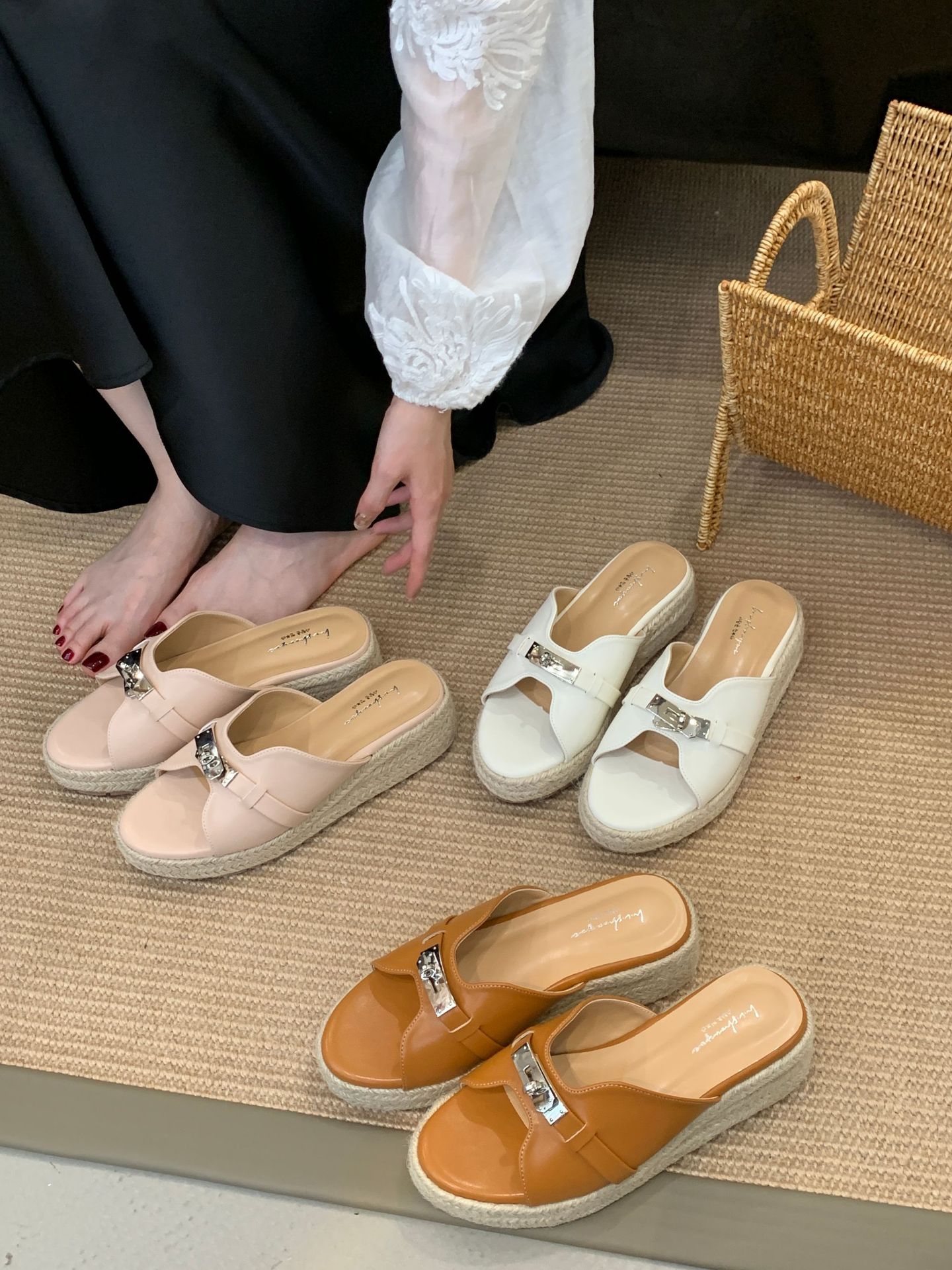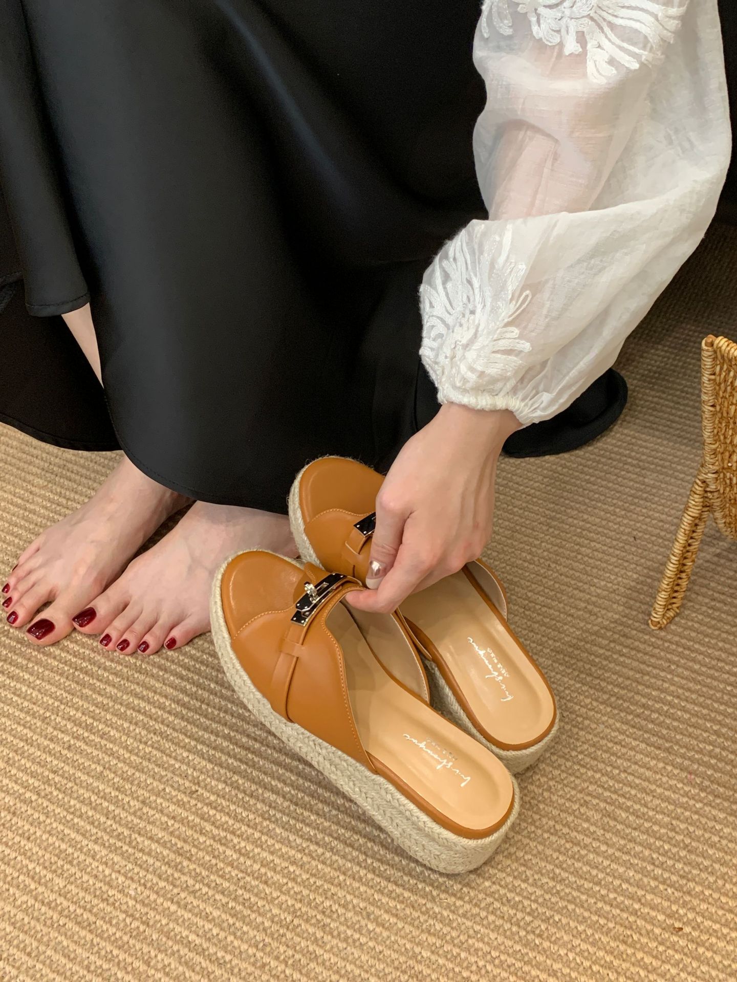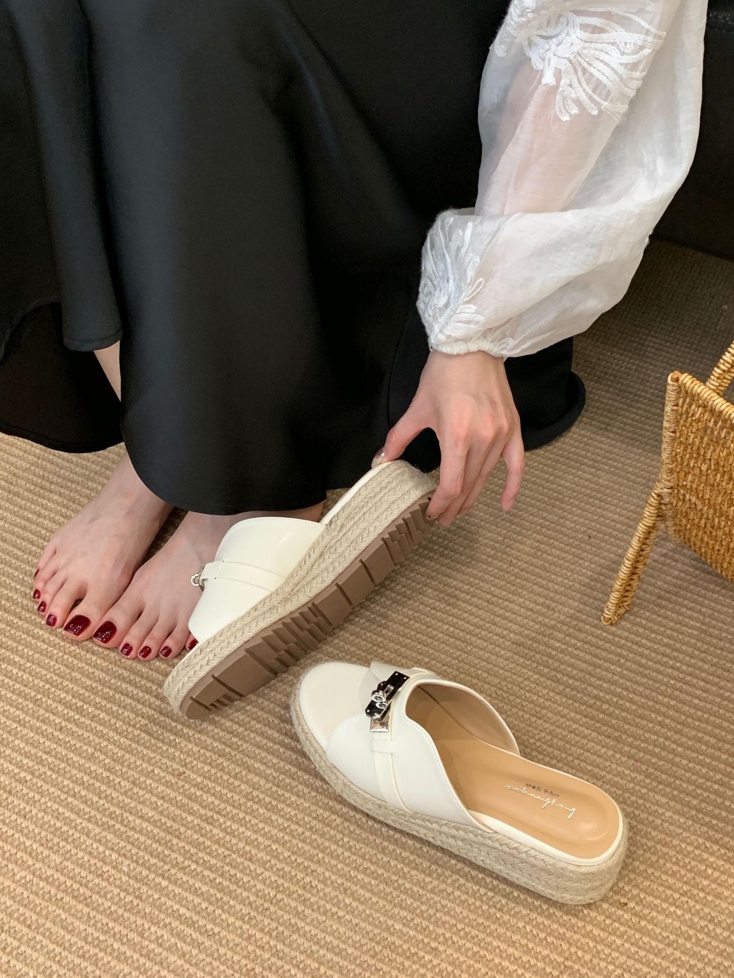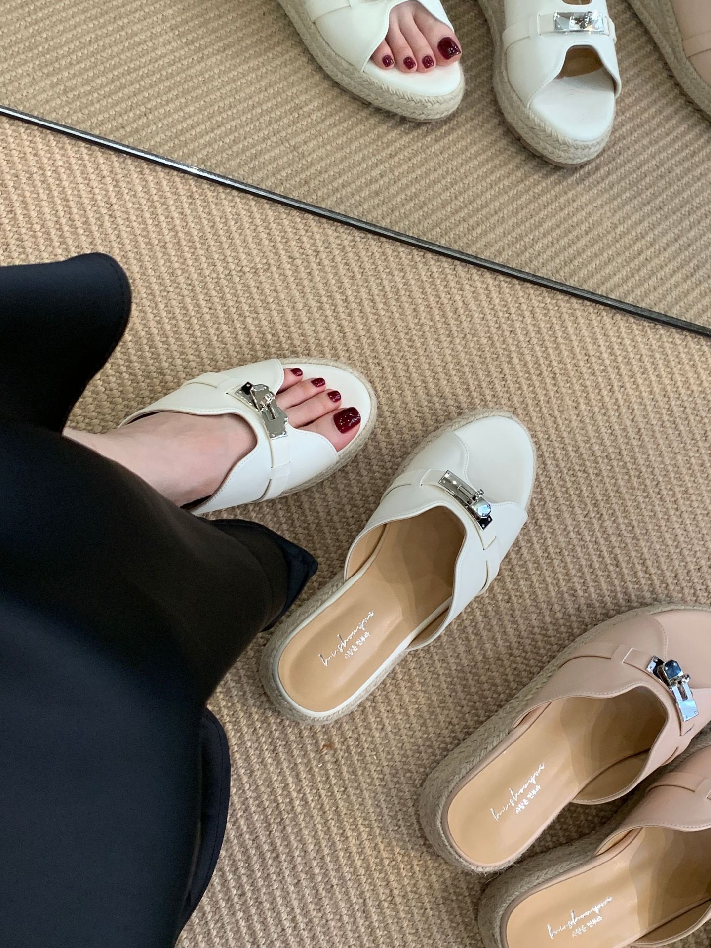 영국식 잠금 버클 밀짚 웨지 2025 여름 두꺼운 밑창 중간 굽 둥근 발가락 오픈 토우 여성용 슬리퍼스토어 가기