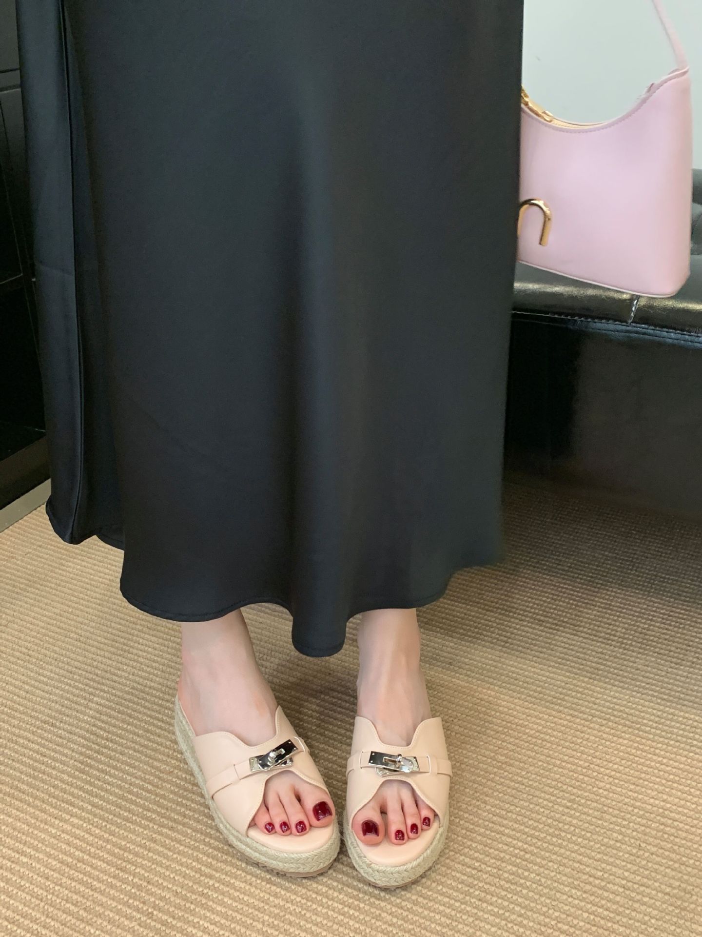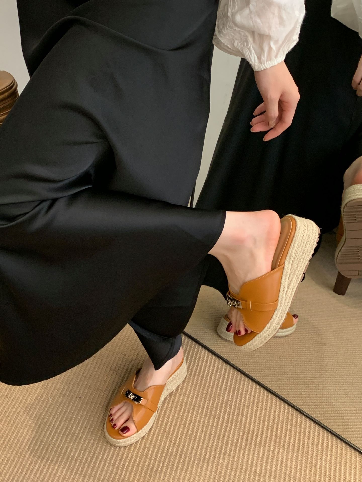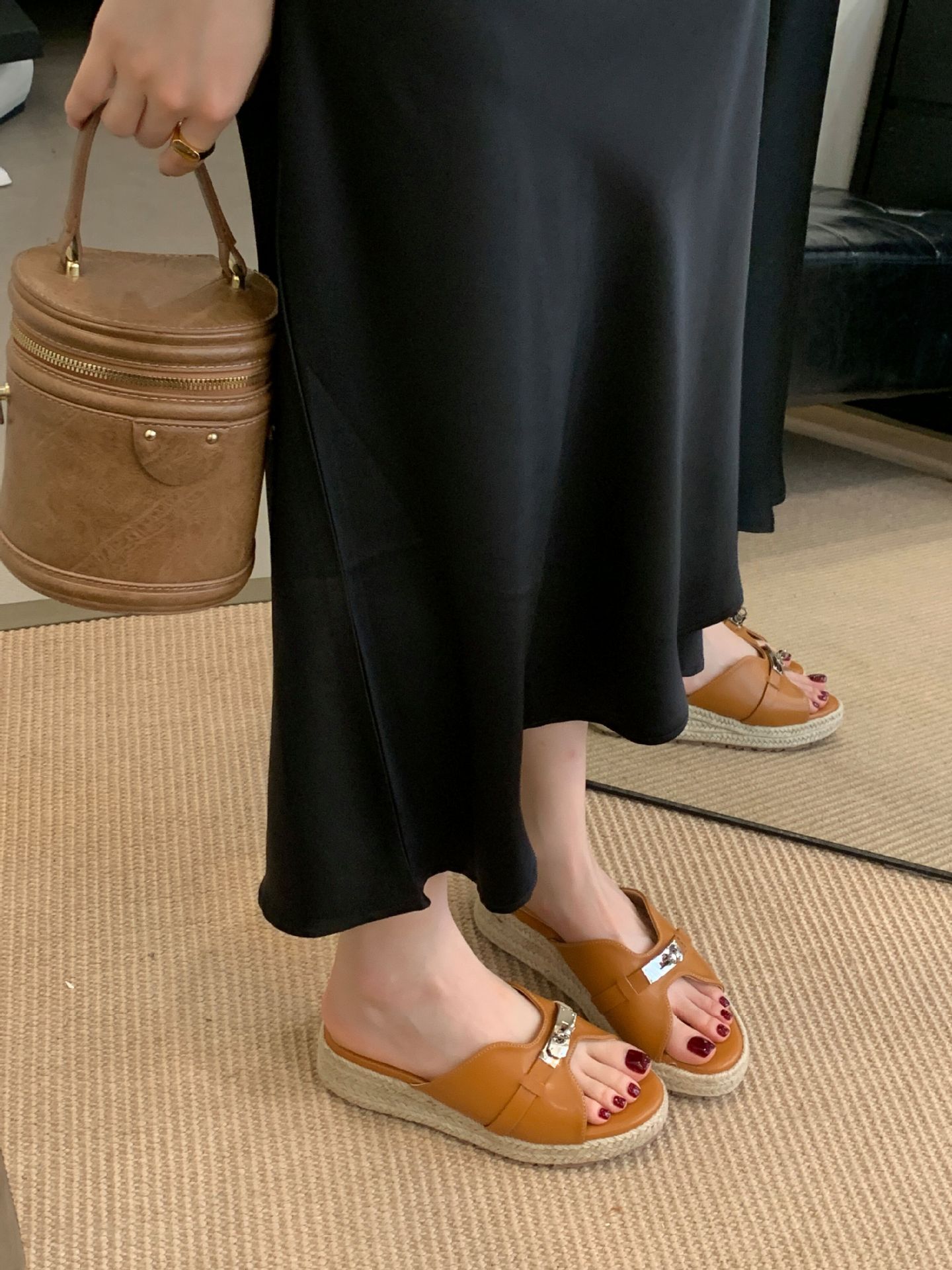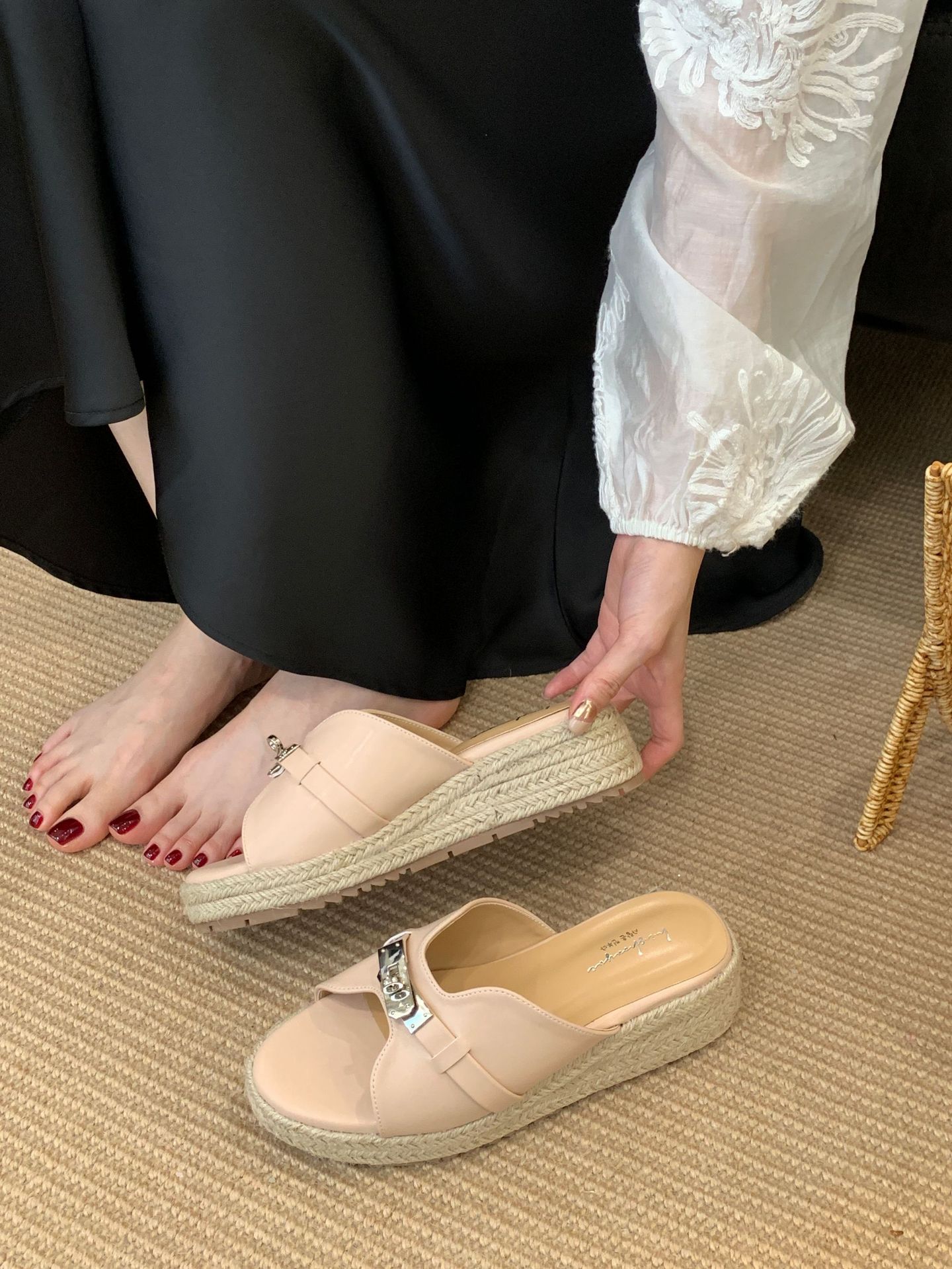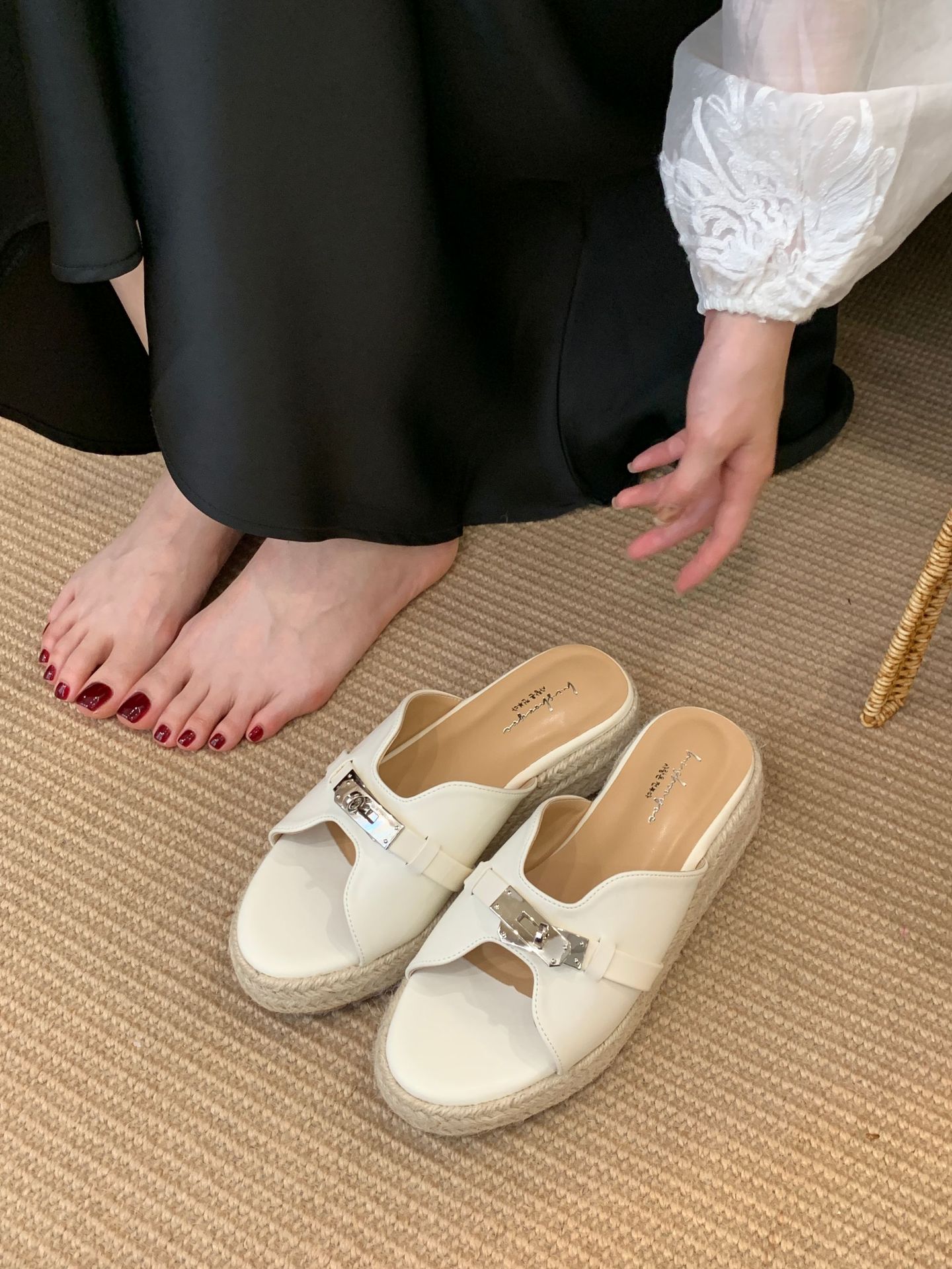 영국식 잠금 버클 밀짚 웨지 2025 여름 두꺼운 밑창 중간 굽 둥근 발가락 오픈 토우 여성용 슬리퍼스토어 가기