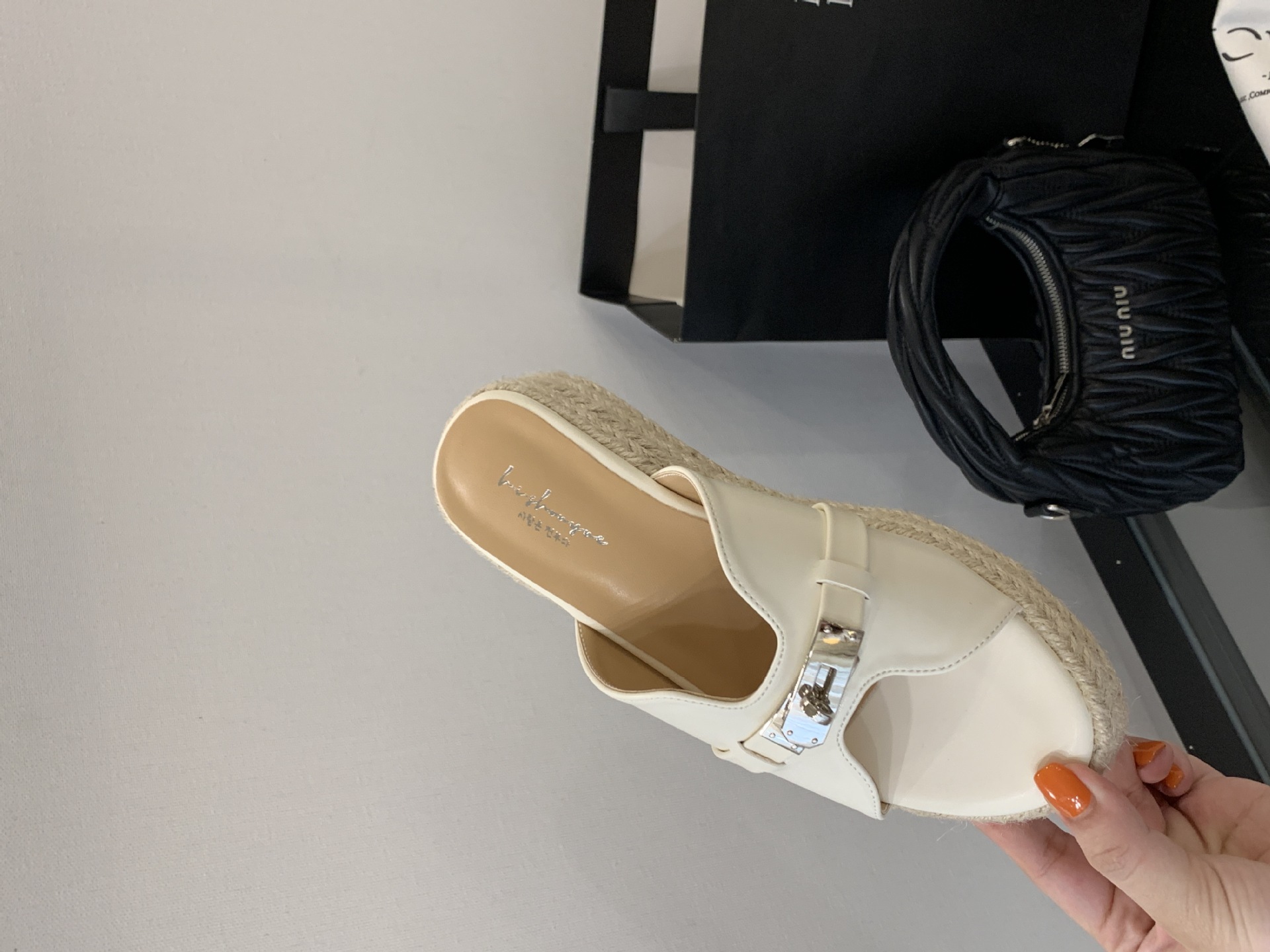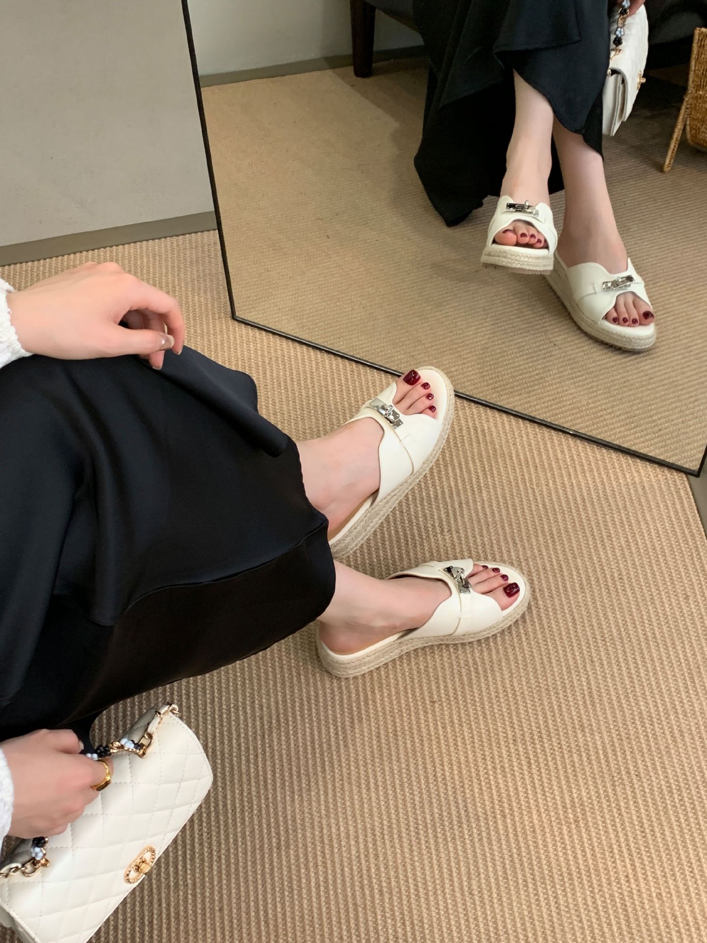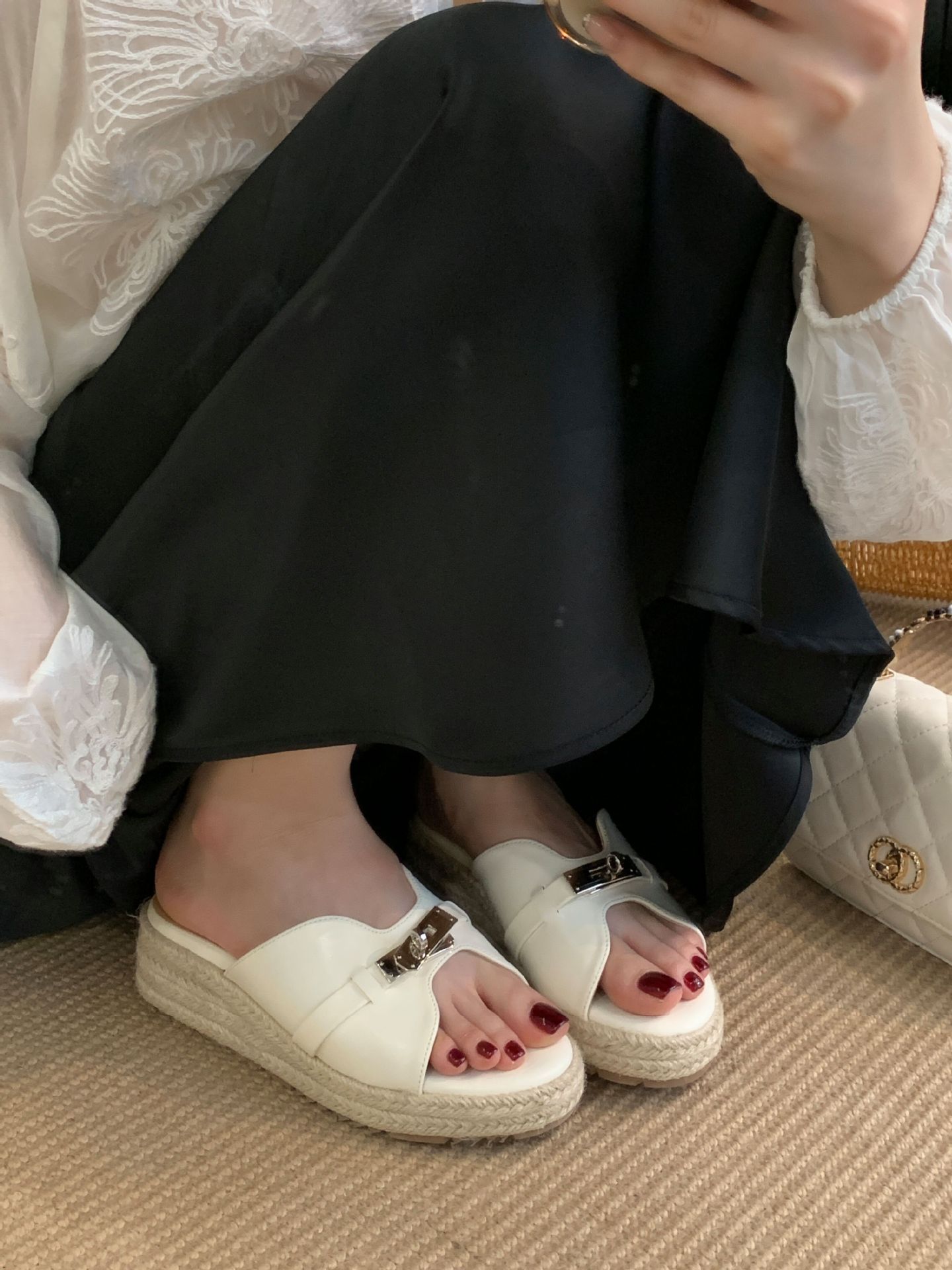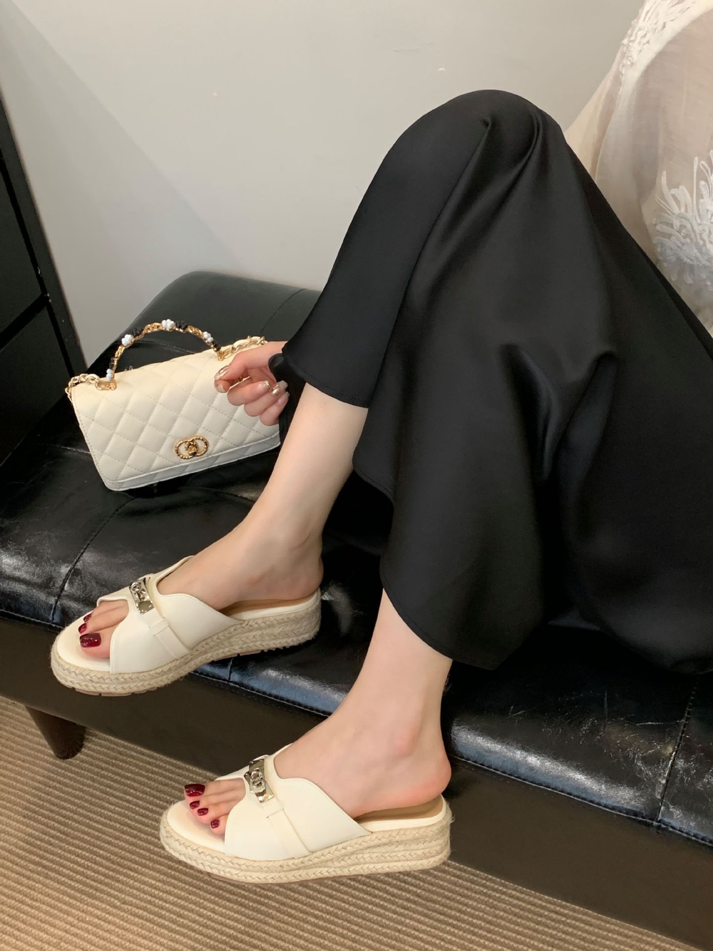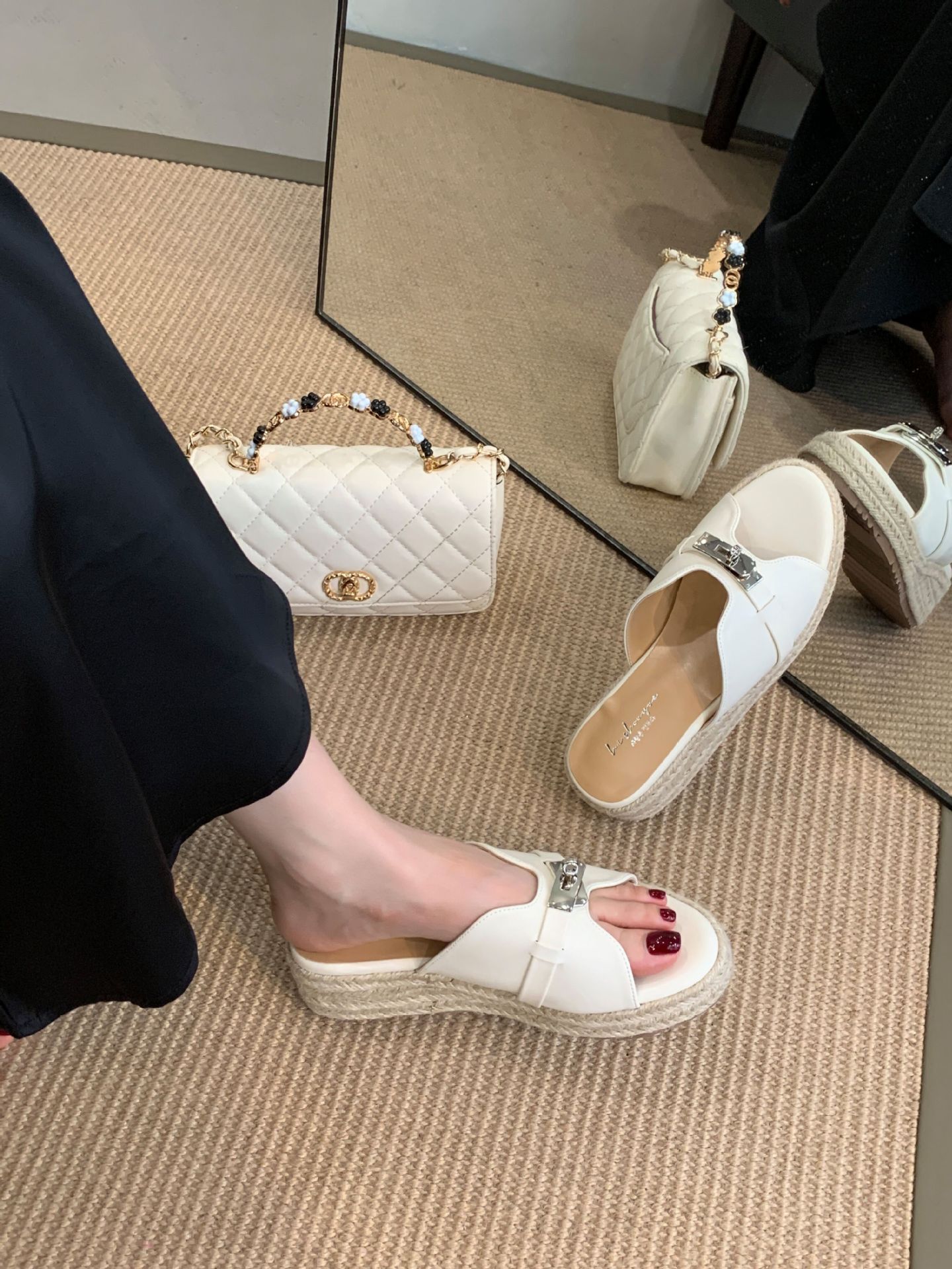 영국식 잠금 버클 밀짚 웨지 2025 여름 두꺼운 밑창 중간 굽 둥근 발가락 오픈 토우 여성용 슬리퍼스토어 가기