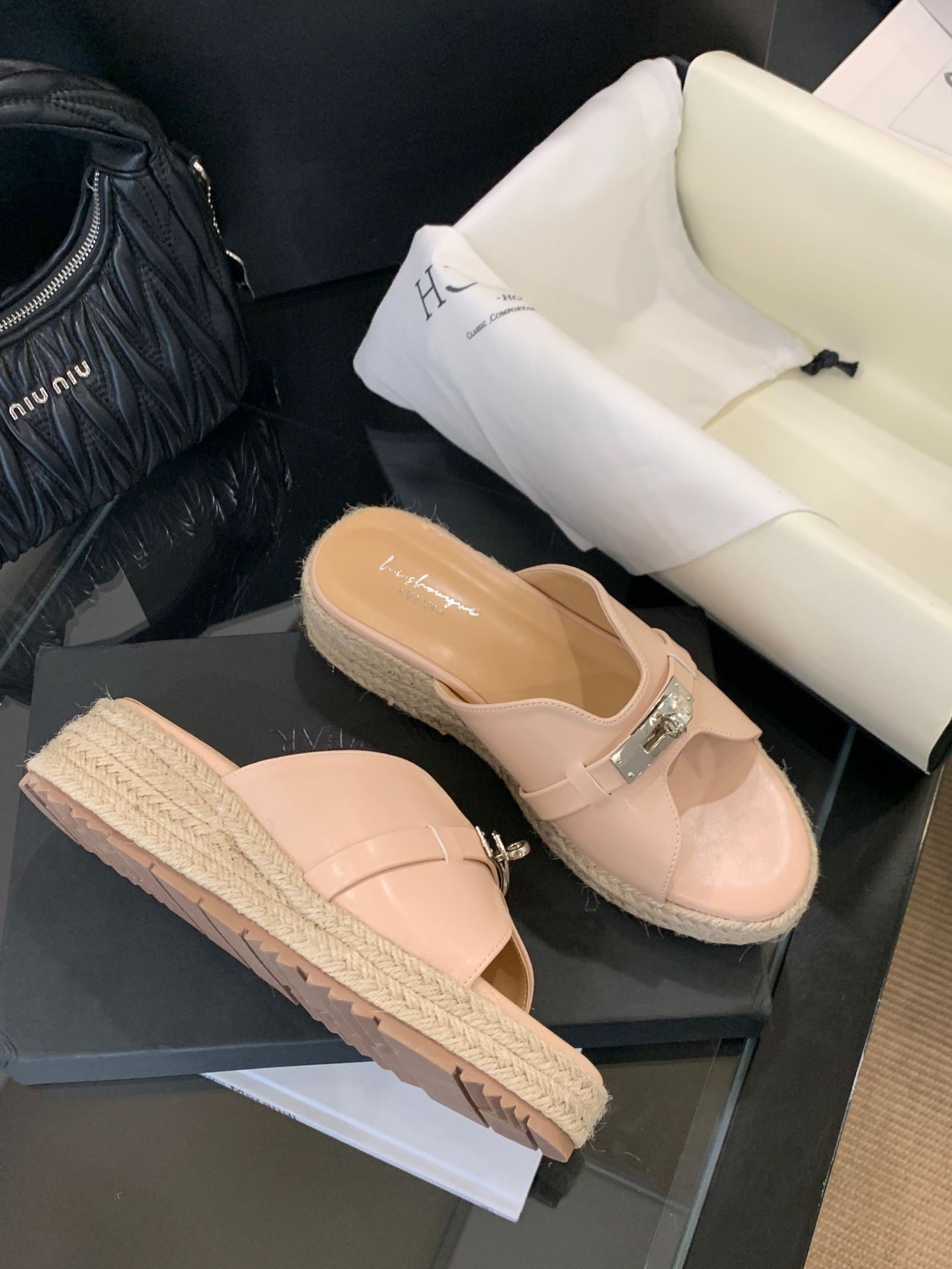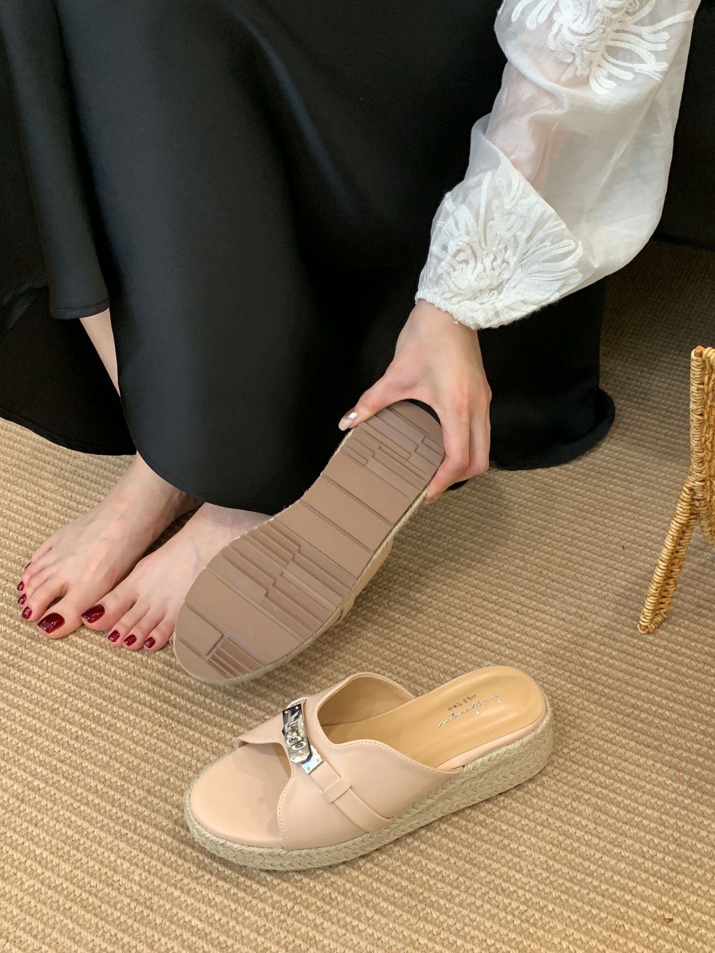 영국식 잠금 버클 밀짚 웨지 2025 여름 두꺼운 밑창 중간 굽 둥근 발가락 오픈 토우 여성용 슬리퍼