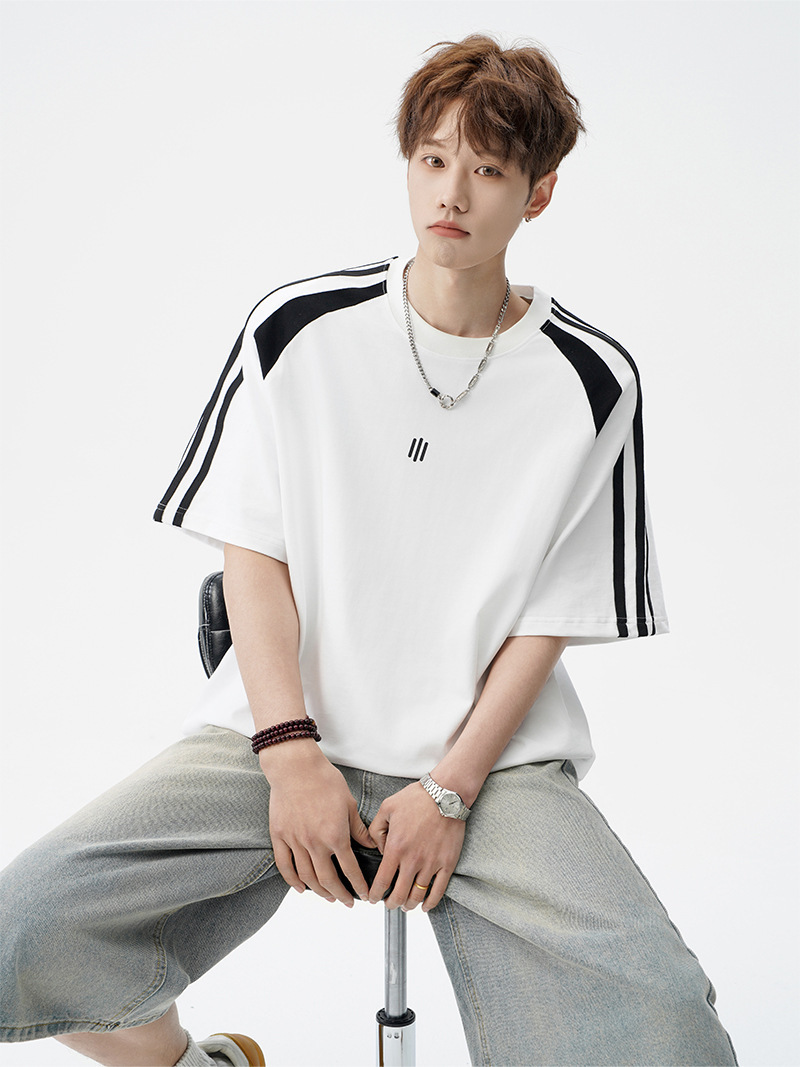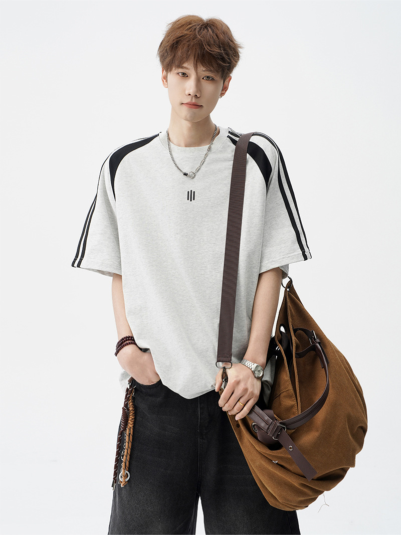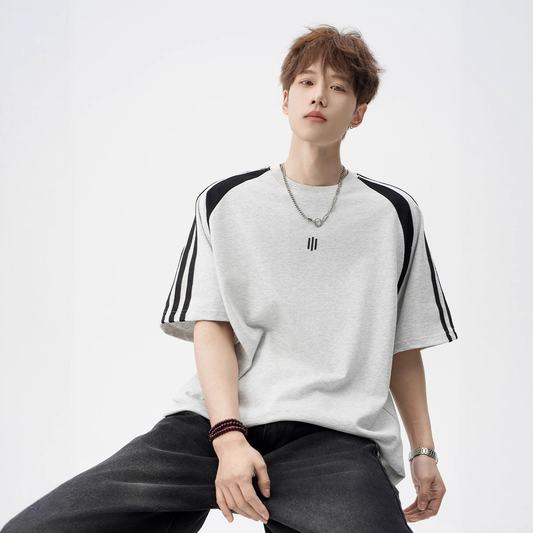 아메리칸 스트라이프 대비 컬러 스플라이싱 반팔 티셔츠 남성 여름 신작 트렌디 브랜드 디자인 다용도 라운드 넥 반팔 티셔츠스토어 가기