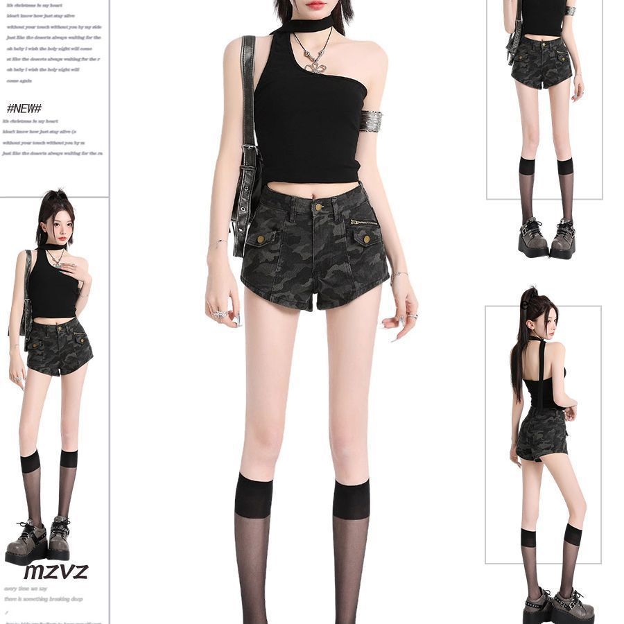 여성을위한 미국 핫 소녀 위장 데님 슈퍼 반바지 2025 여름 새로운 디자인 하이 웨이스트 작업복 a 라인 힙 팬츠