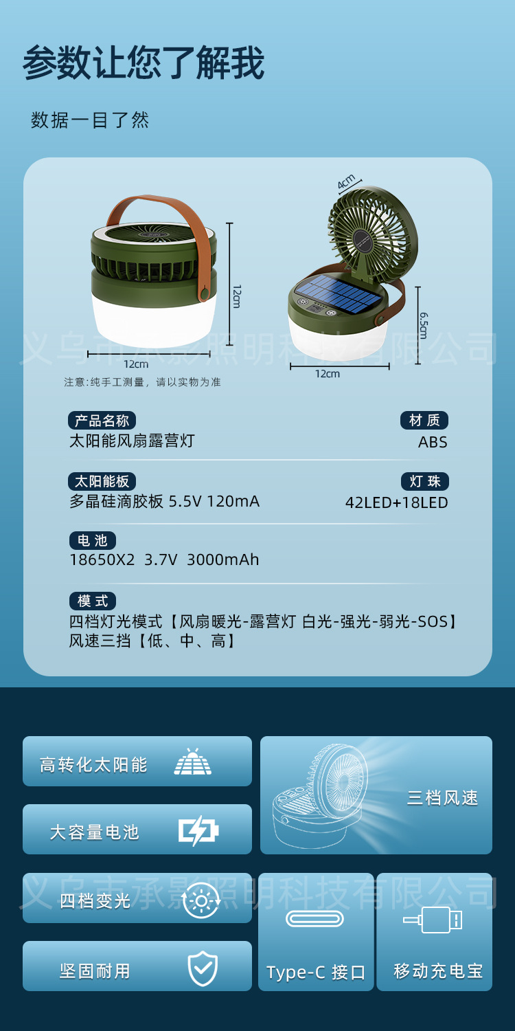 태양광 팬 라이트 캠핑 라이트 다기능 야외 초강력 배터리 충전식 텐트 라이트 비상등 캠핑 라이트