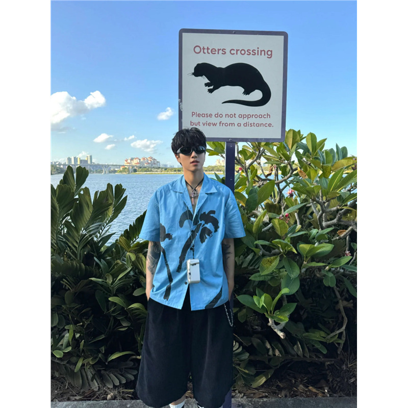 소년을위한 여름 새 스타일 섬 프린트 반팔 셔츠 한국 스타일 트렌디 루즈 캐주얼 휴가 커플 잘 생긴 셔츠스토어 가기