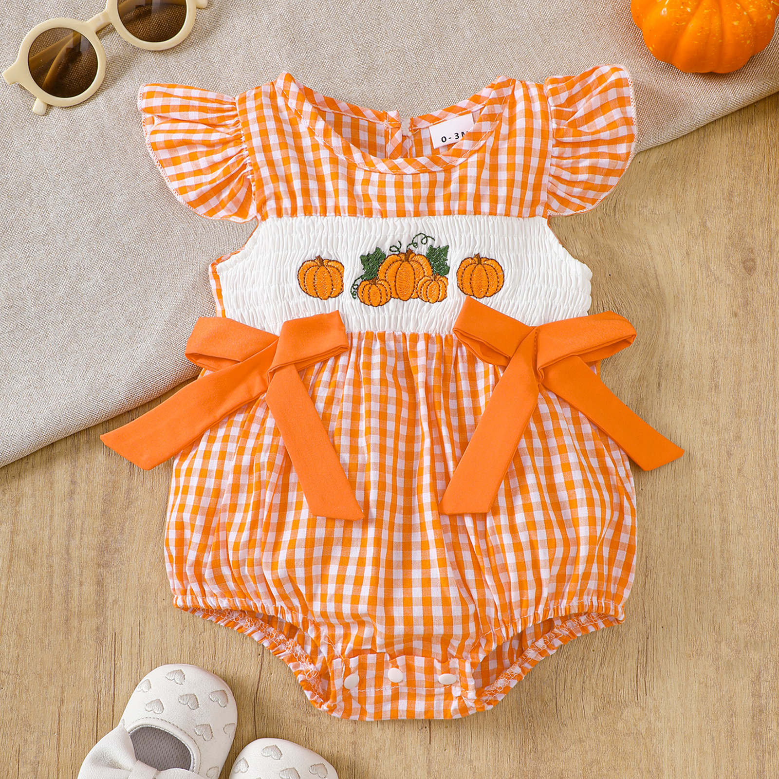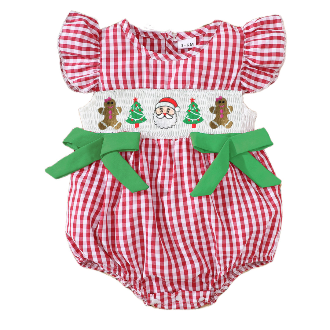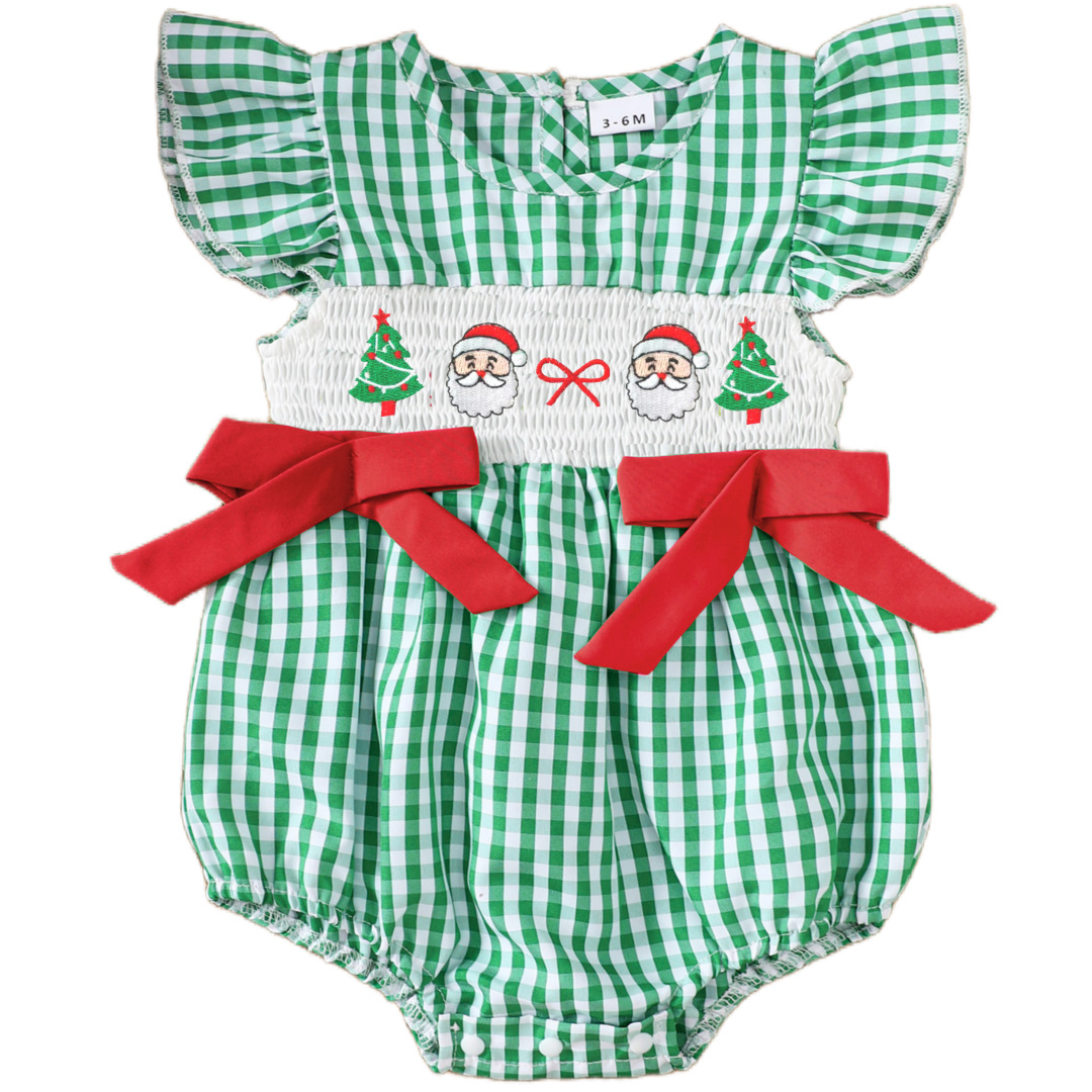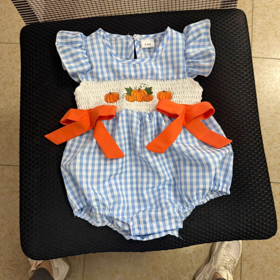 2025 새로운 여름 아기 반팔 격자 무늬 크리스마스 트리 자수 가운 할로윈 호박 자수 점프 슈트