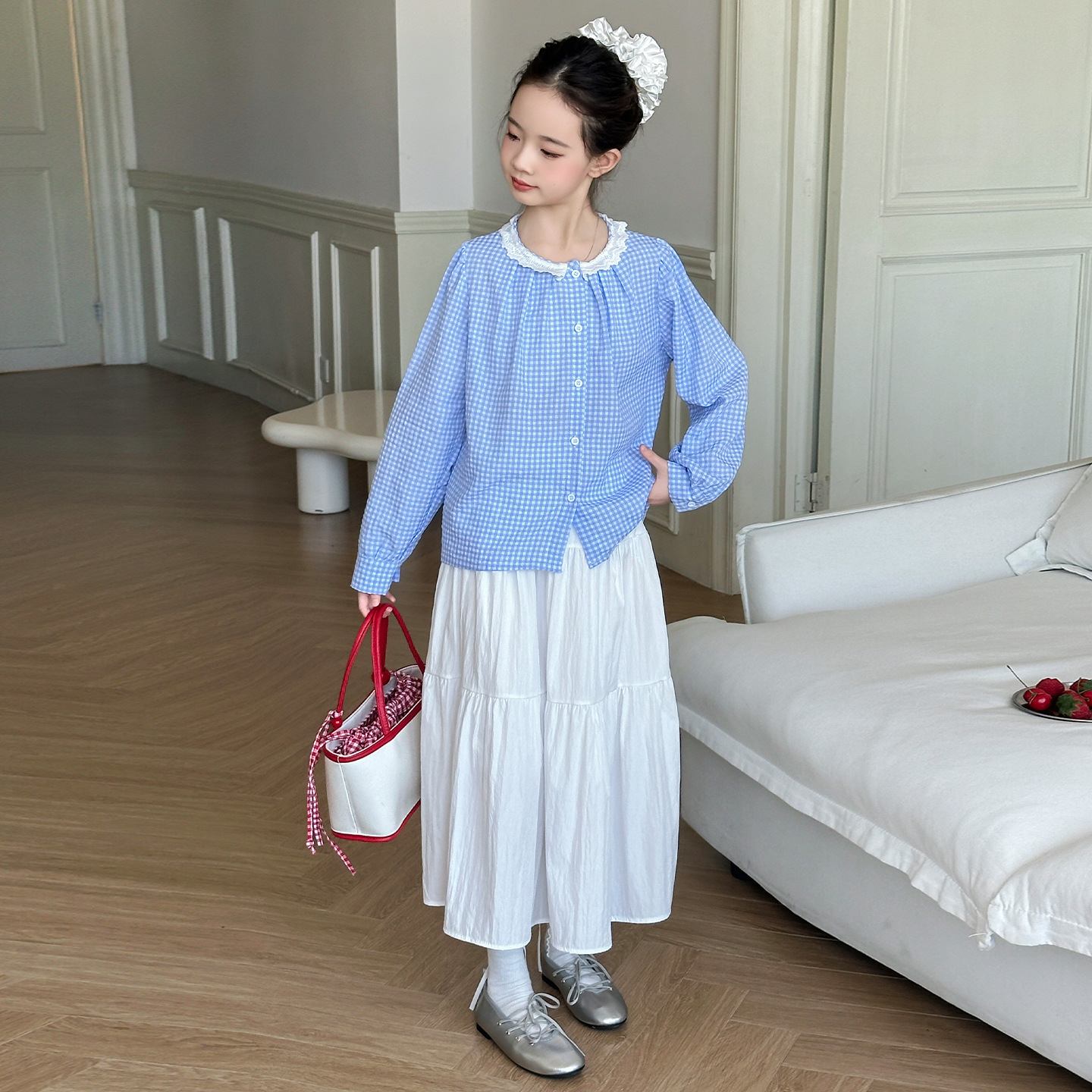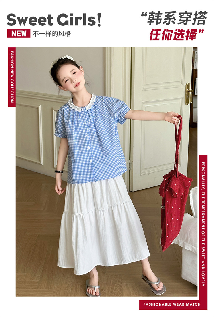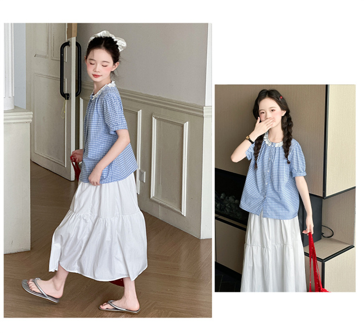 여아 한국식 스커트 2025 여름 신작 큰 어린이의 세련된 격자 무늬 반팔 셔츠와 스커트 투피스 세트