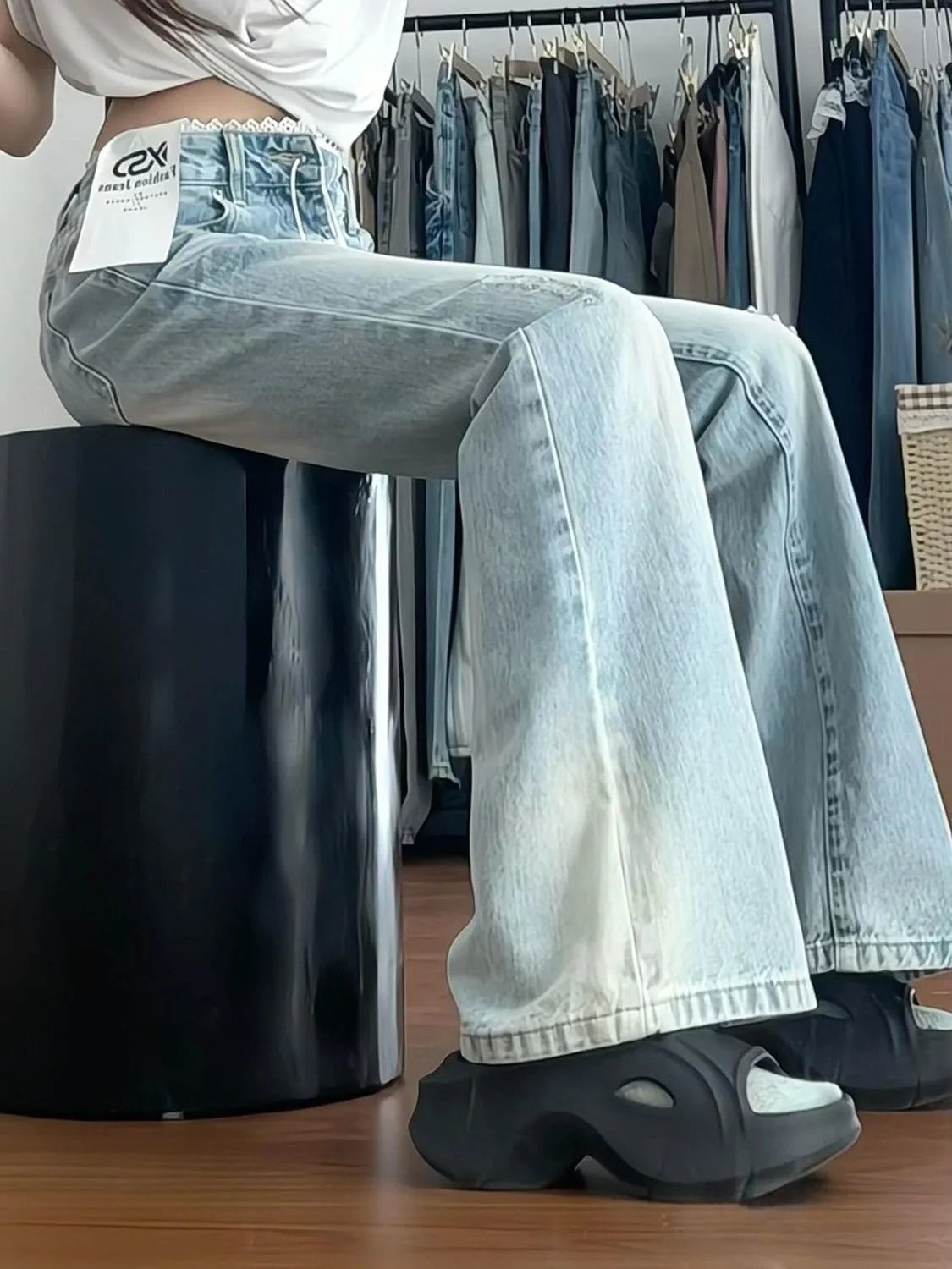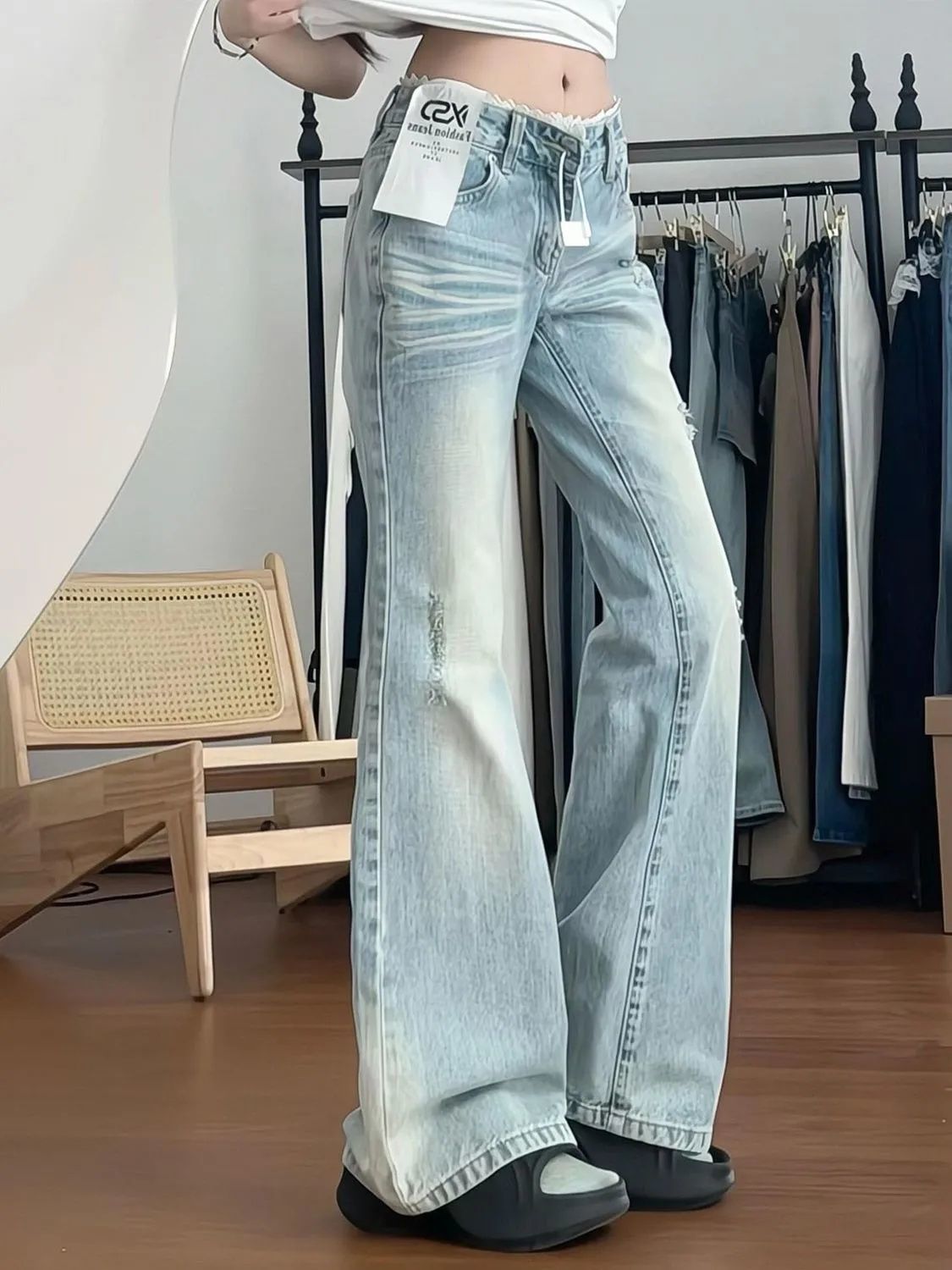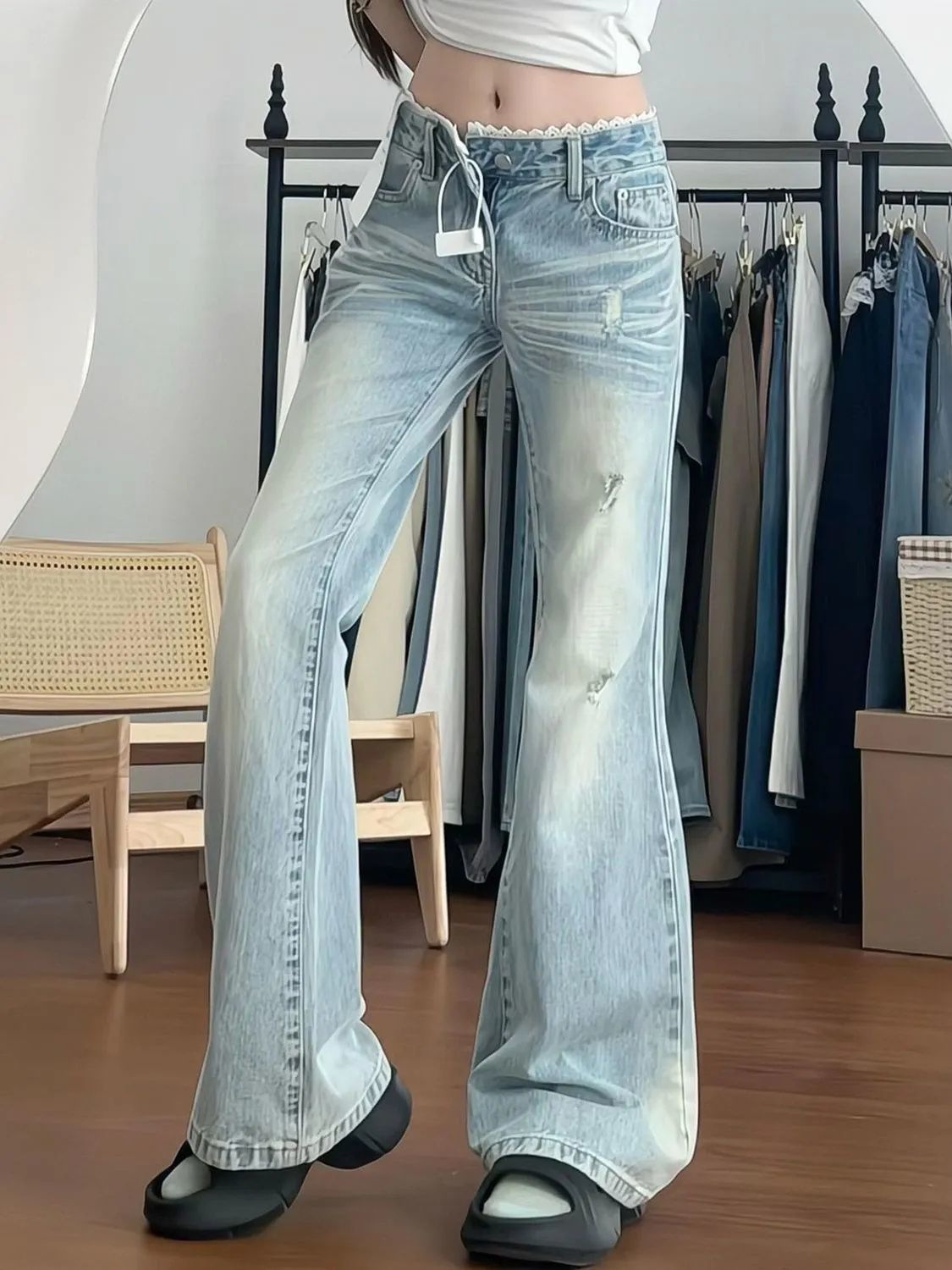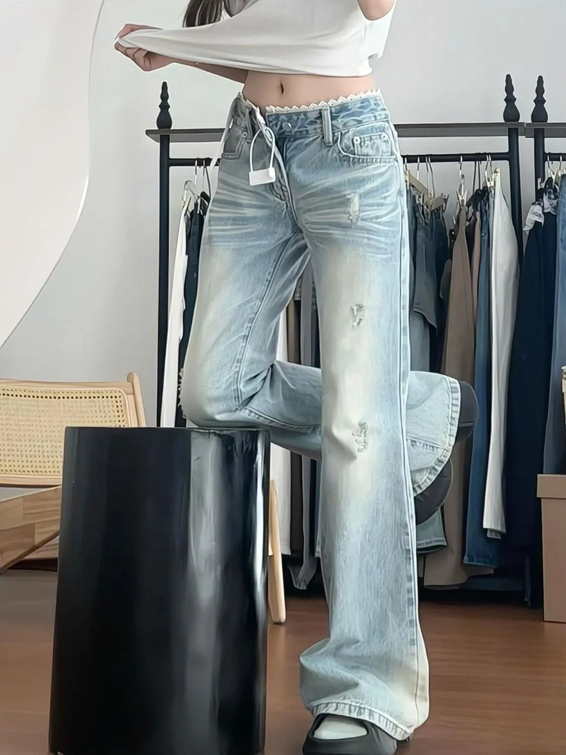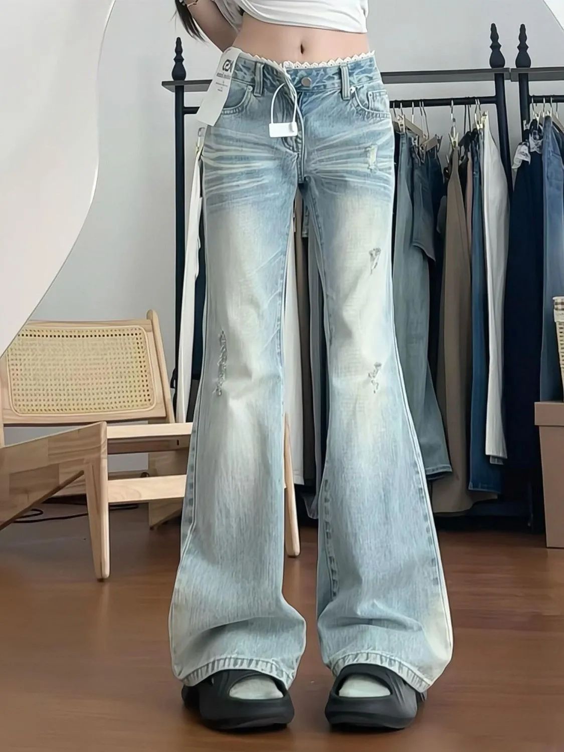 여성을위한 작은 미국 핫 소녀 로우 웨이스트 청바지 2025 여름 새로운 밝은 색상 레이스 스플 라이스 슬리밍 부츠 컷 바지스토어 가기