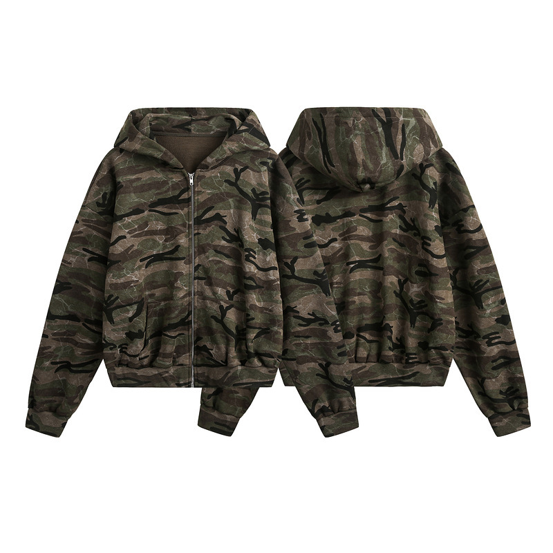 남성과 여성을 위한 가을 새로운 미국 복고풍 위장 후드 스웨트 셔츠 카디건 루즈 캐주얼 하이 스트리트 디자인 재킷스토어 가기