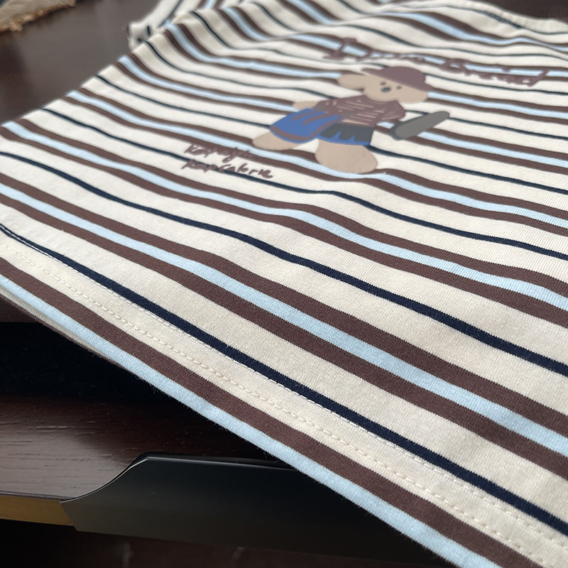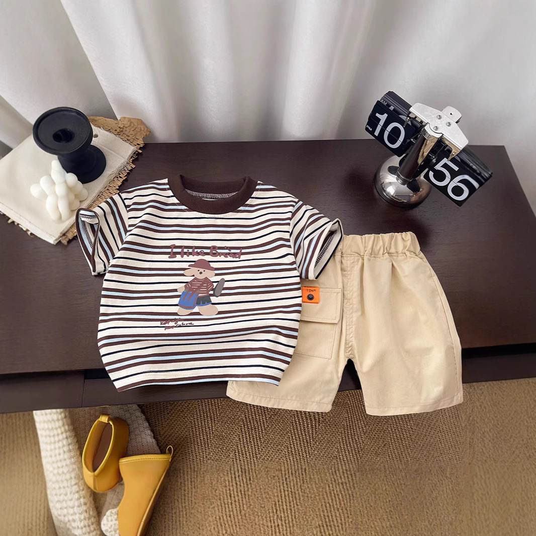 면 여름 새로운 스타일 만화 스타일 소년과 소녀 아기 귀여운 대비 색상 접합 줄무늬 반팔 티셔츠 세트 1스토어 가기