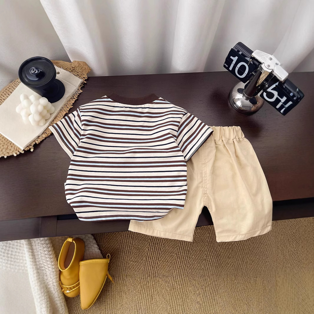 면 여름 새로운 스타일 만화 스타일 소년과 소녀 아기 귀여운 대비 색상 접합 줄무늬 반팔 티셔츠 세트 1