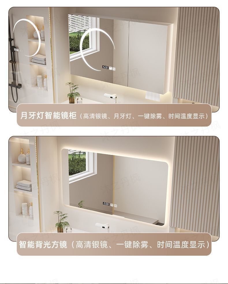 • 스마트 초승달 분위기 조명 거울 캐비닛 - 80CM 피부 느낌 통합 세면대 - 다기능 수도꼭지