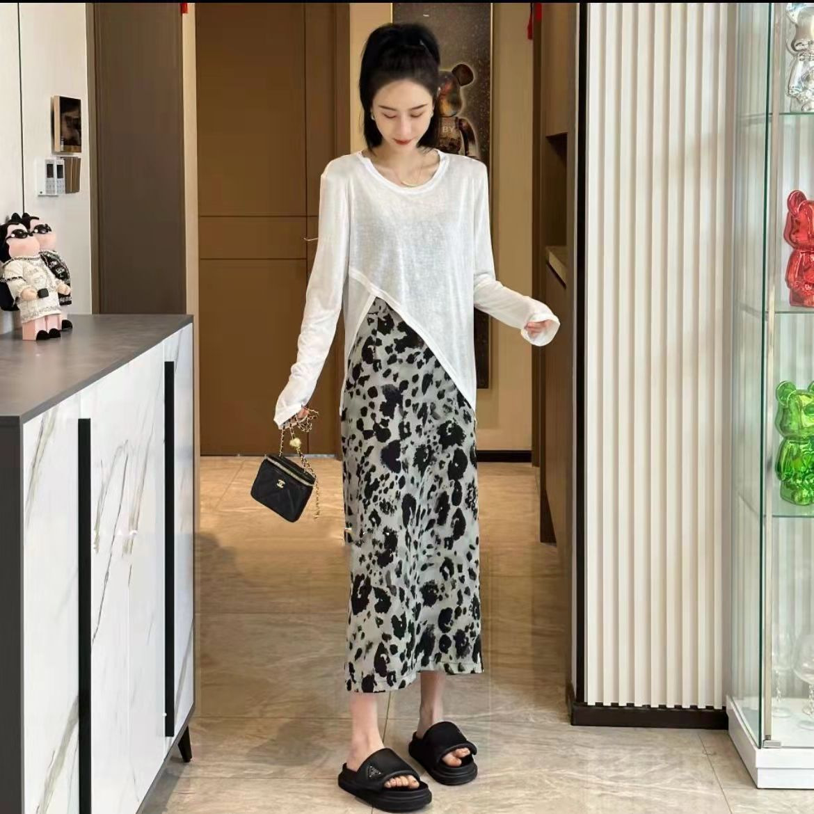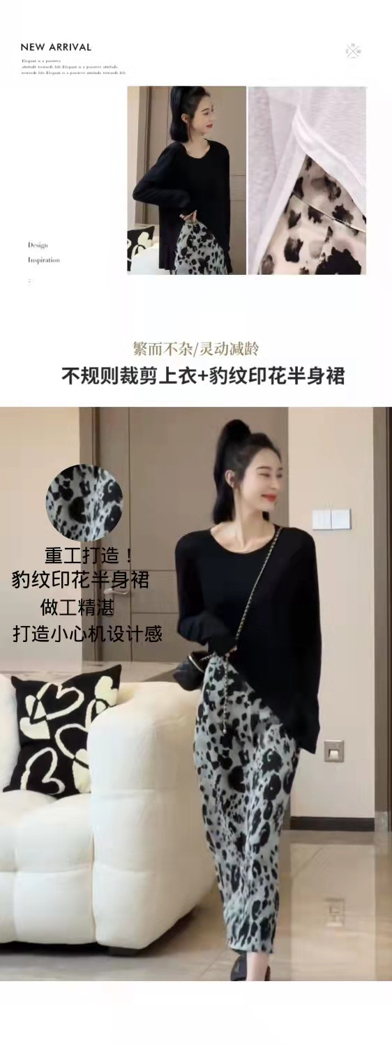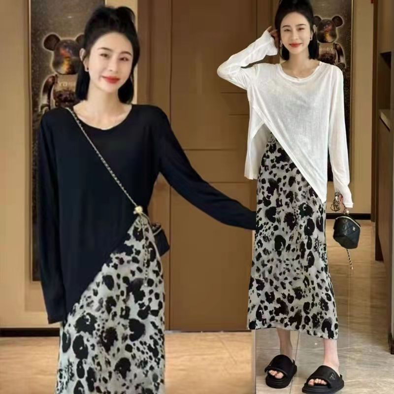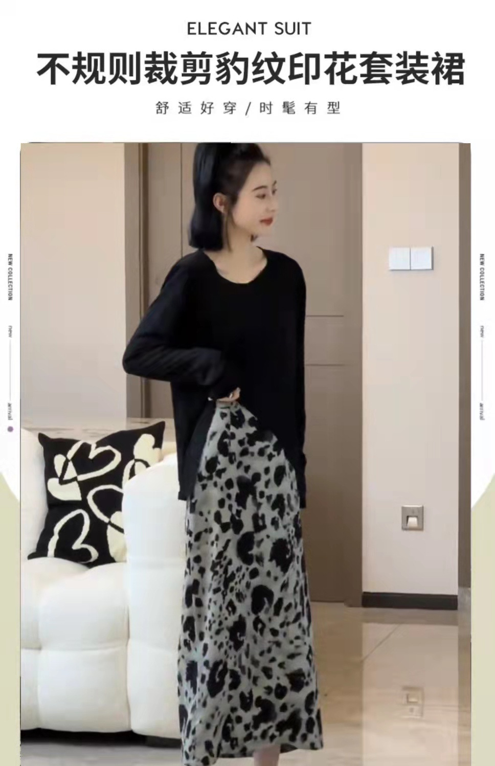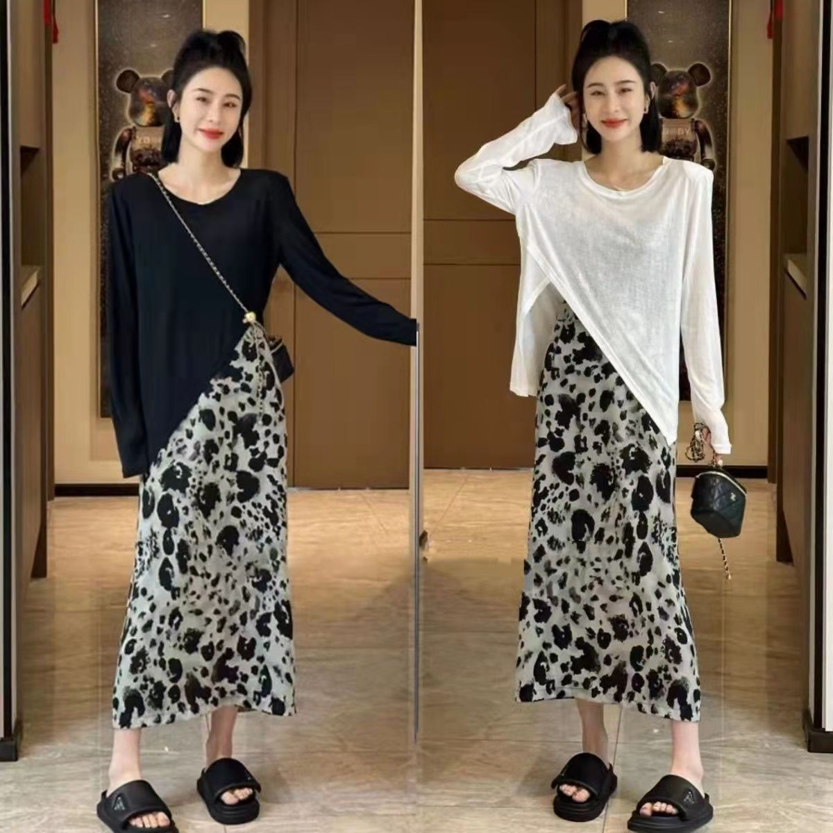 여성용 2024 여름 신작 패션 불규칙한 자외선 차단제 긴팔 티셔츠 레오파드 프린트 스커트 유럽 투피스 세트스토어 가기