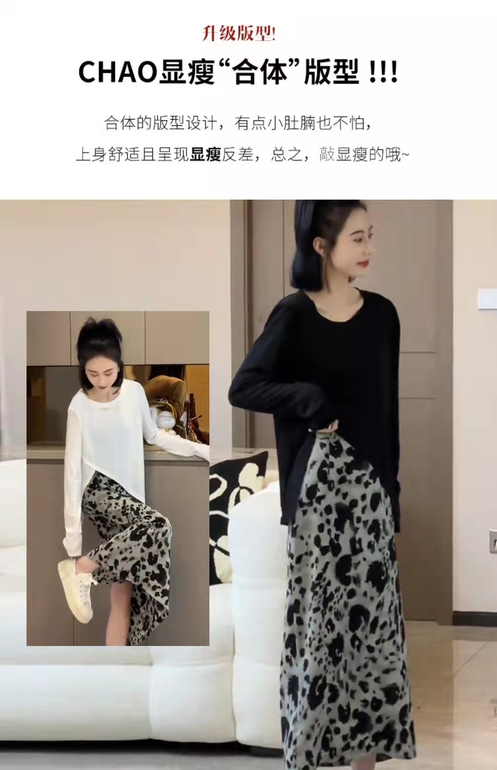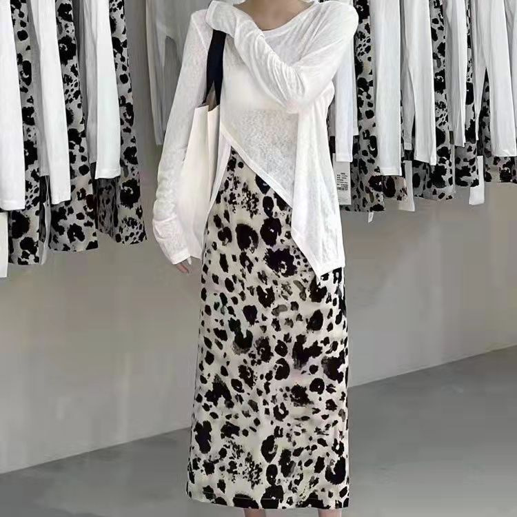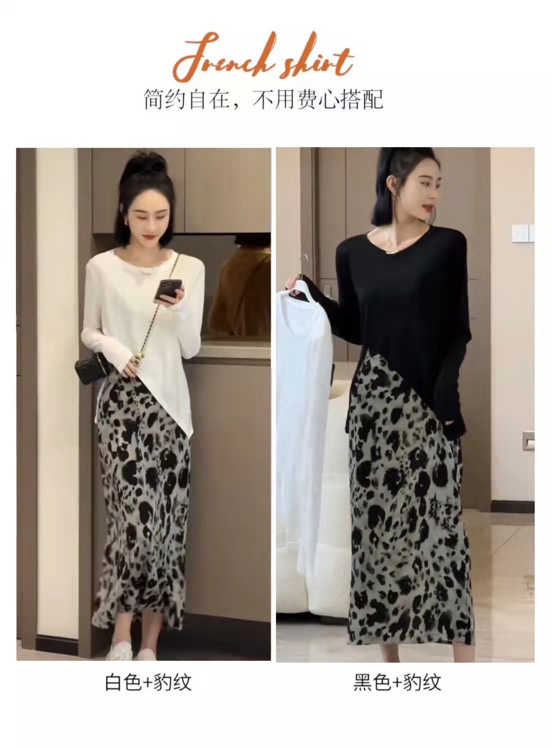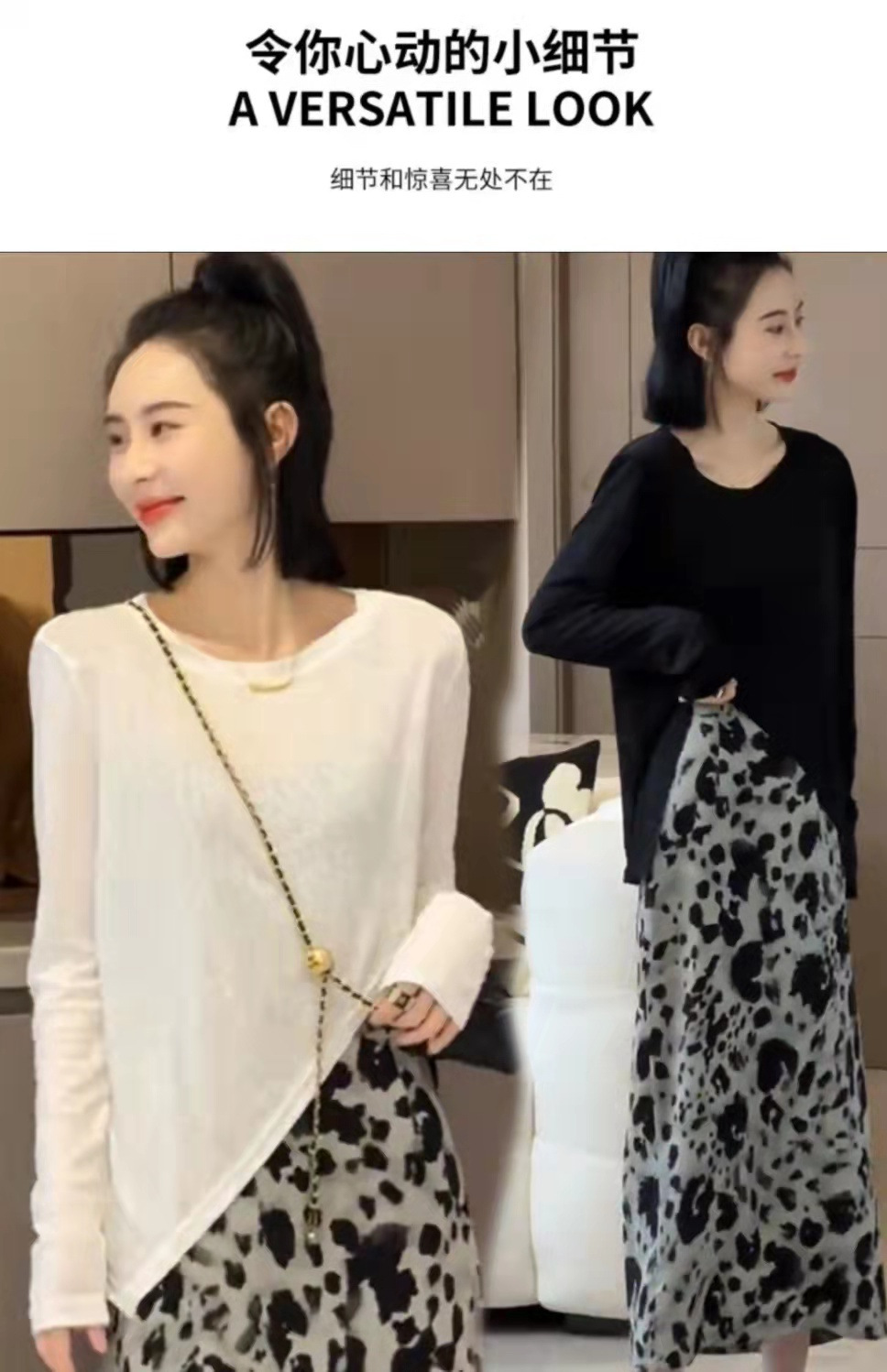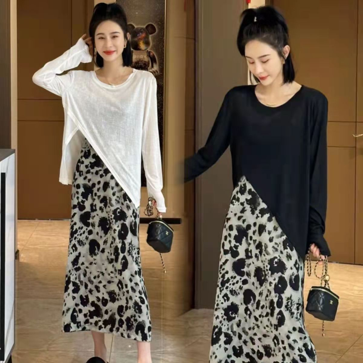 여성용 2024 여름 신작 패션 불규칙한 자외선 차단제 긴팔 티셔츠 레오파드 프린트 스커트 유럽 투피스 세트스토어 가기