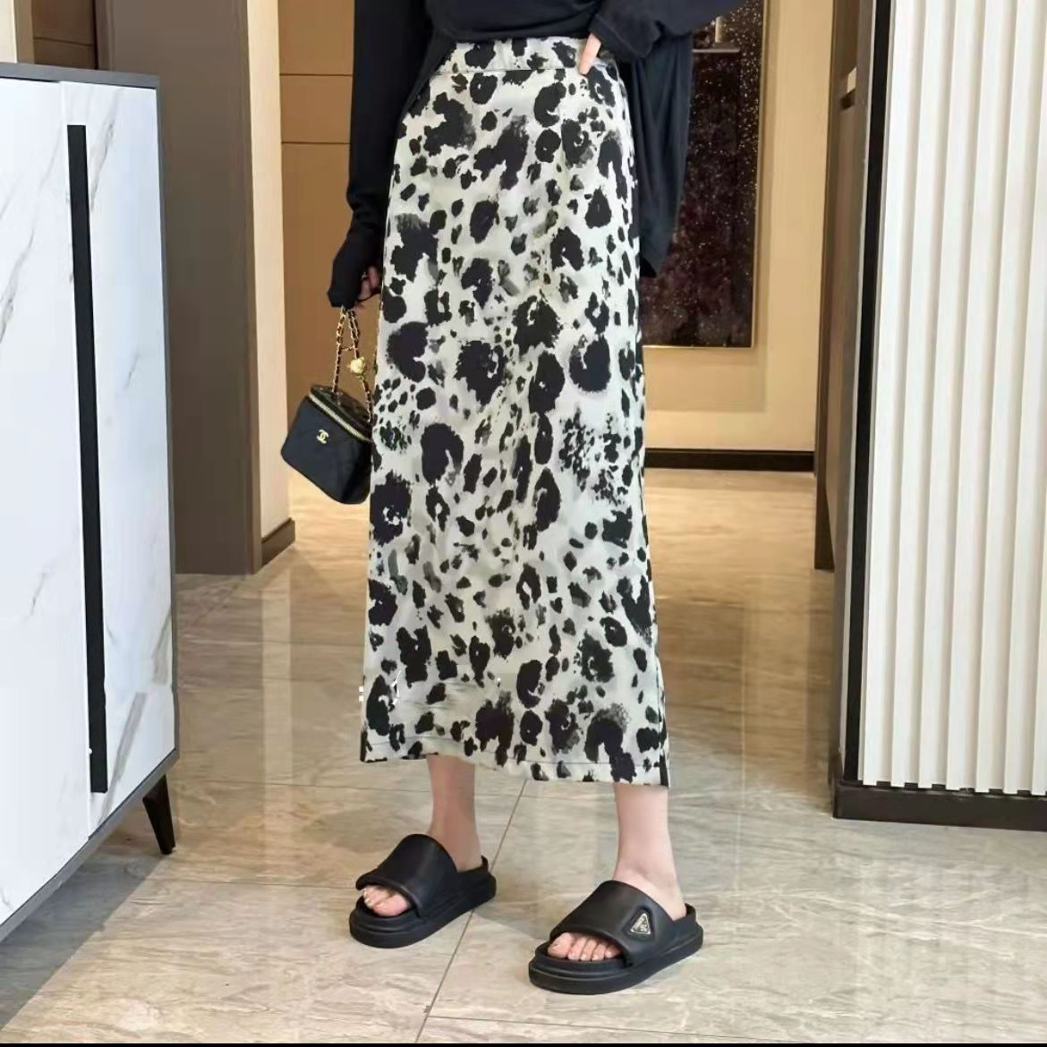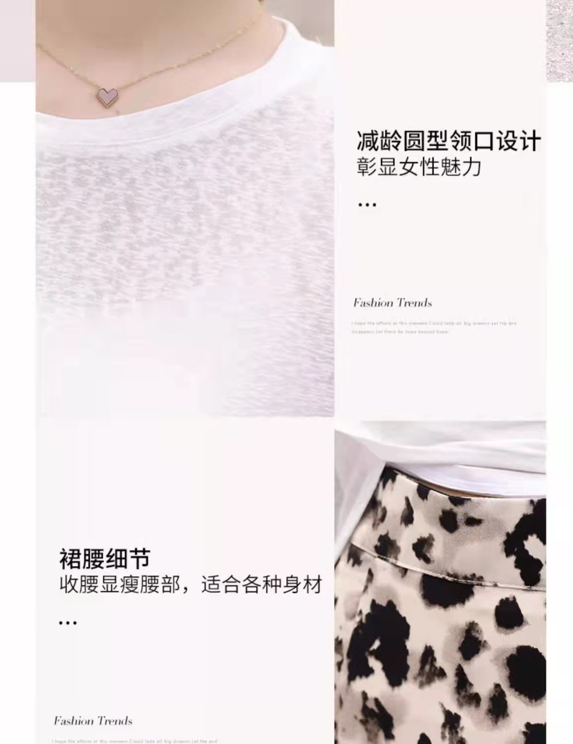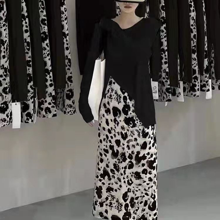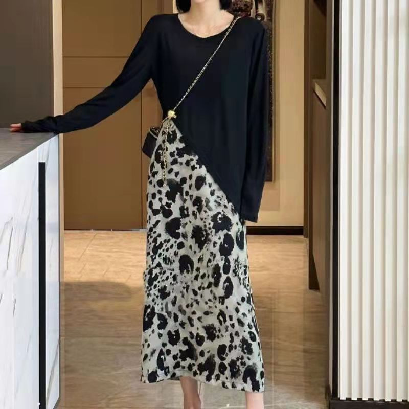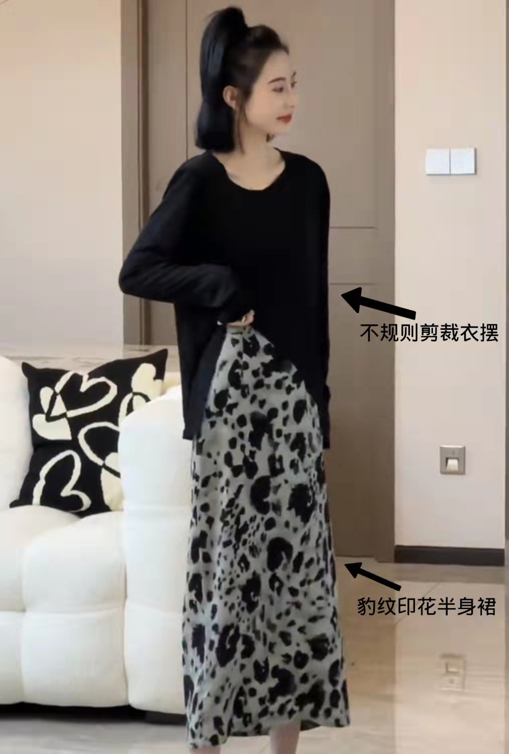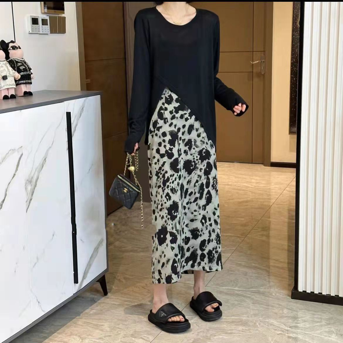 여성용 2024 여름 신작 패션 불규칙한 자외선 차단제 긴팔 티셔츠 레오파드 프린트 스커트 유럽 투피스 세트스토어 가기