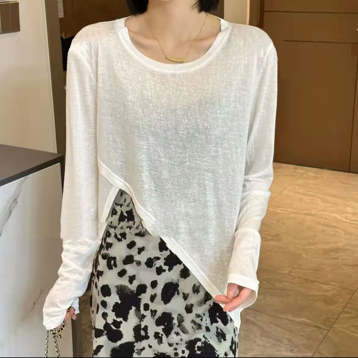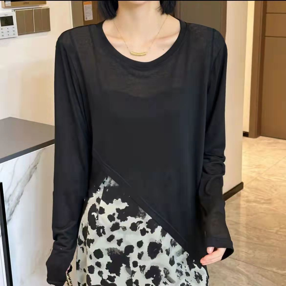 여성용 2024 여름 신작 패션 불규칙한 자외선 차단제 긴팔 티셔츠 레오파드 프린트 스커트 유럽 투피스 세트