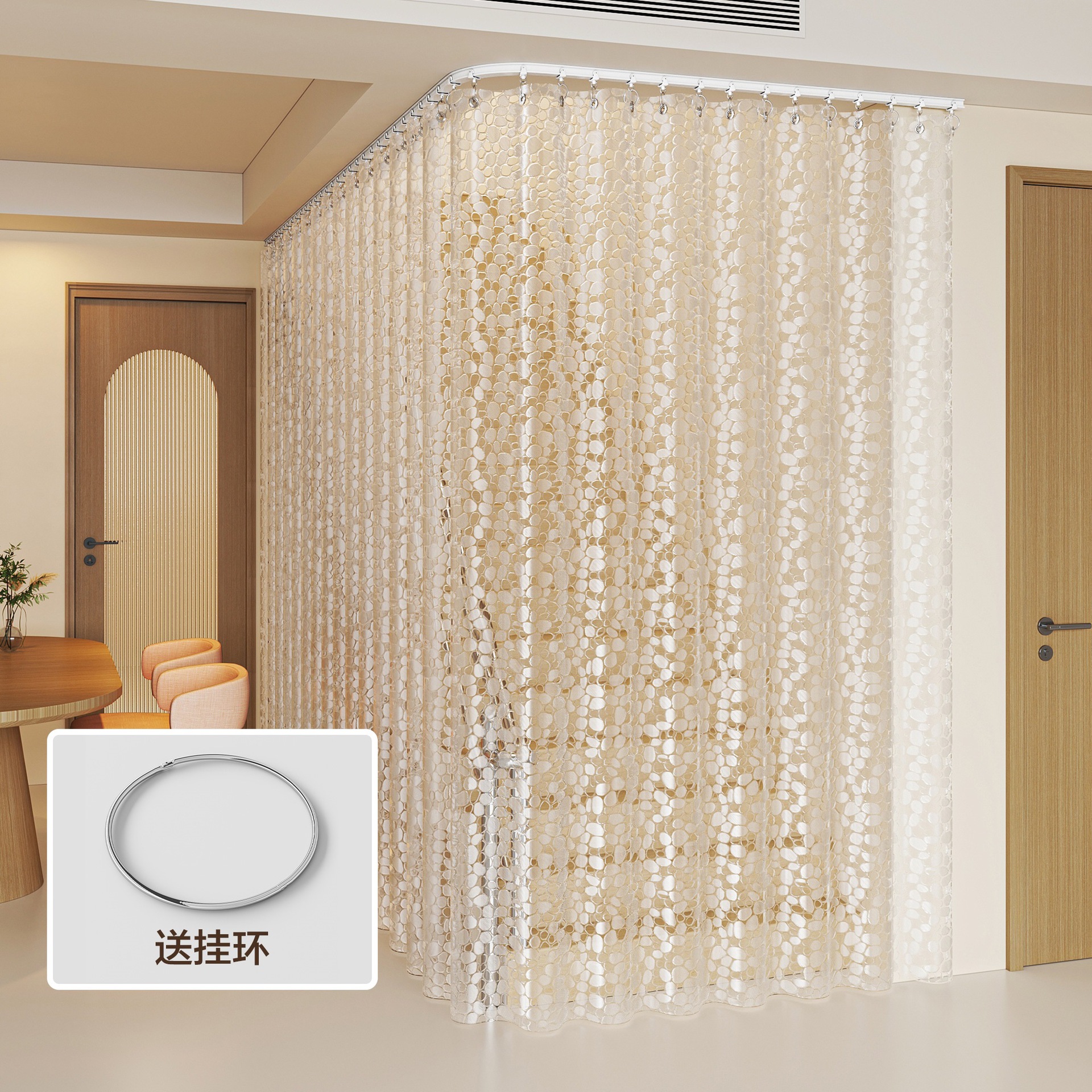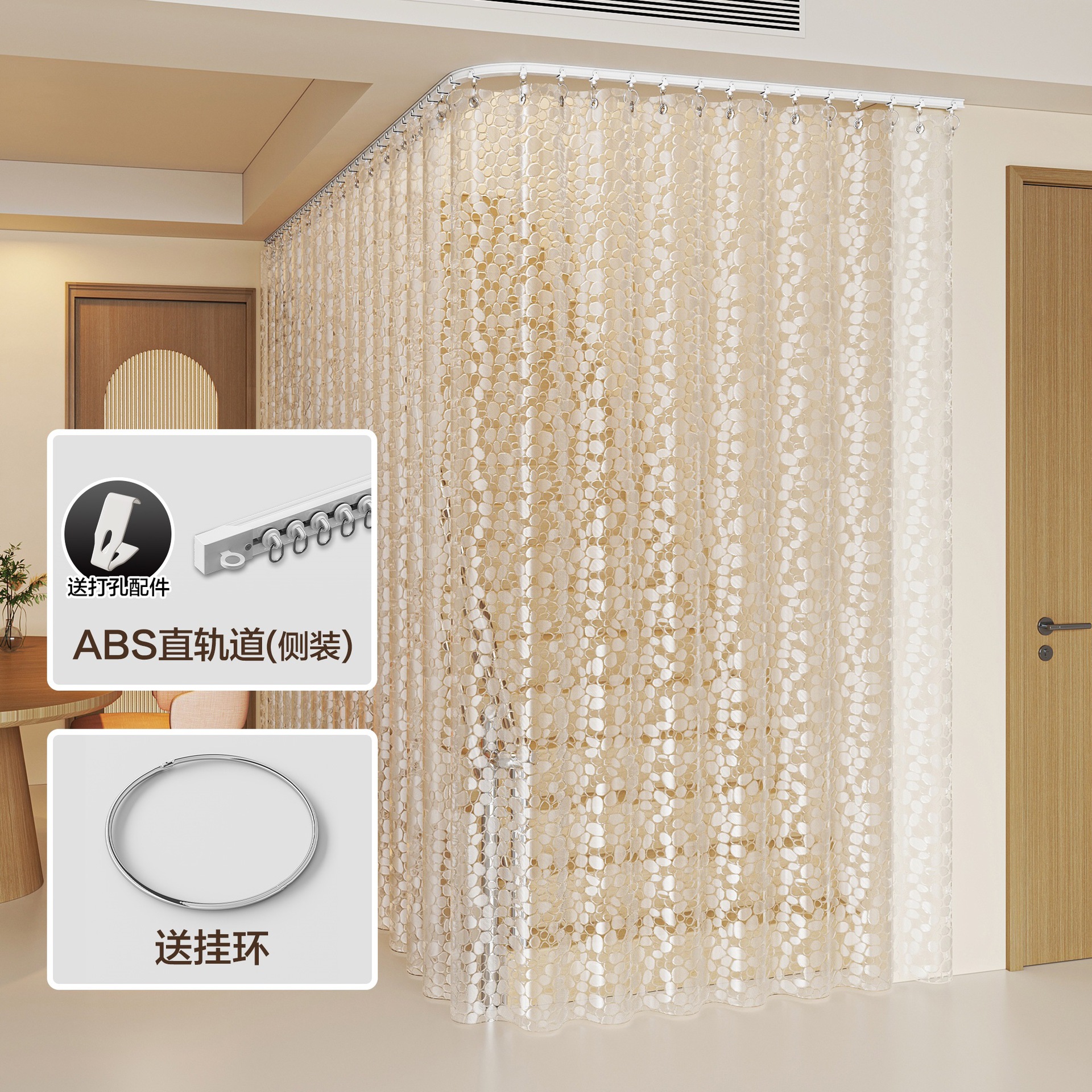 • [커튼 + 트랙] 두꺼운 레인플라워 스톤 + 금속 링 + 상단 장착형 구부릴 수 있는 트랙(원하는 대로 모양 조정 가능)(펀칭 겸용/펀칭 없음)