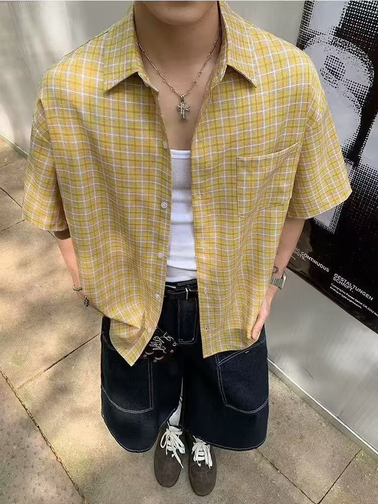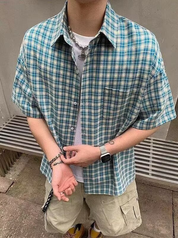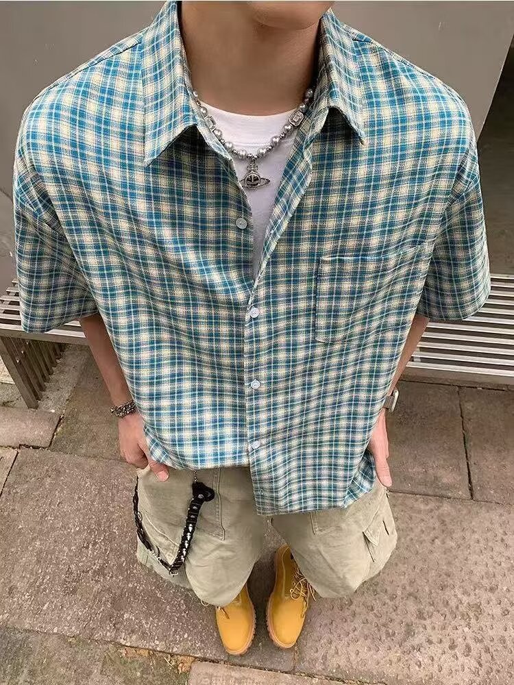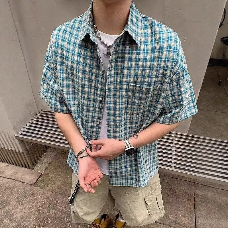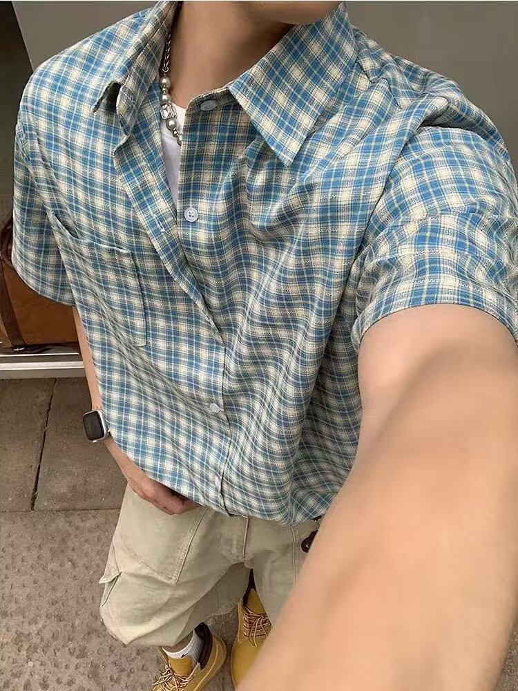아메리칸 레트로 체크 무늬 셔츠 반팔 남성 여름 트렌디 브랜드 얇은 루즈 통기성 시원한 옷깃 5부 소매 탑스토어 가기