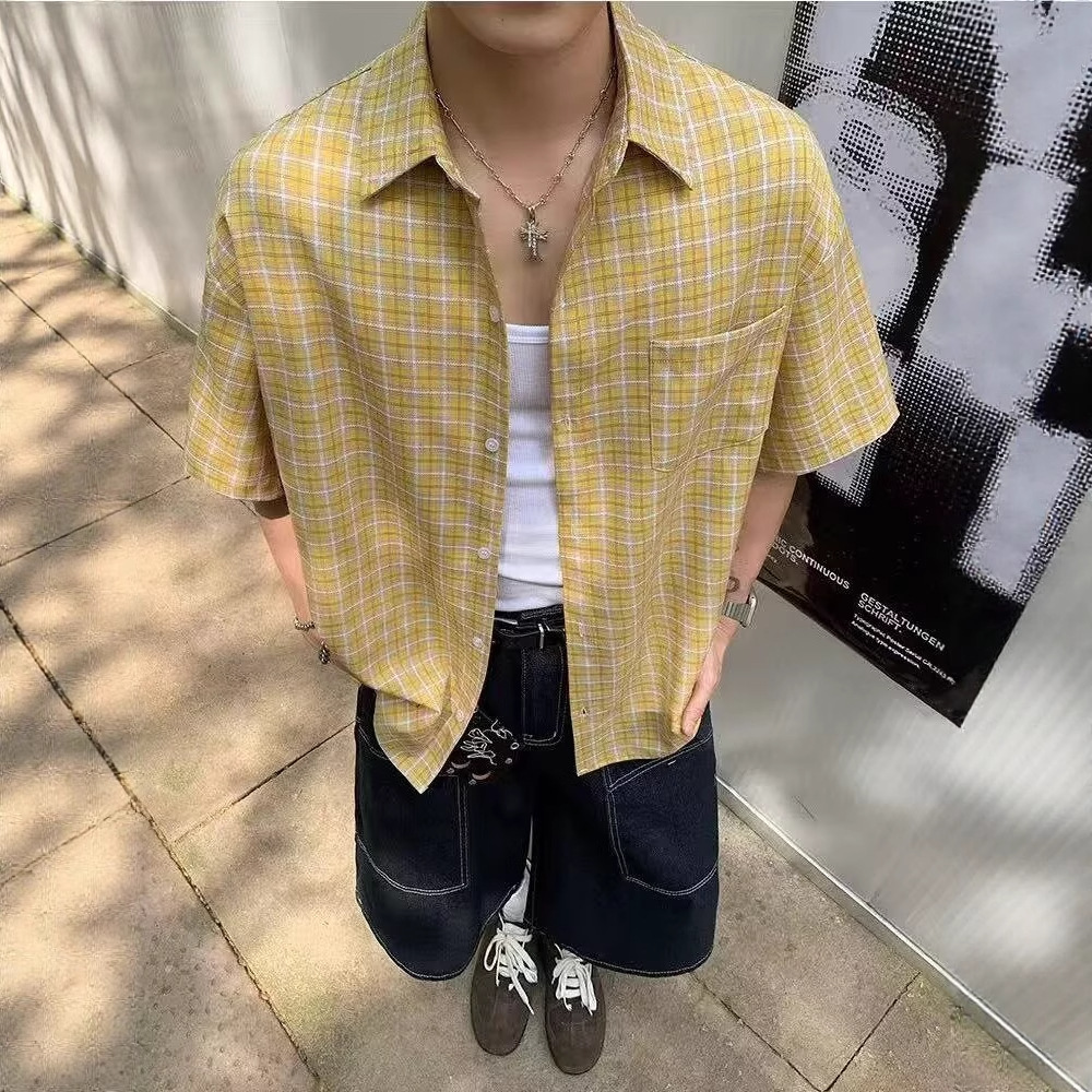 아메리칸 레트로 체크 무늬 셔츠 반팔 남성 여름 트렌디 브랜드 얇은 루즈 통기성 시원한 옷깃 5부 소매 탑