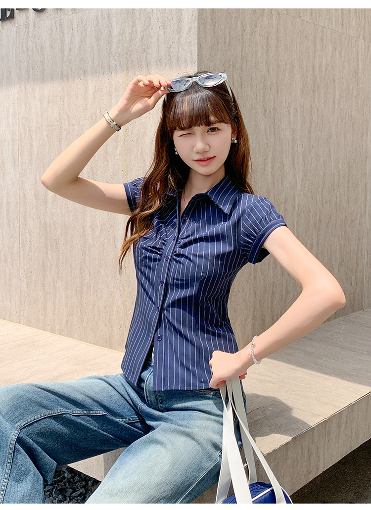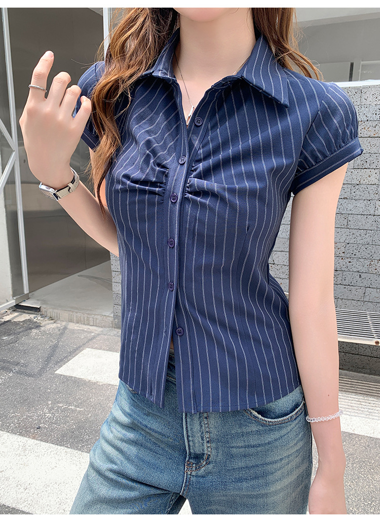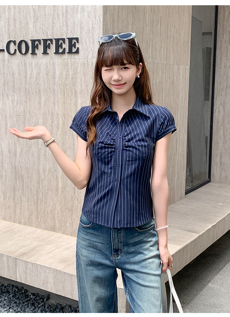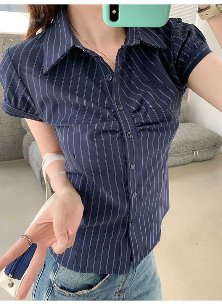 실제 사진 # 여성용 스트라이프 오른쪽 어깨 반팔 셔츠 2025 여름 디자인 주름 허리 슬리밍스토어 가기