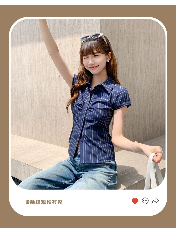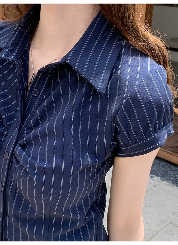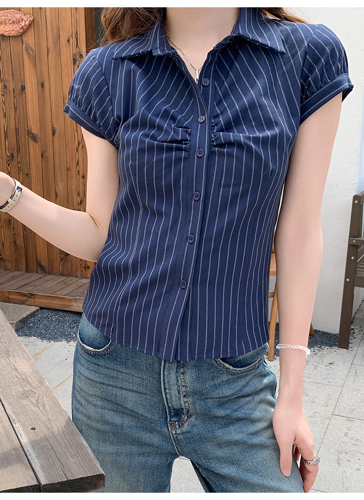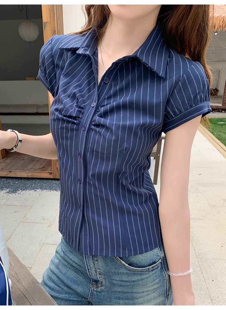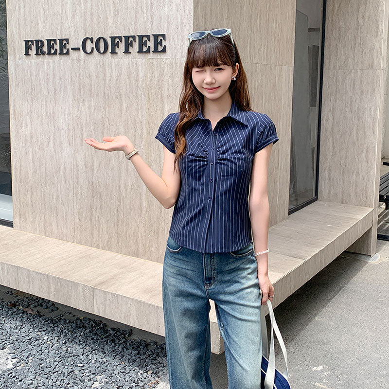 실제 사진 # 여성용 스트라이프 오른쪽 어깨 반팔 셔츠 2025 여름 디자인 주름 허리 슬리밍스토어 가기