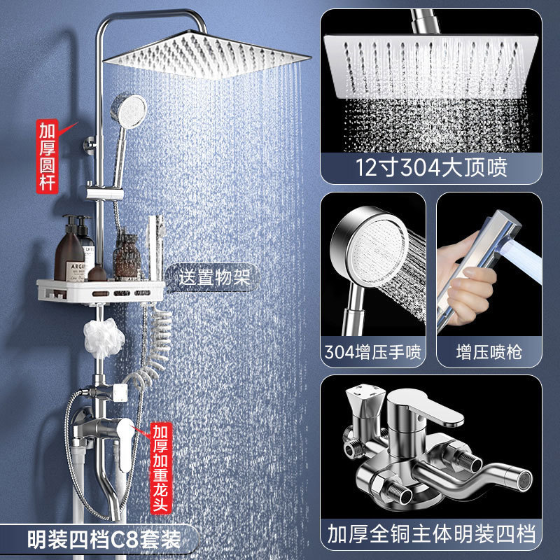 • C8 표면 장착형 3기능 두꺼운 구리 수도꼭지 × 12inch 스테인레스 스틸 304 슈퍼차지 핸드 탑 스프레이