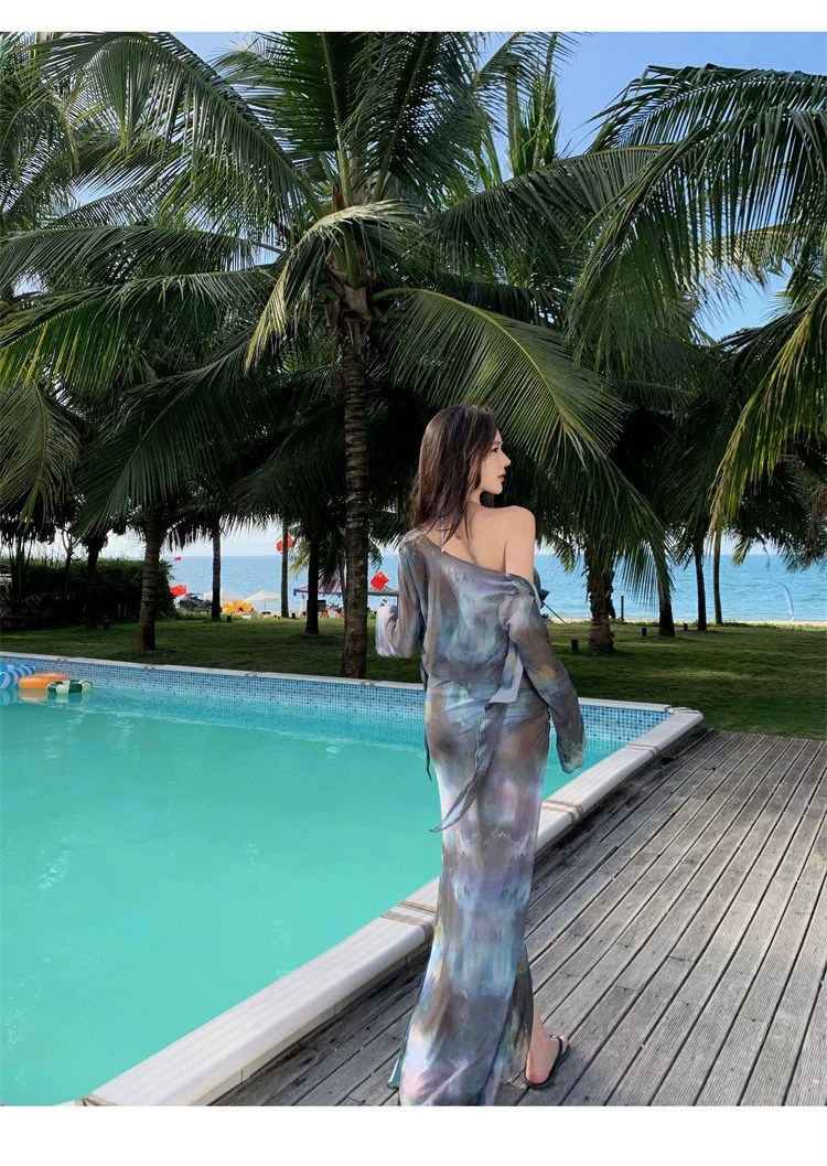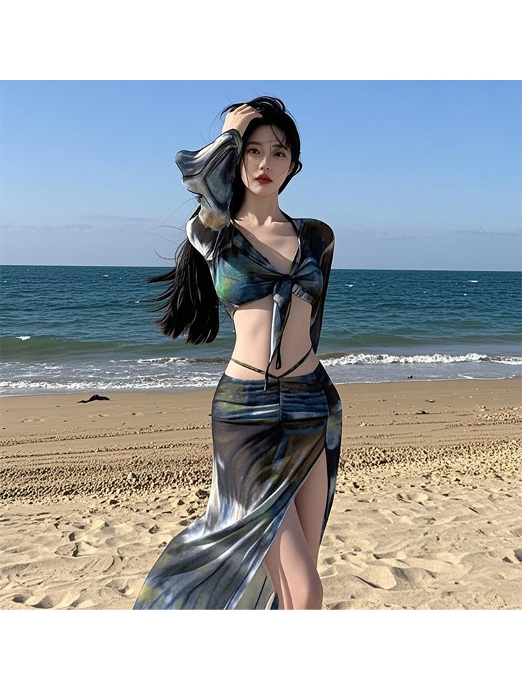비키니 수영복 여성용 긴팔 스커트 스플릿 4피스 세트 패셔너블한 타이다이 자외선 차단 섹시 볼리시 7095