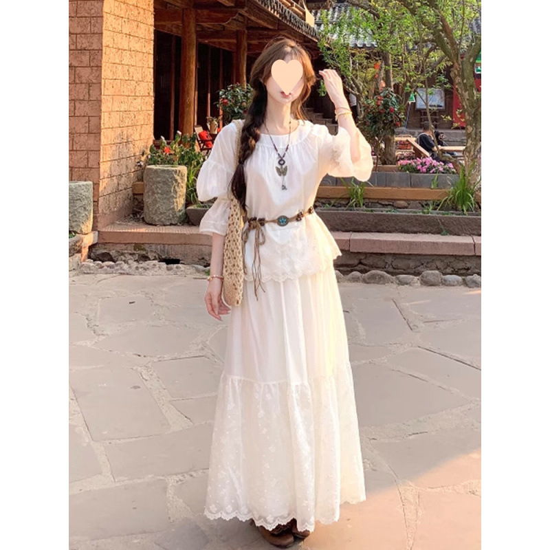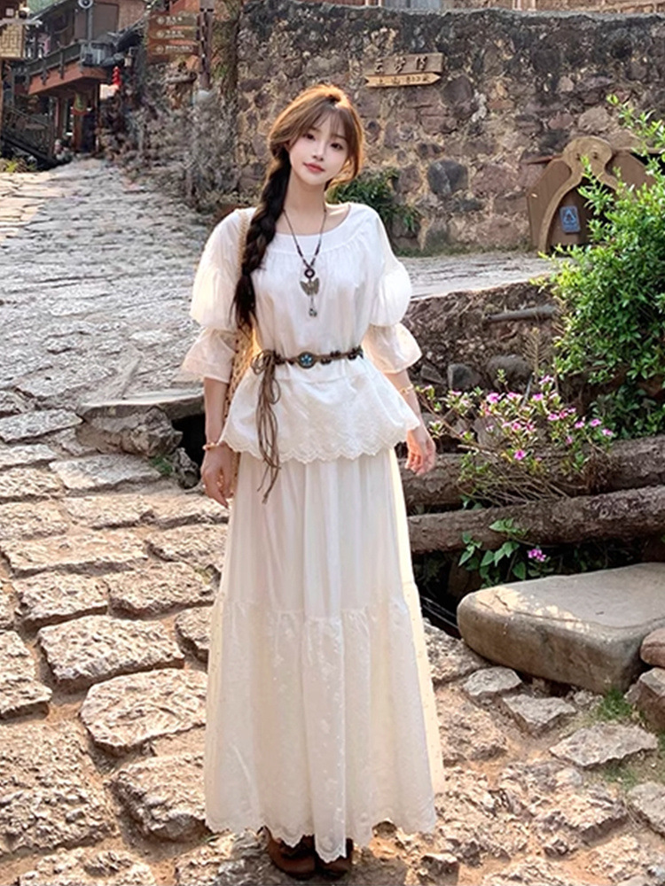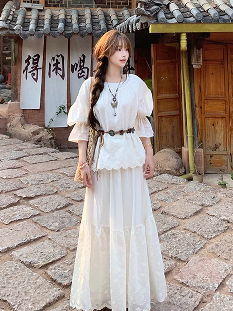 랜턴 슬리브 탑 + 빅 스커트 스커트 세트 여름 신작 화이트 달빛 리조트 스타일 세트