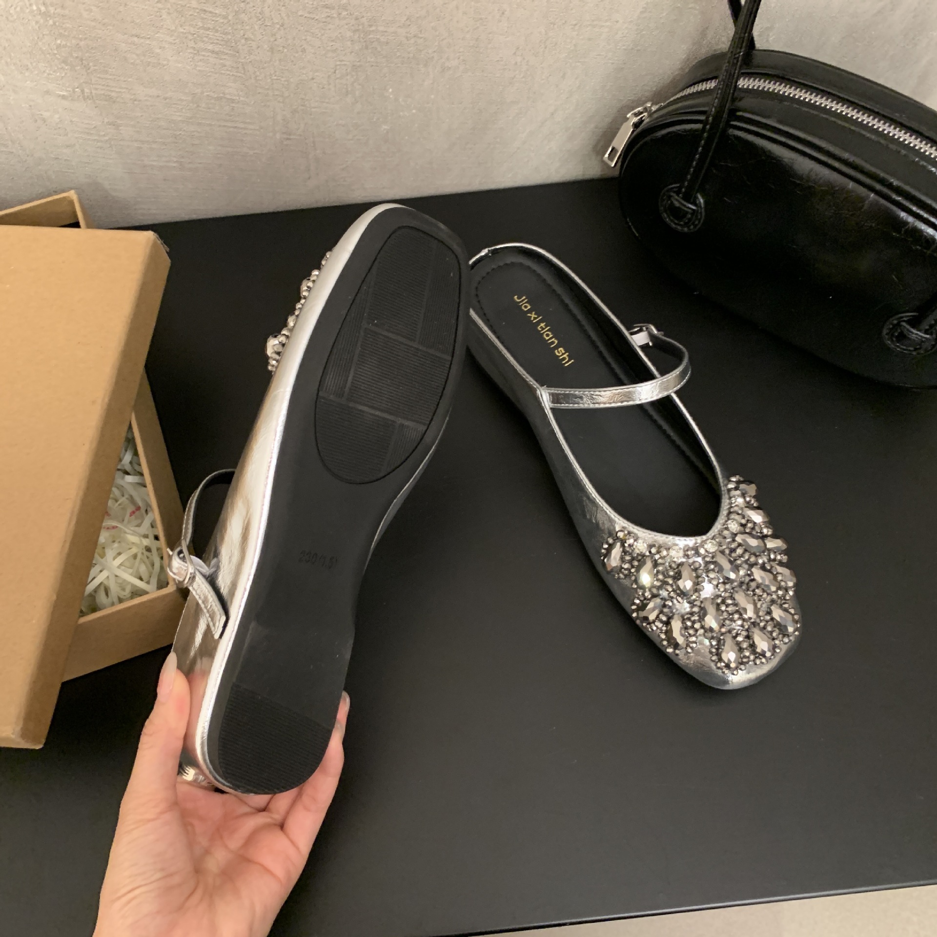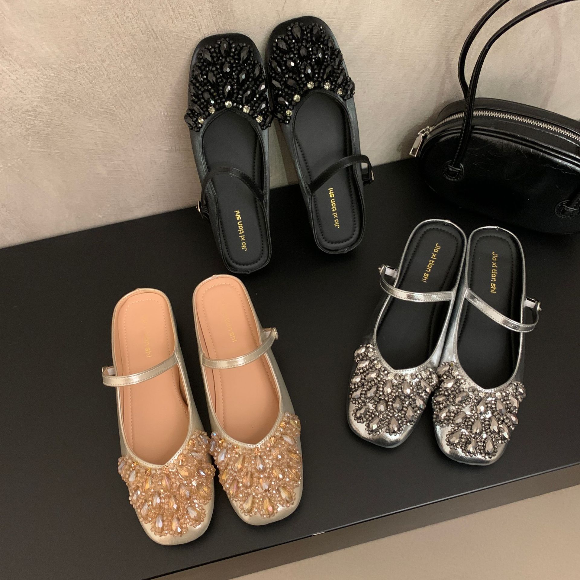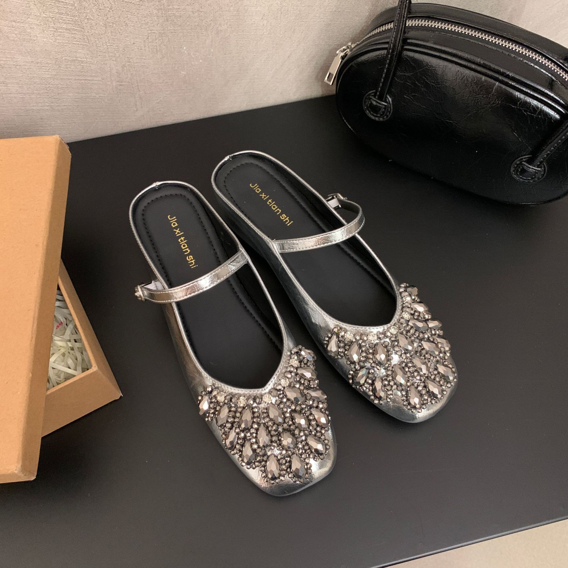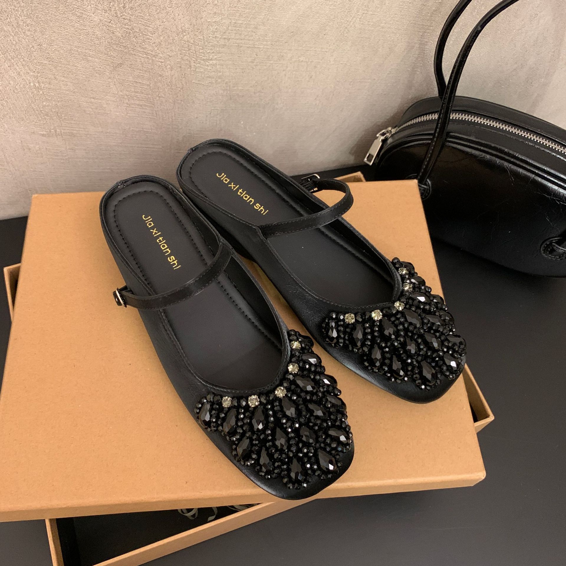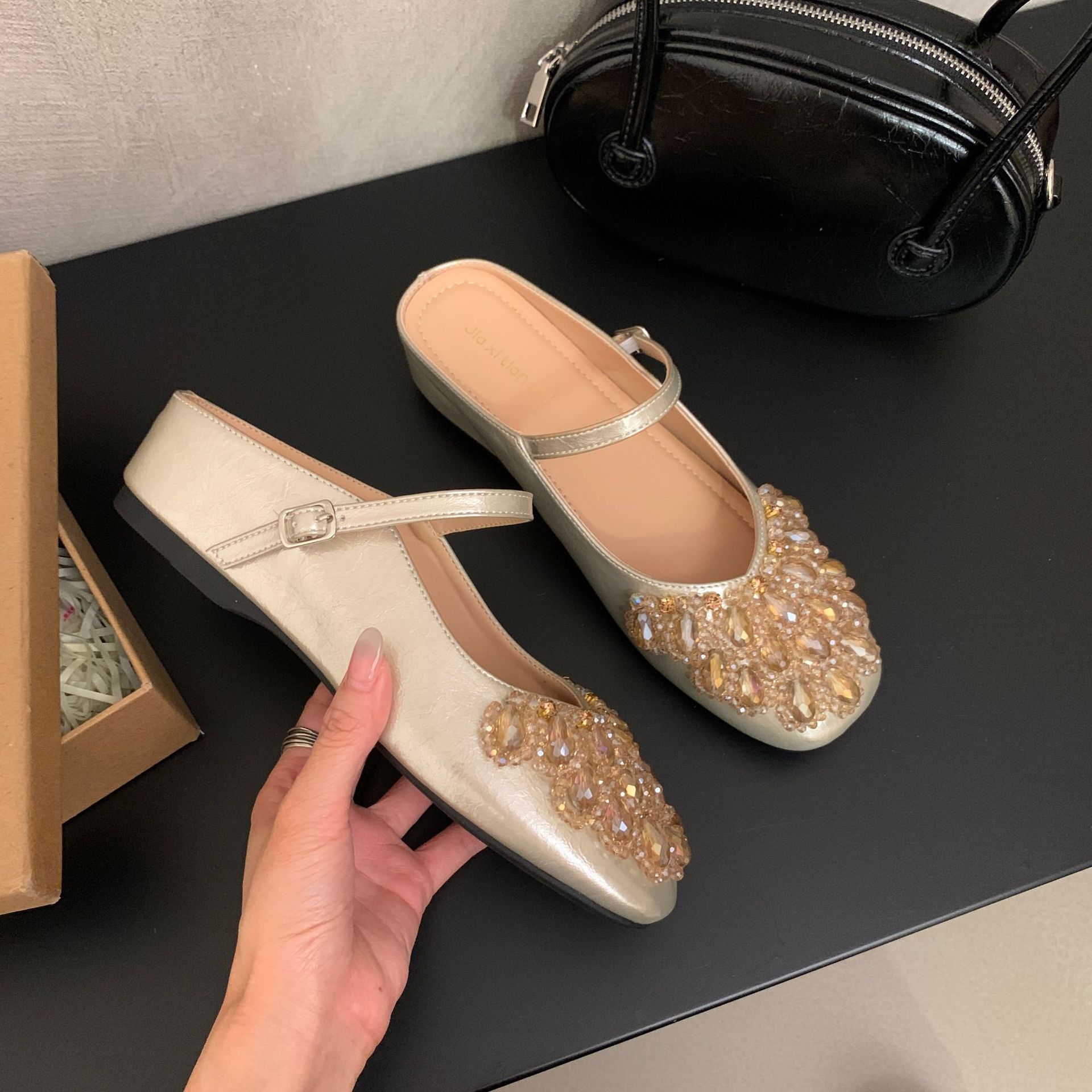 여성을위한 바오 터우 샌들 2025 여름 새로운 스타일 요정 스타일 패션 라인 석 버클 플랫 바닥 얕은 입 내부 높이 증가 신발