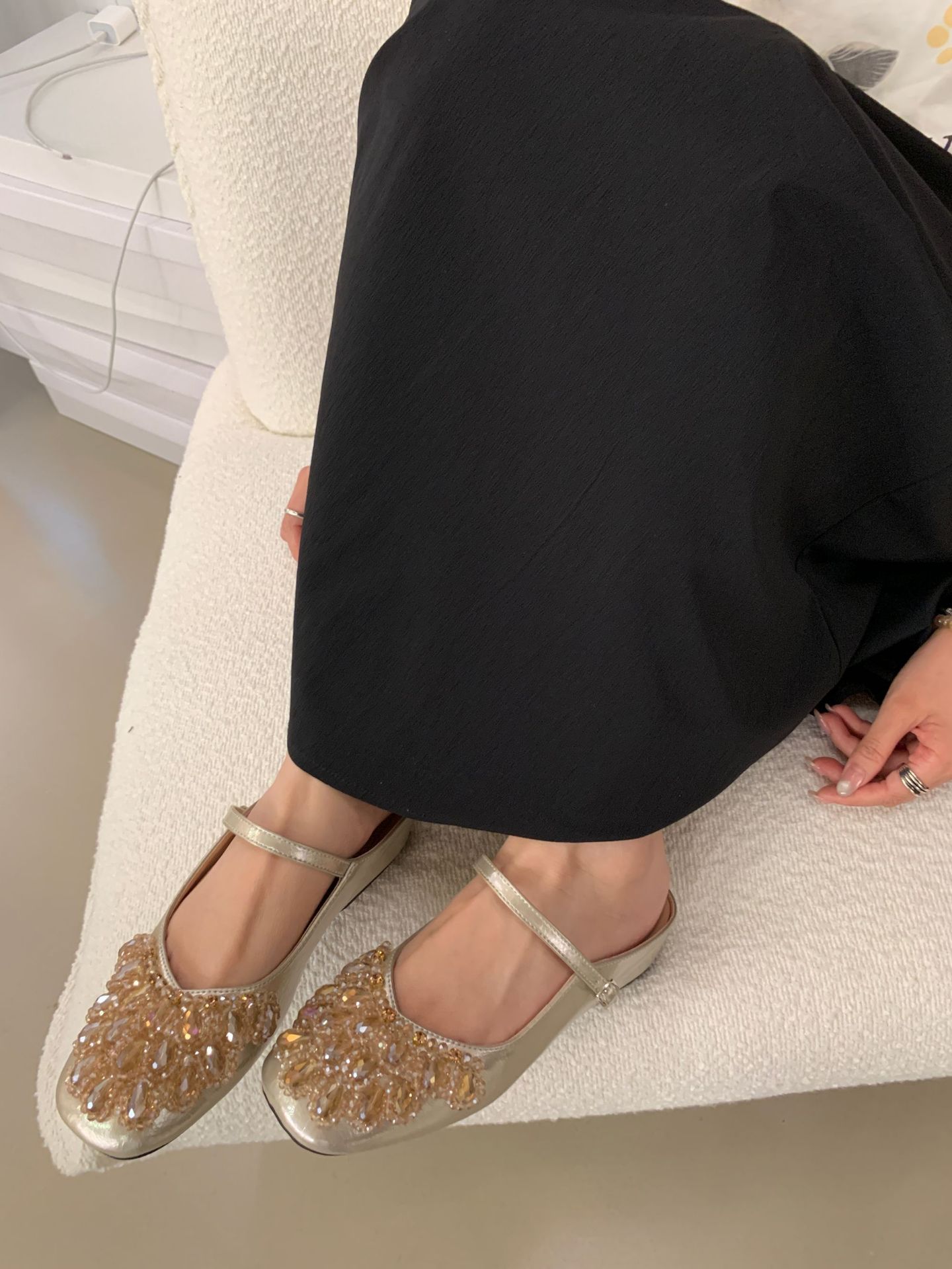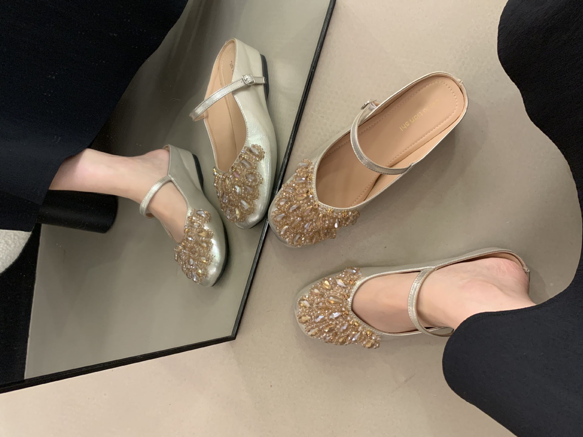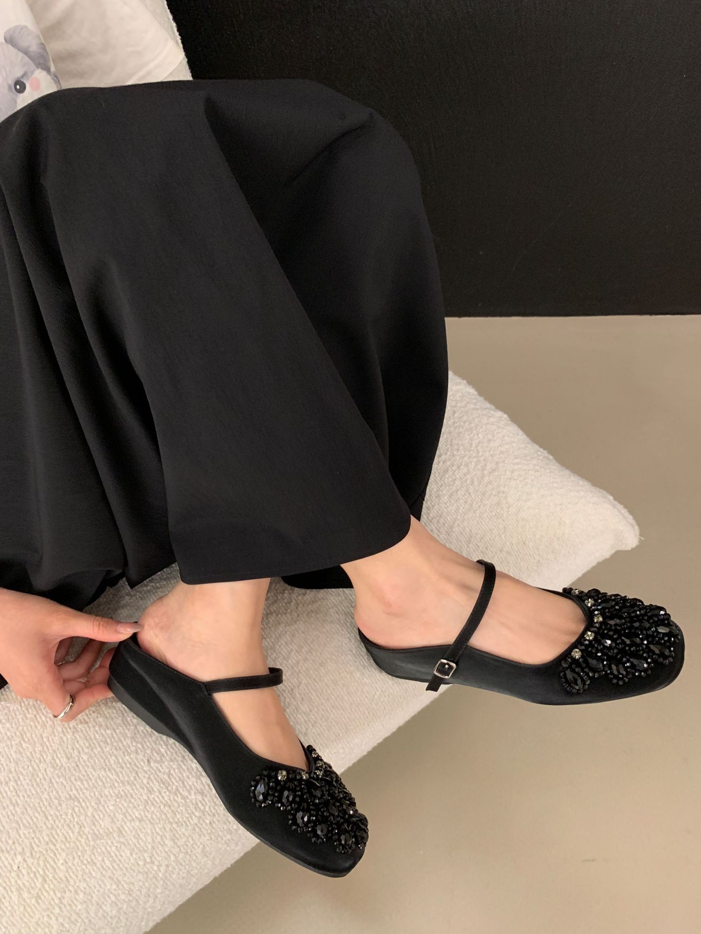 여성을위한 바오 터우 샌들 2025 여름 새로운 스타일 요정 스타일 패션 라인 석 버클 플랫 바닥 얕은 입 내부 높이 증가 신발스토어 가기