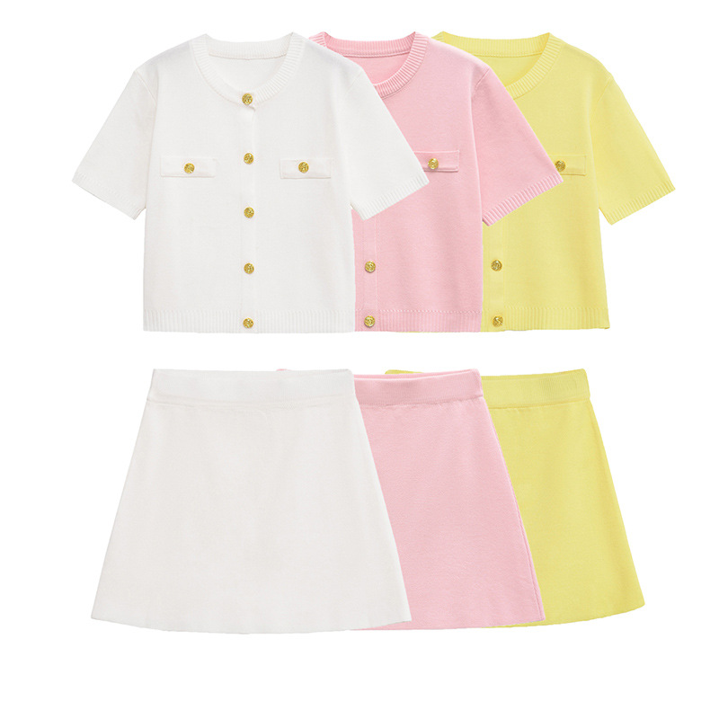 2025 봄 여름 새로운 유럽과 미국 스타일의 여성 라운드 넥 흰색 꽃 단추 니트 재킷과 짧은 치마 5536031