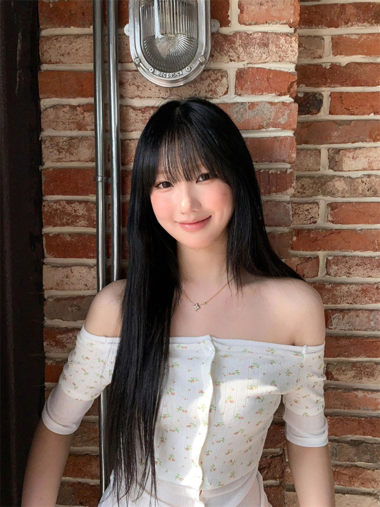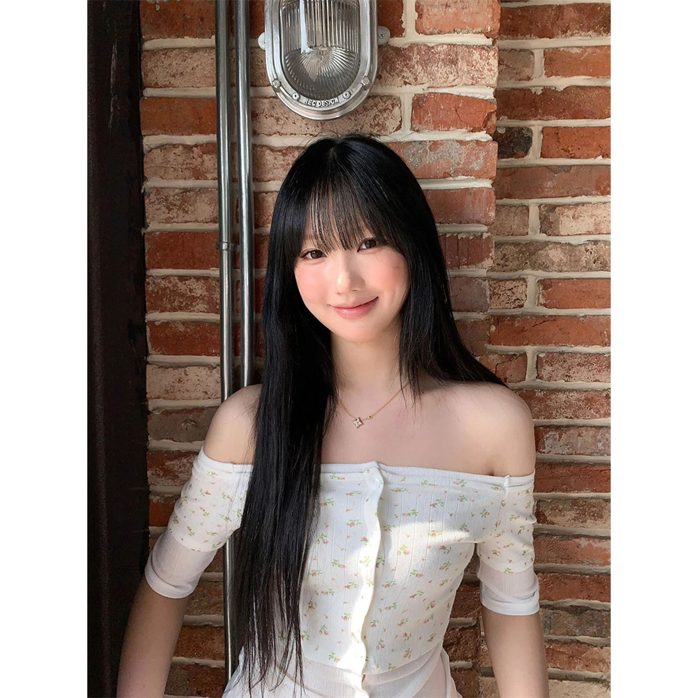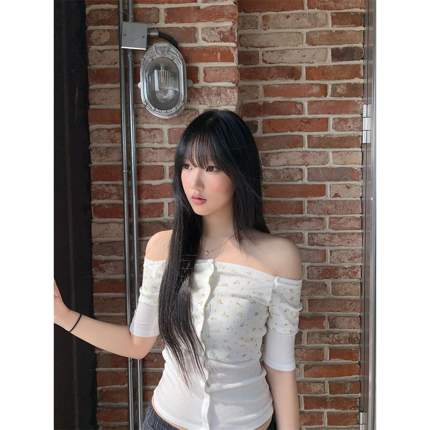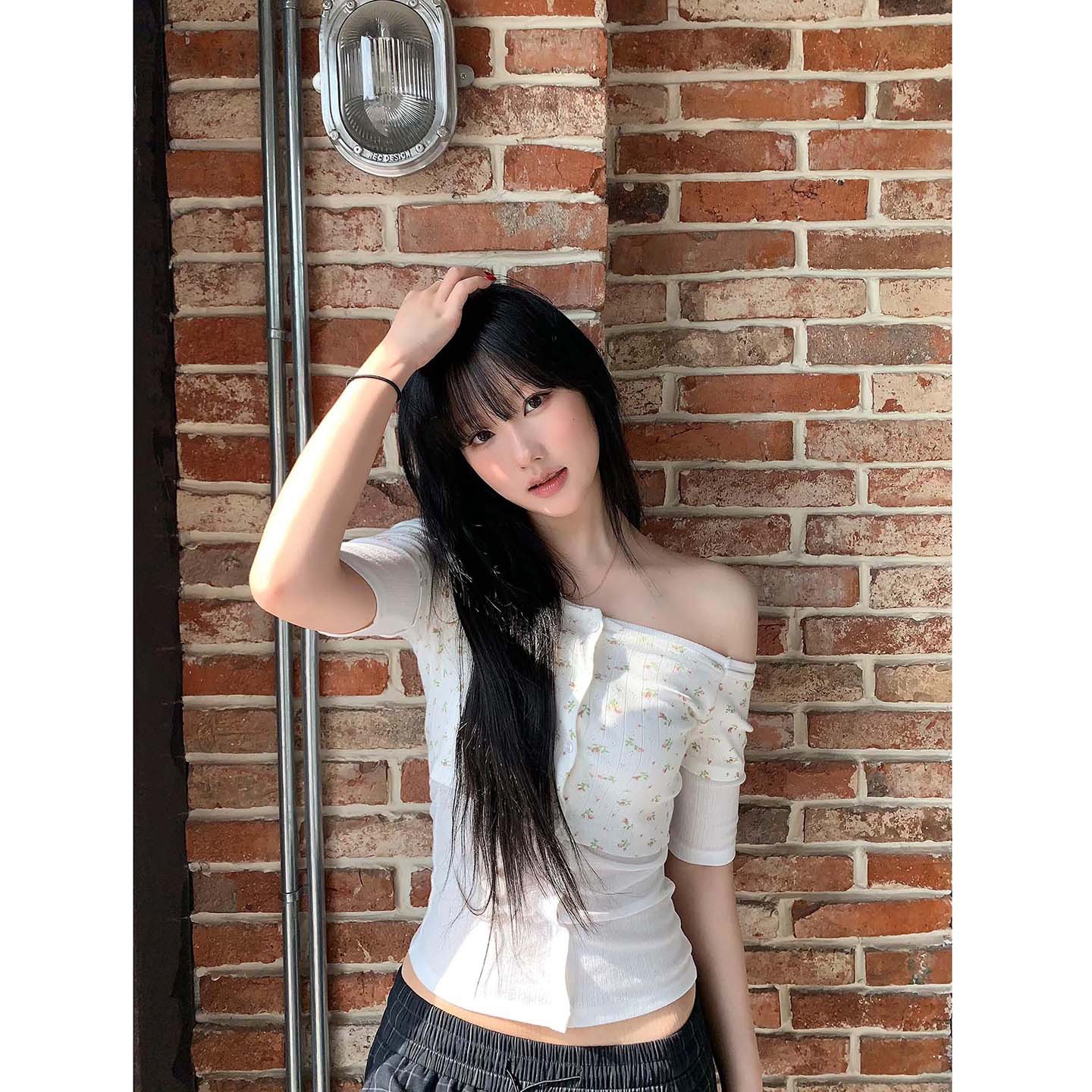MR [Meiling Jacquard] 여름에 입기 좋은 여성용 아메리칸 스몰 플로럴 스플라이스 페이크 투피스 원숄더 티셔츠